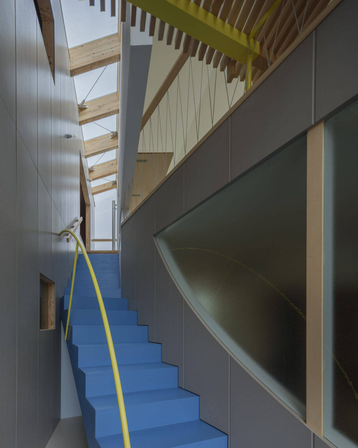 間口の狭い箱型のボリューム(東側)と切妻屋根のかかる小さな小屋(西側)によって吹き抜けの階段室を挟みこむ構成となっている。子世帯(2階)の大きな玄関でもある階段室に設けた型板ガラスの大きな円弧窓は、1階の親世帯と気配によって柔らかく繋がる装置でもある。
