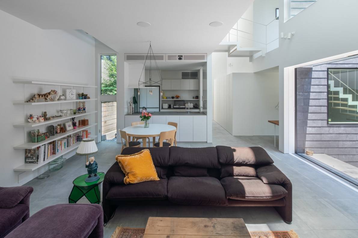 周囲に住宅が建て迫り、微地形のあるこの敷地に、光や風、風景を取り込むとともに、家族の領域や距離感を選択できる心地よい住まいを目指した。