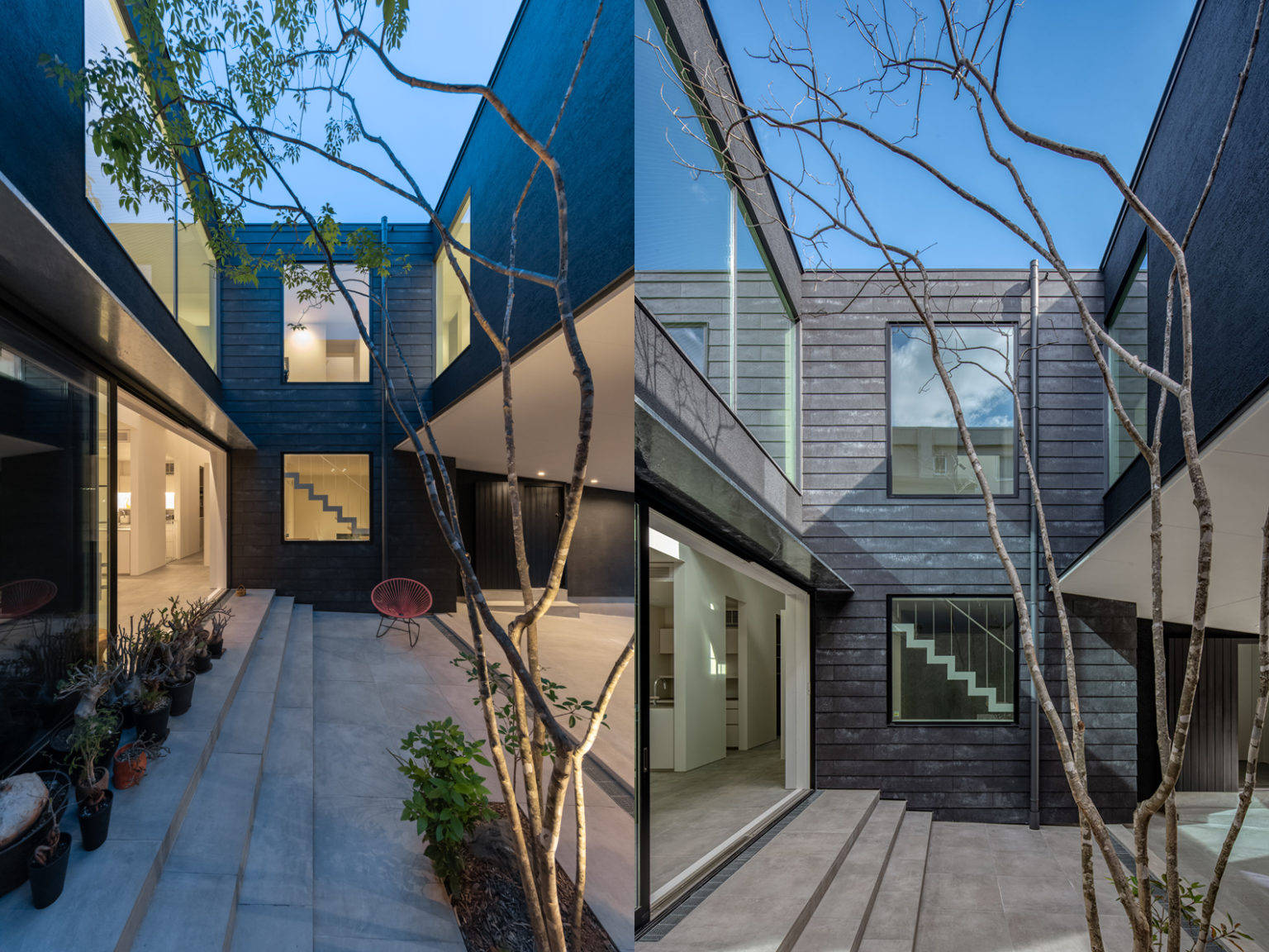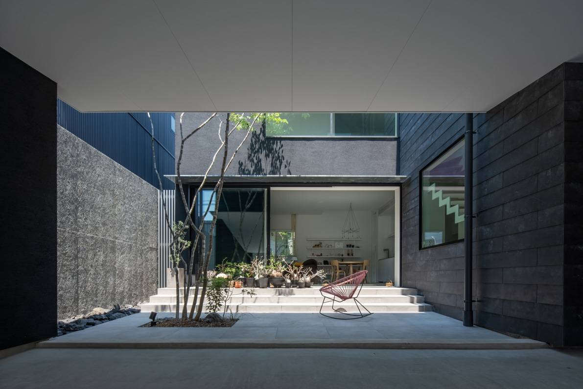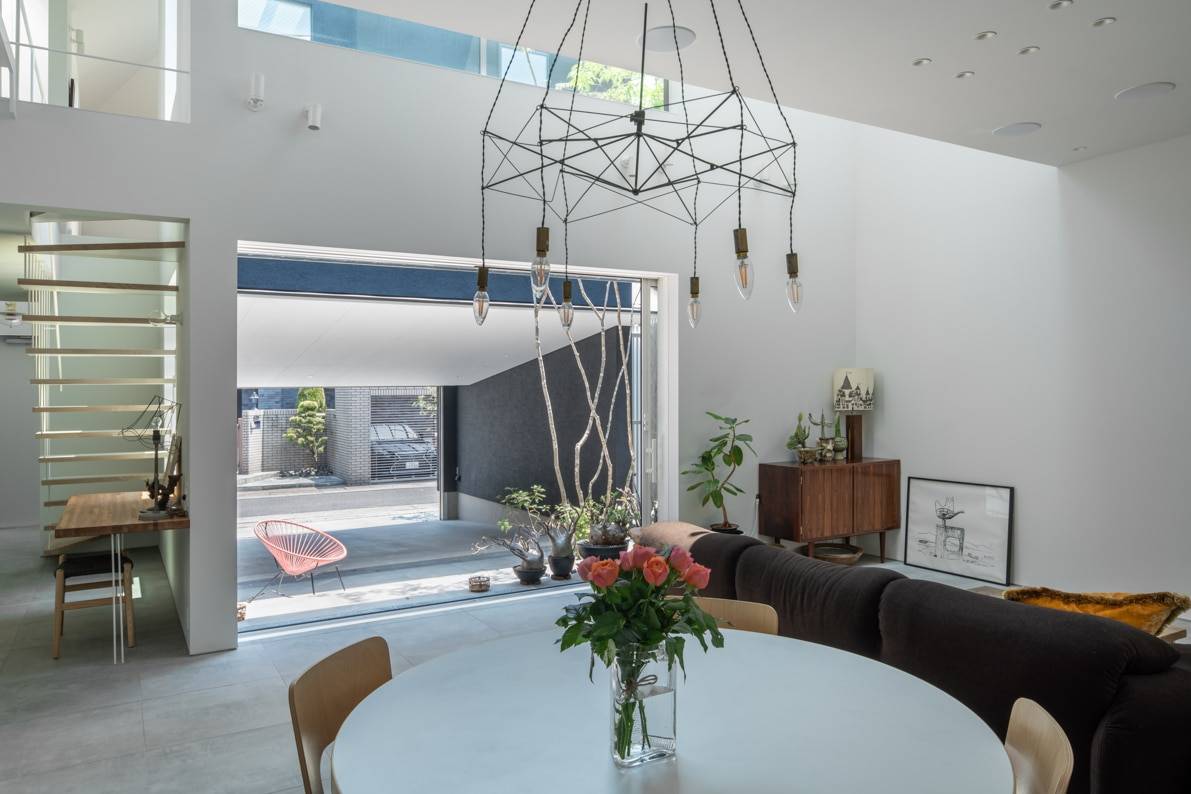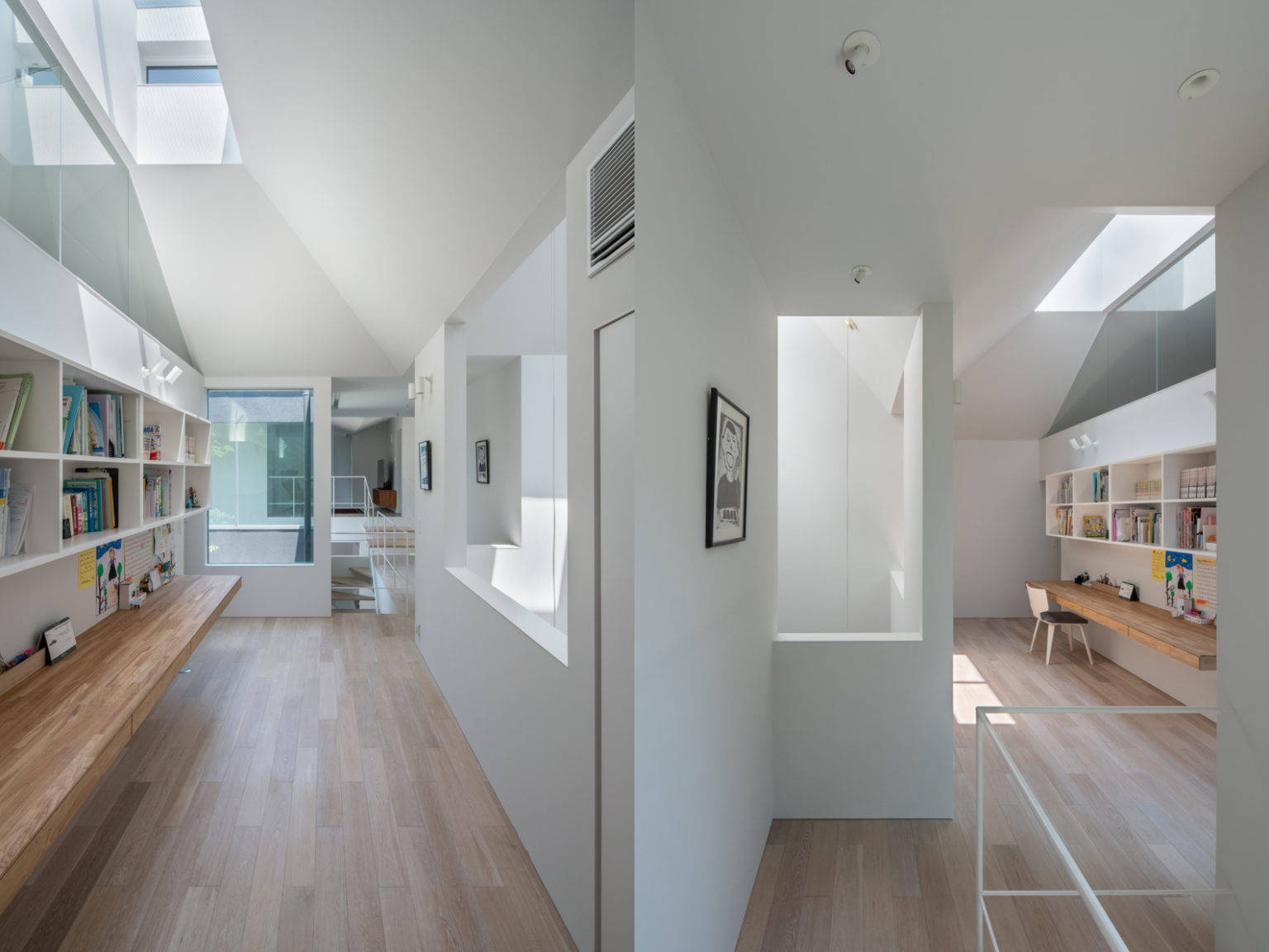 名古屋市の東部に位置する4人家族のための住宅である。準防火地域に指定され、周辺には中低層の住居が密集し、背後には小高い丘がある。その裾野にあたる敷地には、道路レベルから一段高く造成された微地形が存在していた。一段高くといっても、眺望を獲得できるような高低差ではなく、膝丈程で背後に広がる丘の始まりを控えめに主張している。