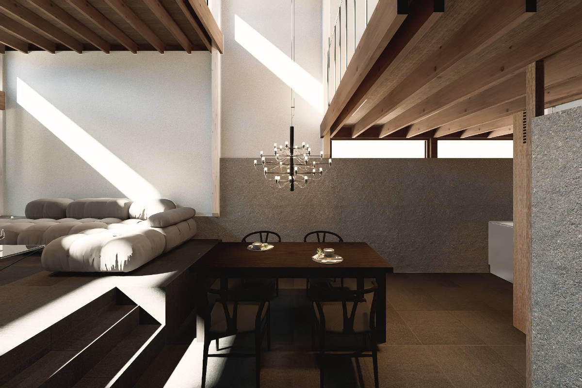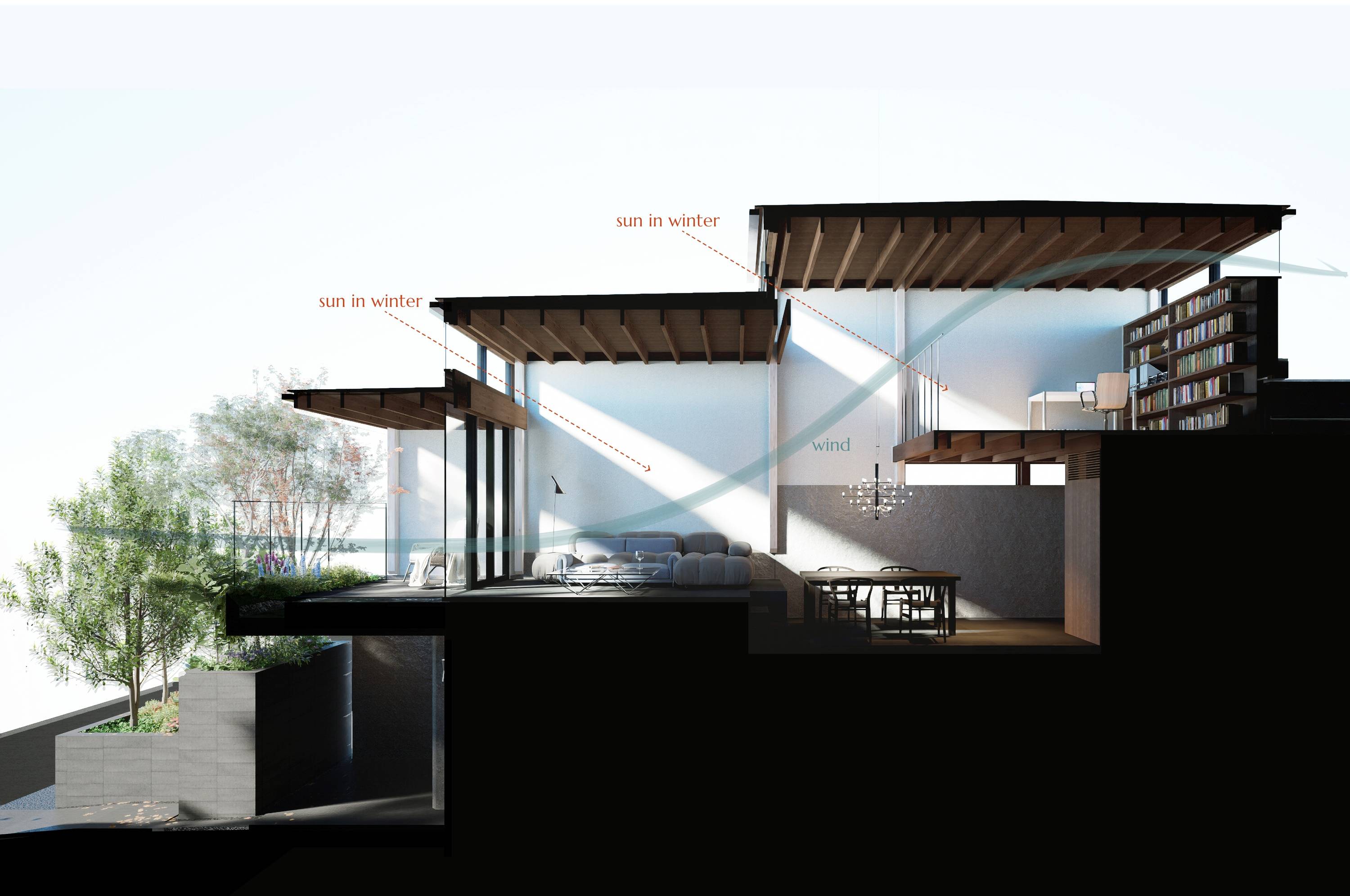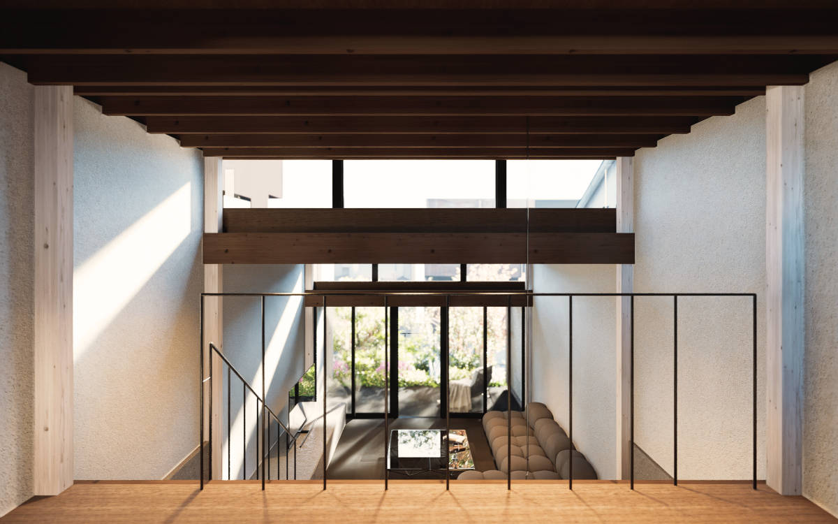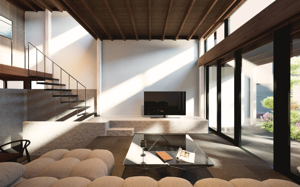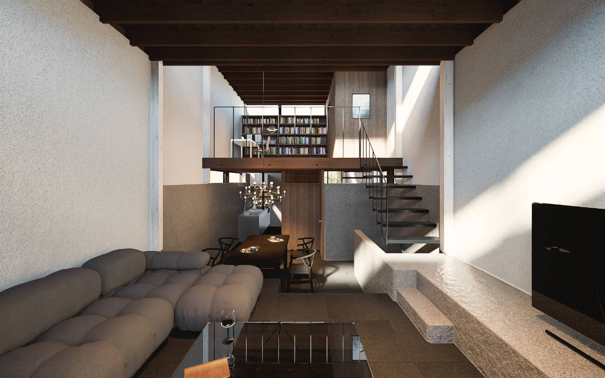 周囲の地形と敷地の条件を精緻に読み解いた「谷」から「丘」へと続く空間の流れを通じて、土地に根付いた感覚を持てる暮らしを目指しています。