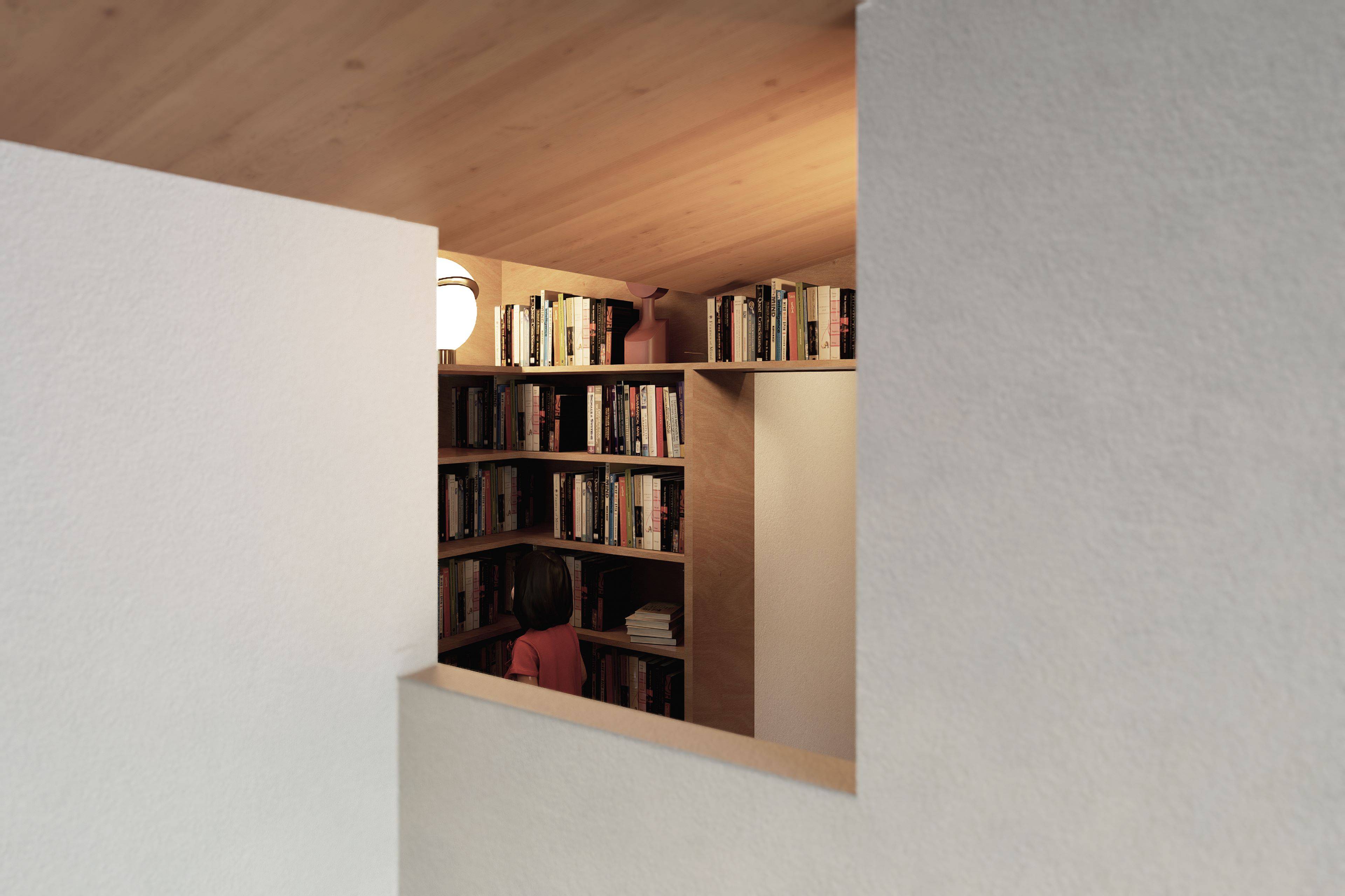 吹抜け上の小窓の先には書庫があります。広く開放感がある空間と、小さく濃密な空間を隣合わせに配置しました。書庫には開閉可能な窓を設けることで重力換気が促され、軽井沢の冷涼な気候を感じる風の流れを家の中に作ります。