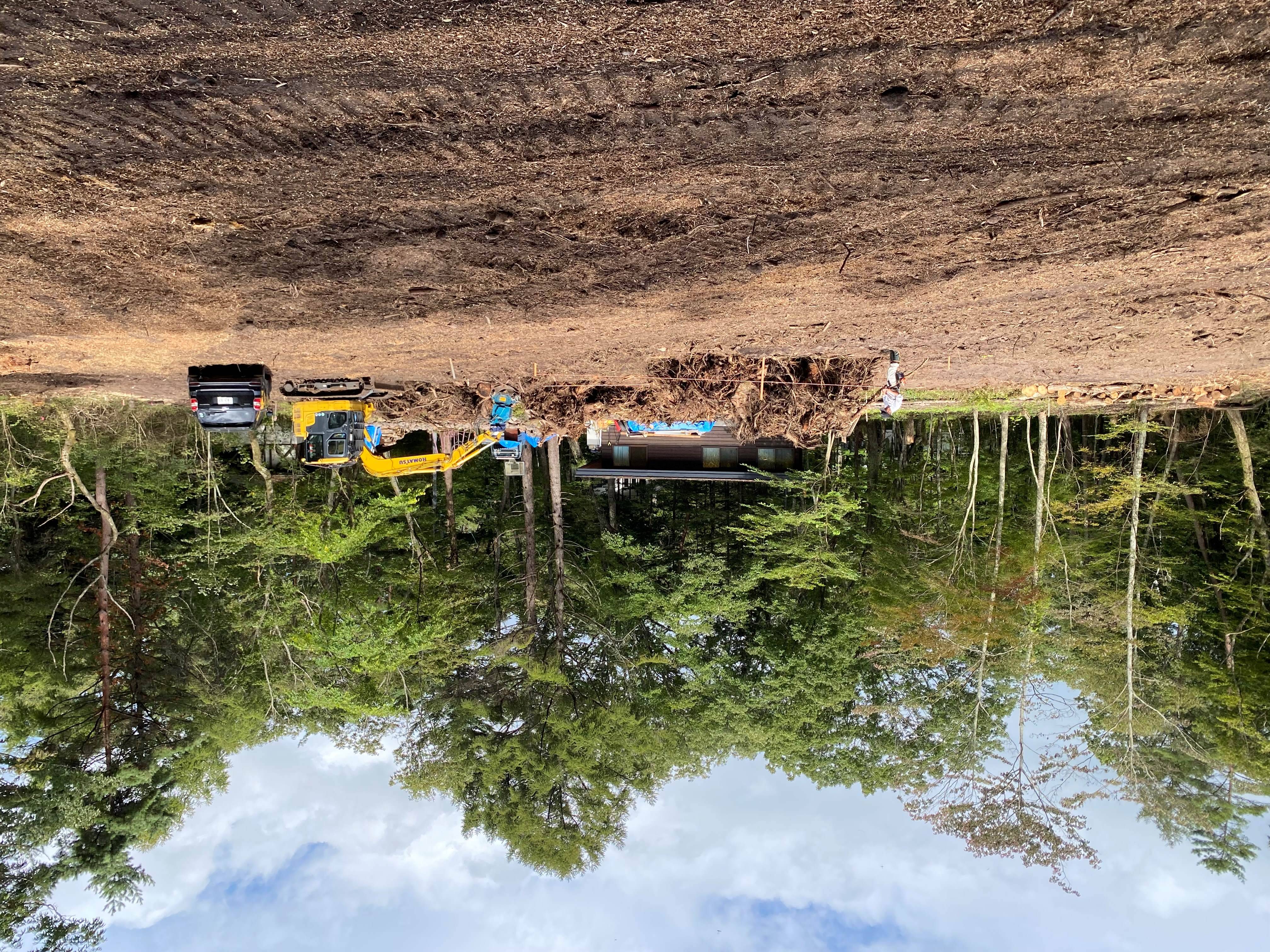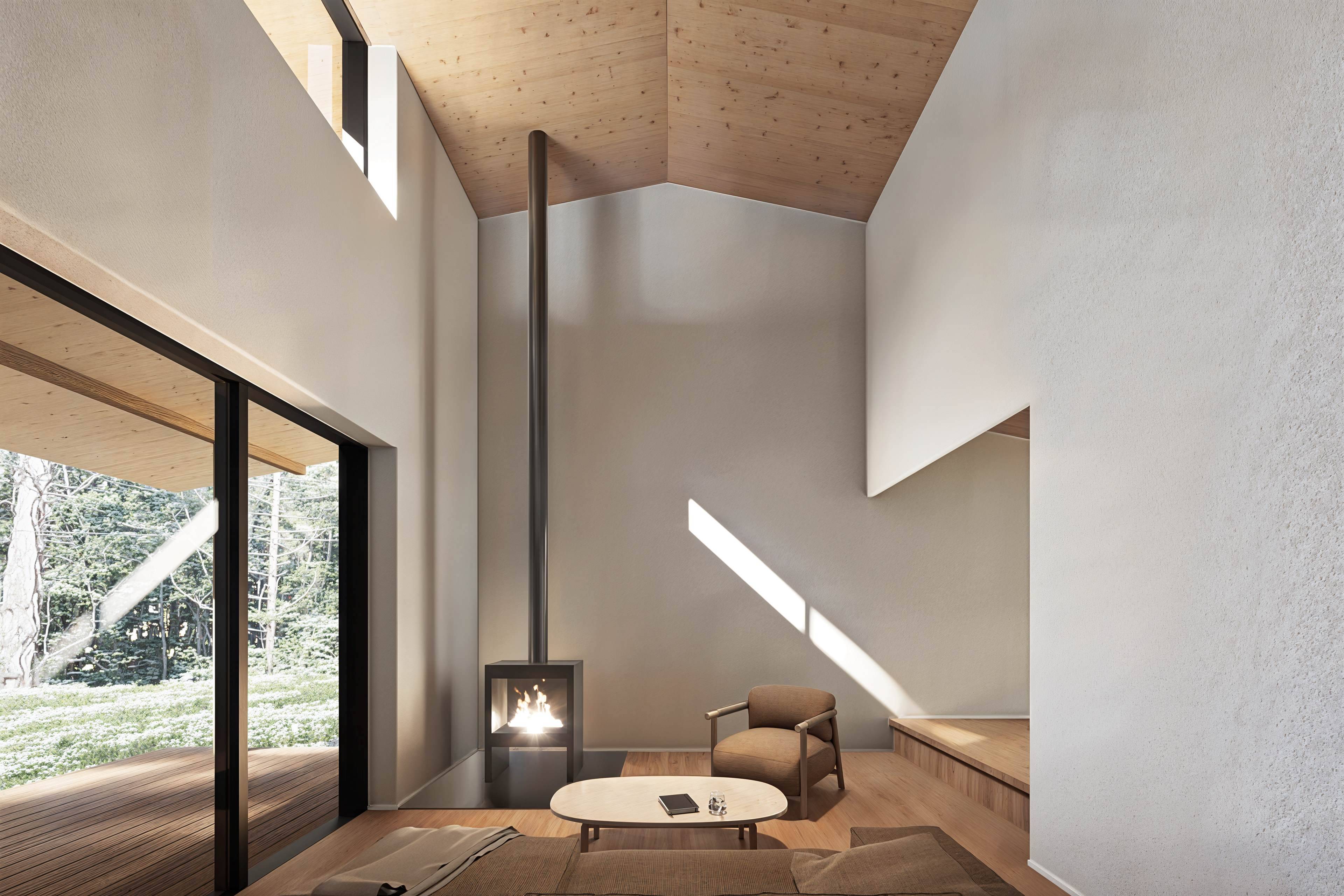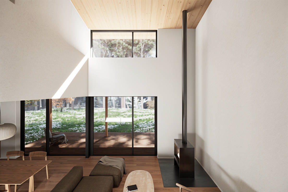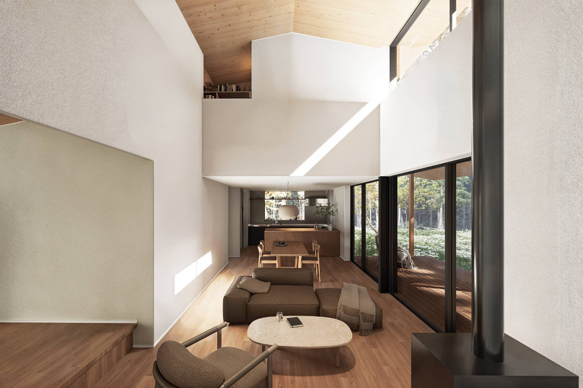 南面には、大きく開けた森の中の広場に向けて屋根付きのデッキを設け、デッキにより遮られる南面の日射は、吹抜けを作り、上部から採光する計画としています。吹抜けの西面は二層分の漆喰の壁面に薪ストーブを象徴的に配置。シンメトリーな切妻の勾配天井が、森の中の拠り所となる秩序を与えます。