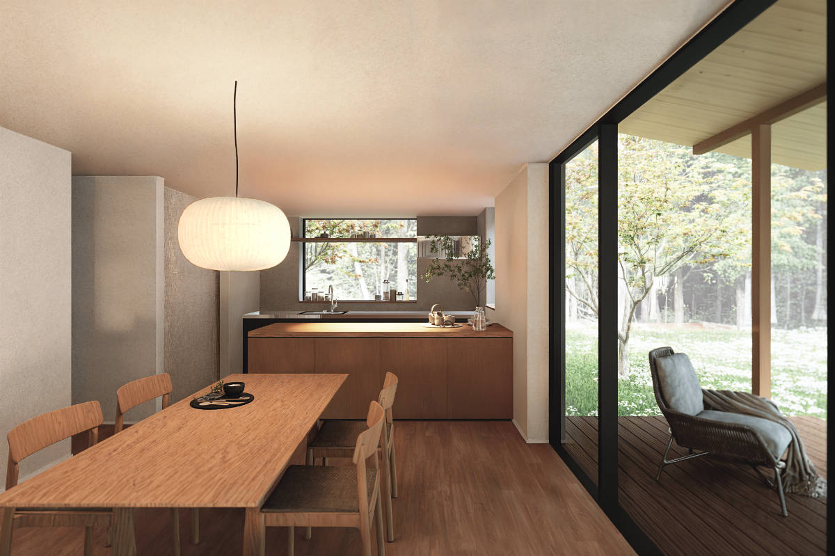 キッチンとダイニングは、天井を貼ってほどよい落ち着きを作りつつ、窓の高さを天井に合わせることで、外部とのつながりを感じられる設計としています。キッチンには二面に窓を設けており、柔らかな光と奥の森への眺めを楽しみながら料理を作ることができます。