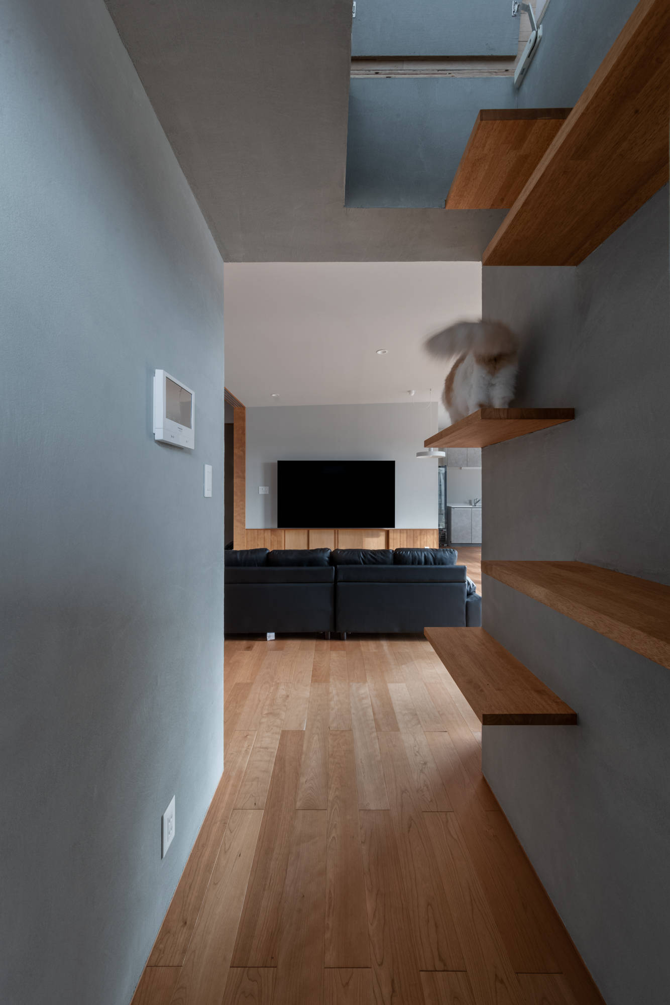 平日には居間はほどんど使用しないので不要な空間と考え、玄関からつながる廊下を介して寝室に直行できる平面プランとし、主に「廊下」「寝室」「シャワースペース」を選択できるようにした。