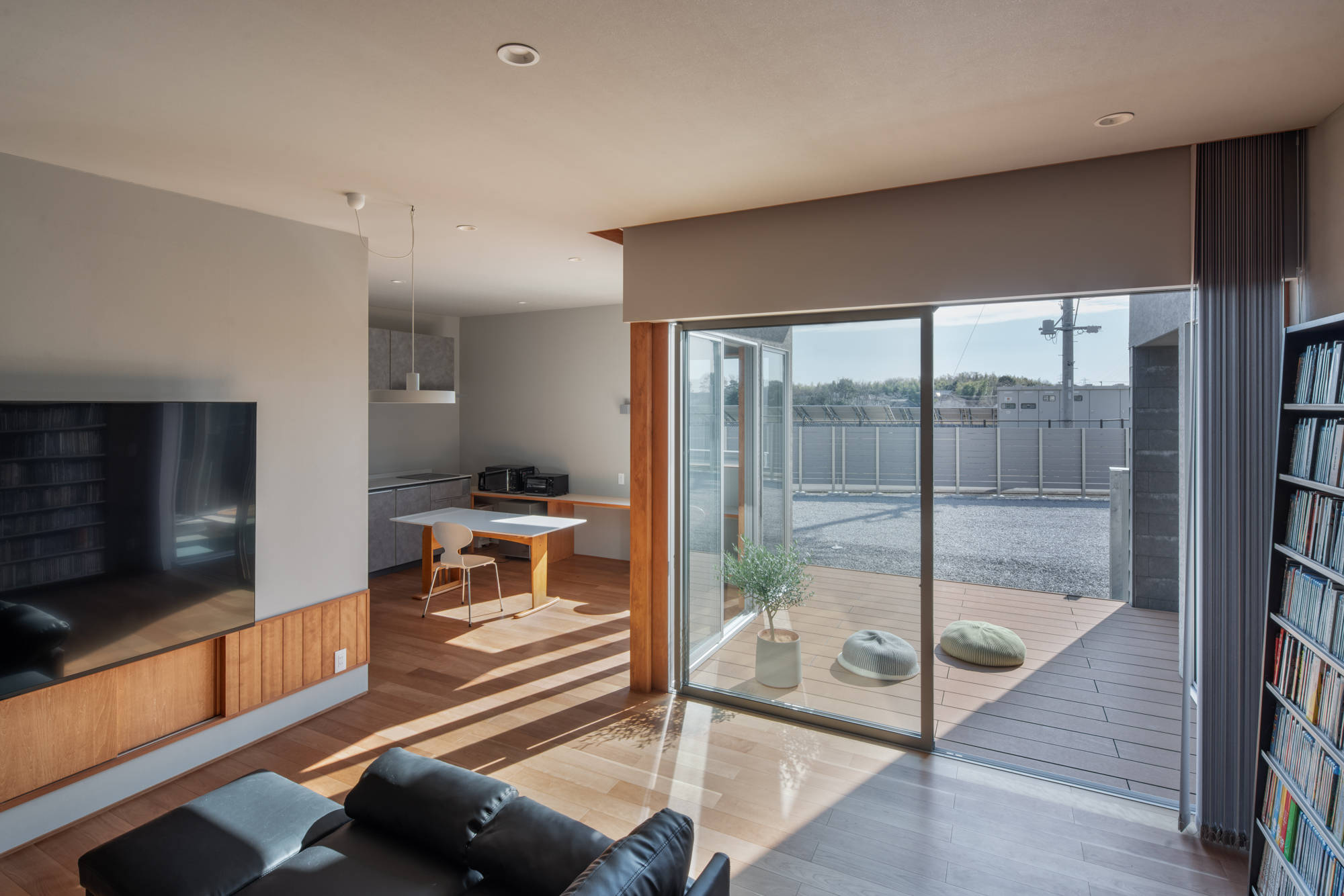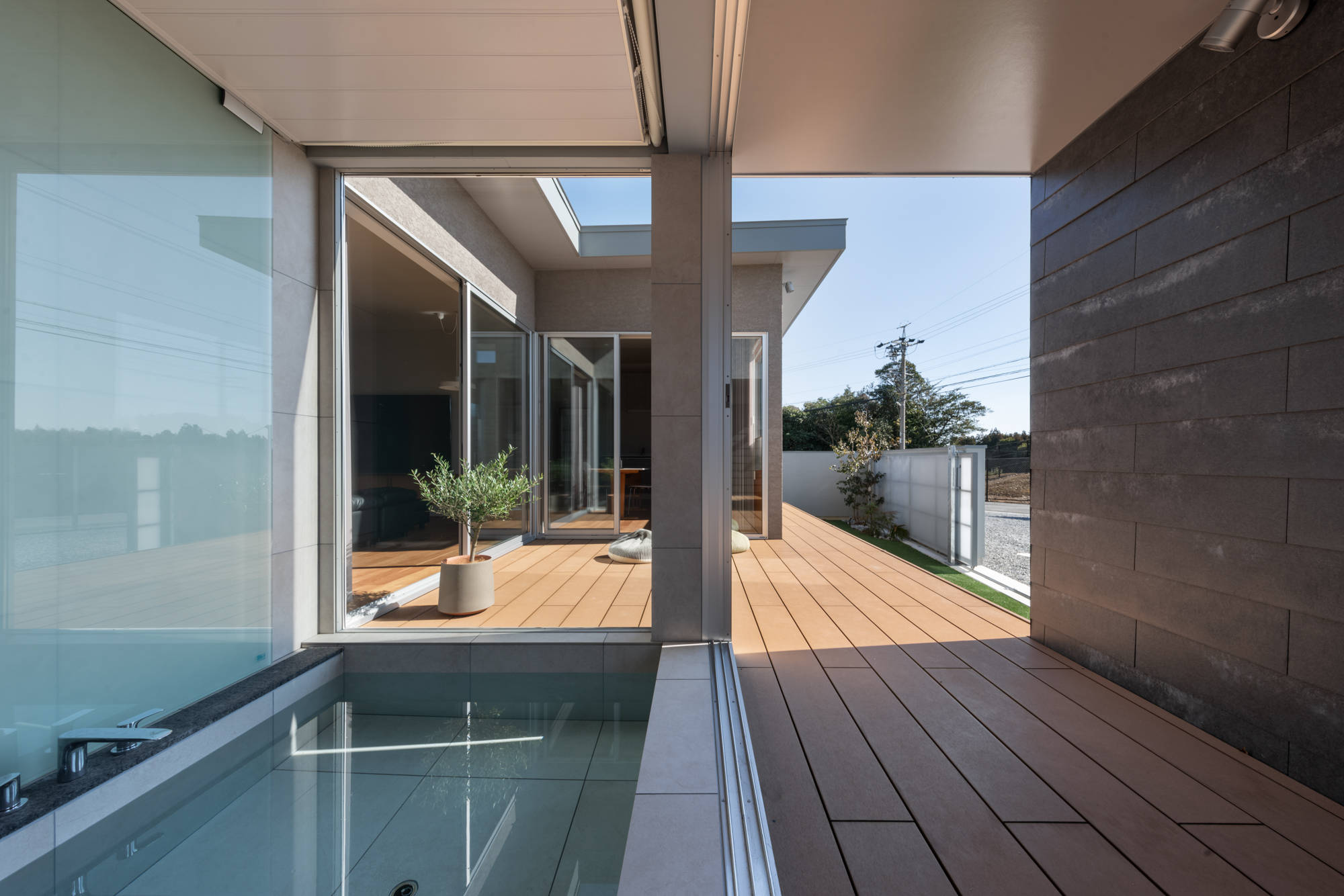 廊下の建具を開放し、大きな空間に変化するように考えることで、その空間に隣接する「居間」「キッチン」「浴室」「ウッドデッキ」を選択できるようにした。