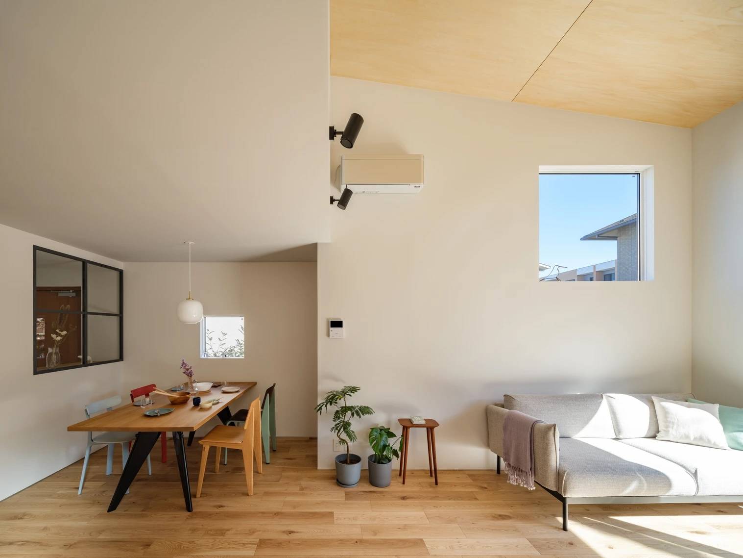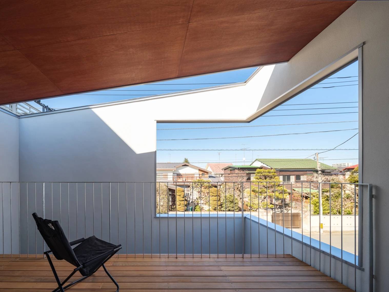 北東側コーナーの大開口は、テラスに光と風を導くとともに、街並みや空へ視線が抜けるようにすることで、空間に広がりをもたらしている。