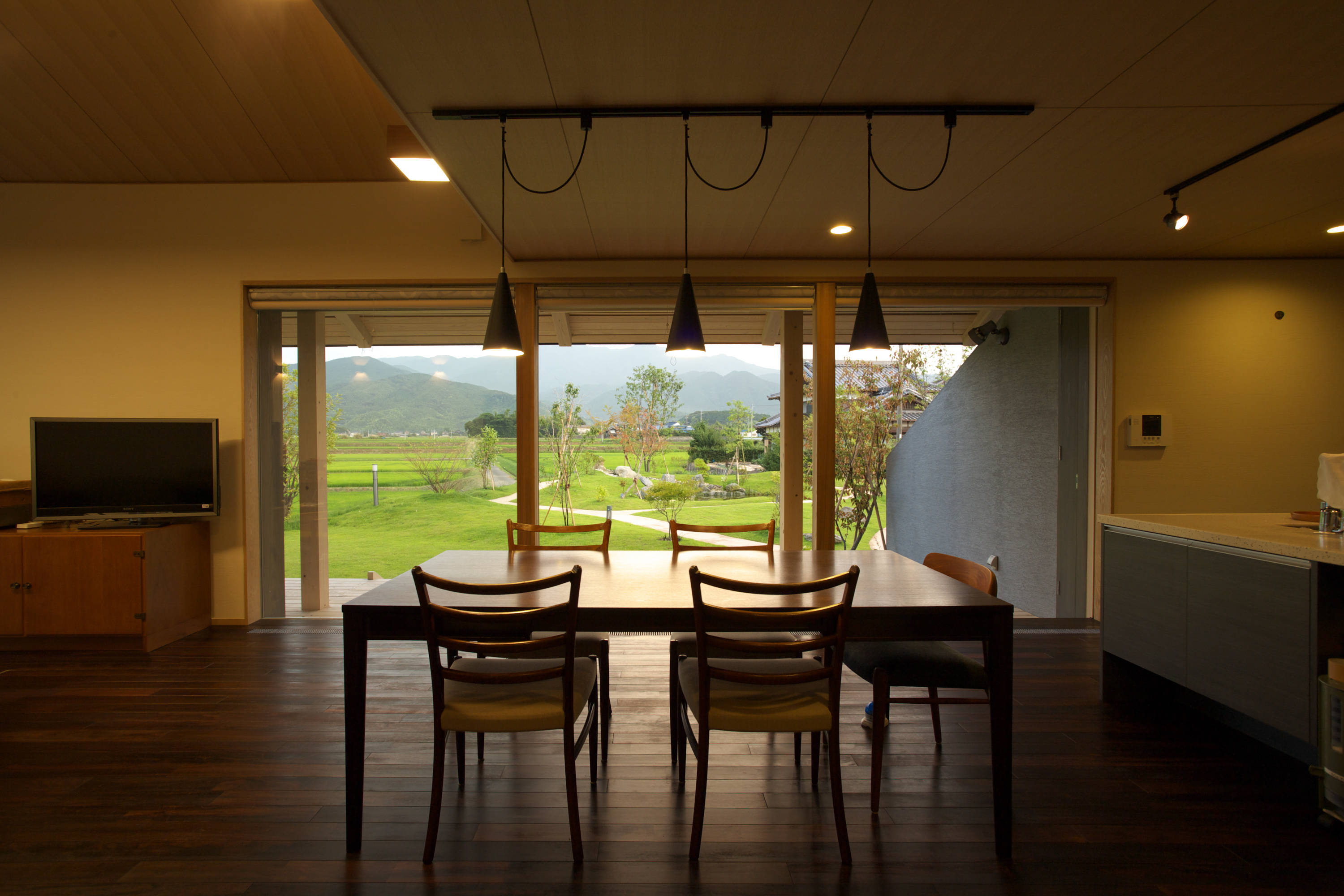 雷山のふもとに位置し、美しい田園風景が広がるのどかな場所に佇む住まいです。玄関を入ると吹抜けのある通り土間を設け、右側にプライベートゾーン、左側に来客ゾーンという空間構成になっています。リビングの大開口からはデッキ・庭・田んぼ・山々と緑が広がり、お庭の真ん中には地下水を利用した小川のあるビオトープ池をつくり、せせらぎを耳にしながら時間を忘れさせる住環境となりました。