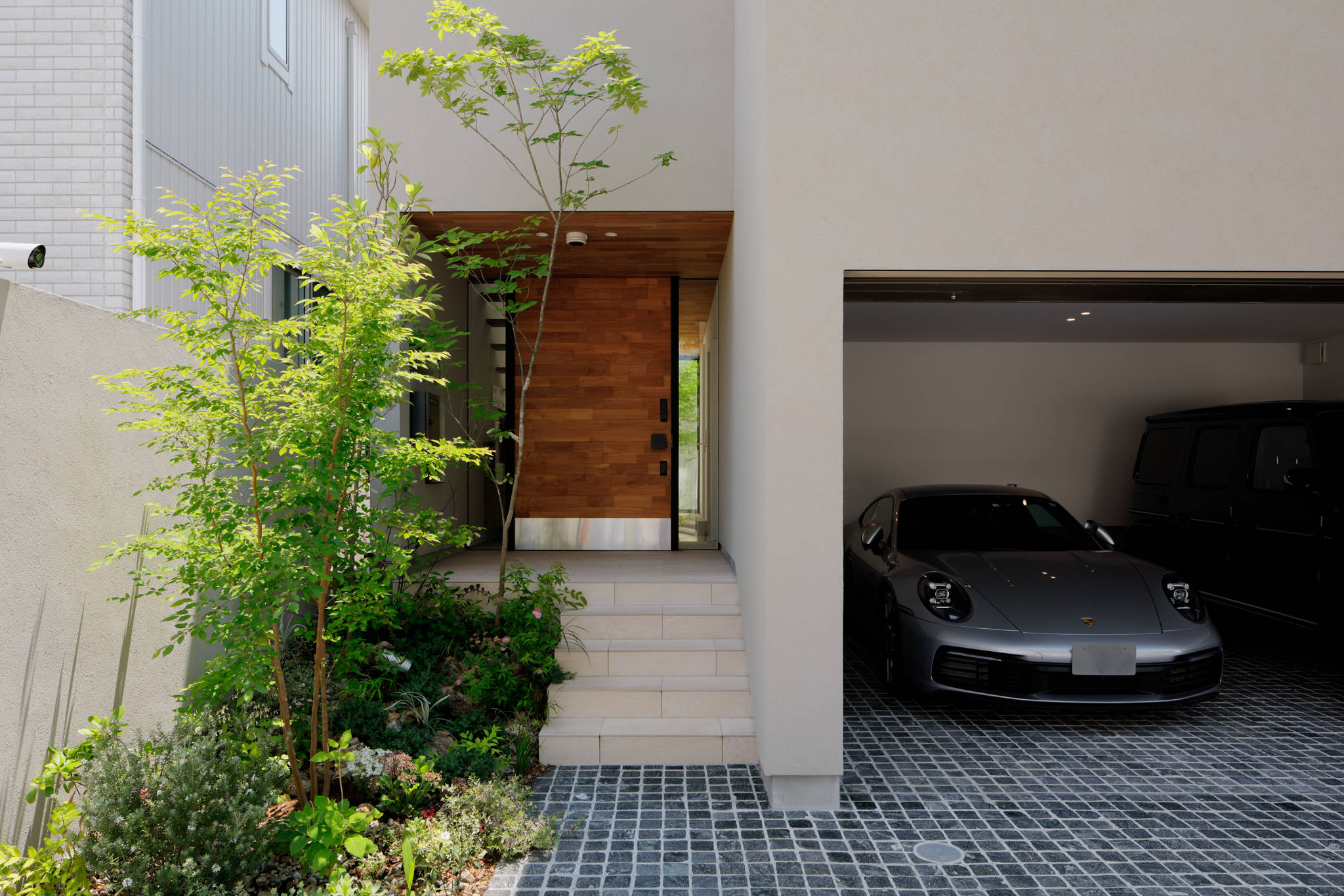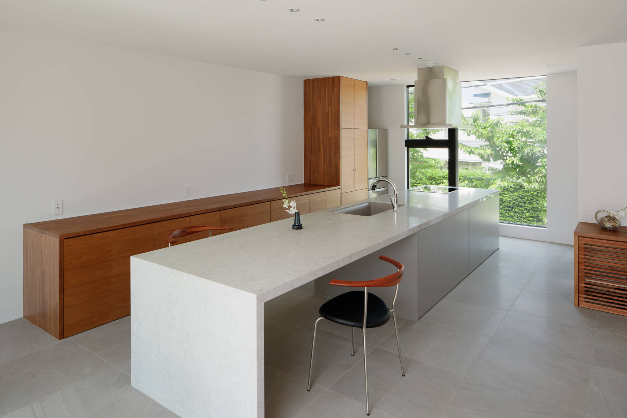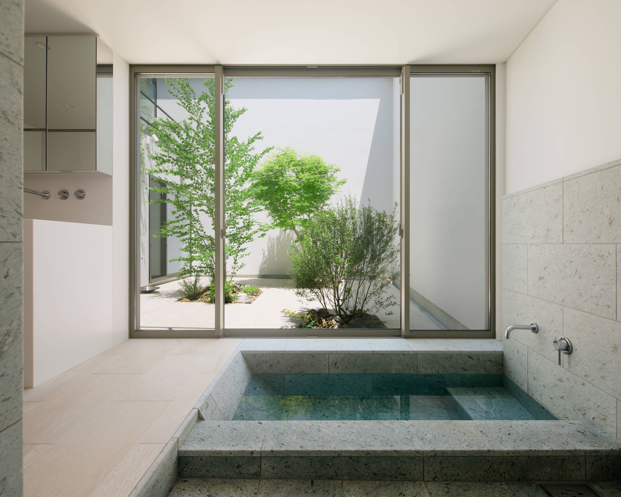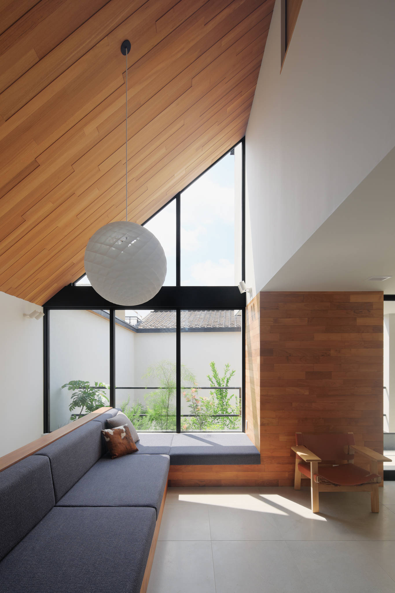 まずは階の構成として、1階はガレージと在来工法のご指定のある浴室(十和田石で床、壁、浴槽まで制作しています、これに関するブログ>も参照してください)など、2階はオープンでワンルームのLDK、3階は方位がやや触れているため高度斜線の影響を受け、他階の床面積の半分ほどの寝室などとなります。プライバシーの観点から建築で囲われた庭に対して開く関係のコートハウスをイメージしましたが、建築のボリュームとしてはかなり縦長になることもあり、中庭を南に置きその周囲は、約2層分の高い塀を設置することにしました。2階、3階の北側は桜を望む大きな窓、高度斜線で削られる部分は急勾配の屋根、勾配なりの吹抜け木天井(チーク材の凹凸張り、この木天井についてのブログ>も是非)として、2階のLDKのいずれの場所からも愛でることができる計画です。