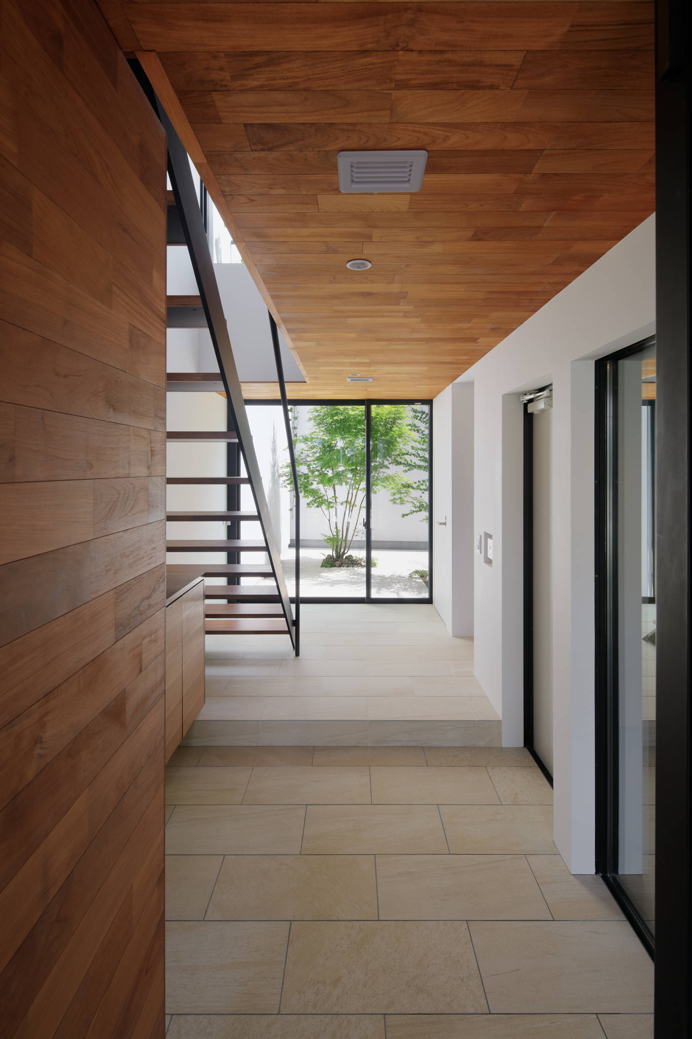 完成し、現在設計中のお施主様、何人かに見学いただいた際など、「外から見ると、北側以外ほとんど窓が無い家?と思ったけど、中に入ると驚くほど明るい」 という感想をいただきました。中庭周囲の壁や塀の色(ジョリパット、割肌)を建物外周の色よりも少し明度を上げて、反射の効果を高めている裏技?なども活きているかもしれません。
