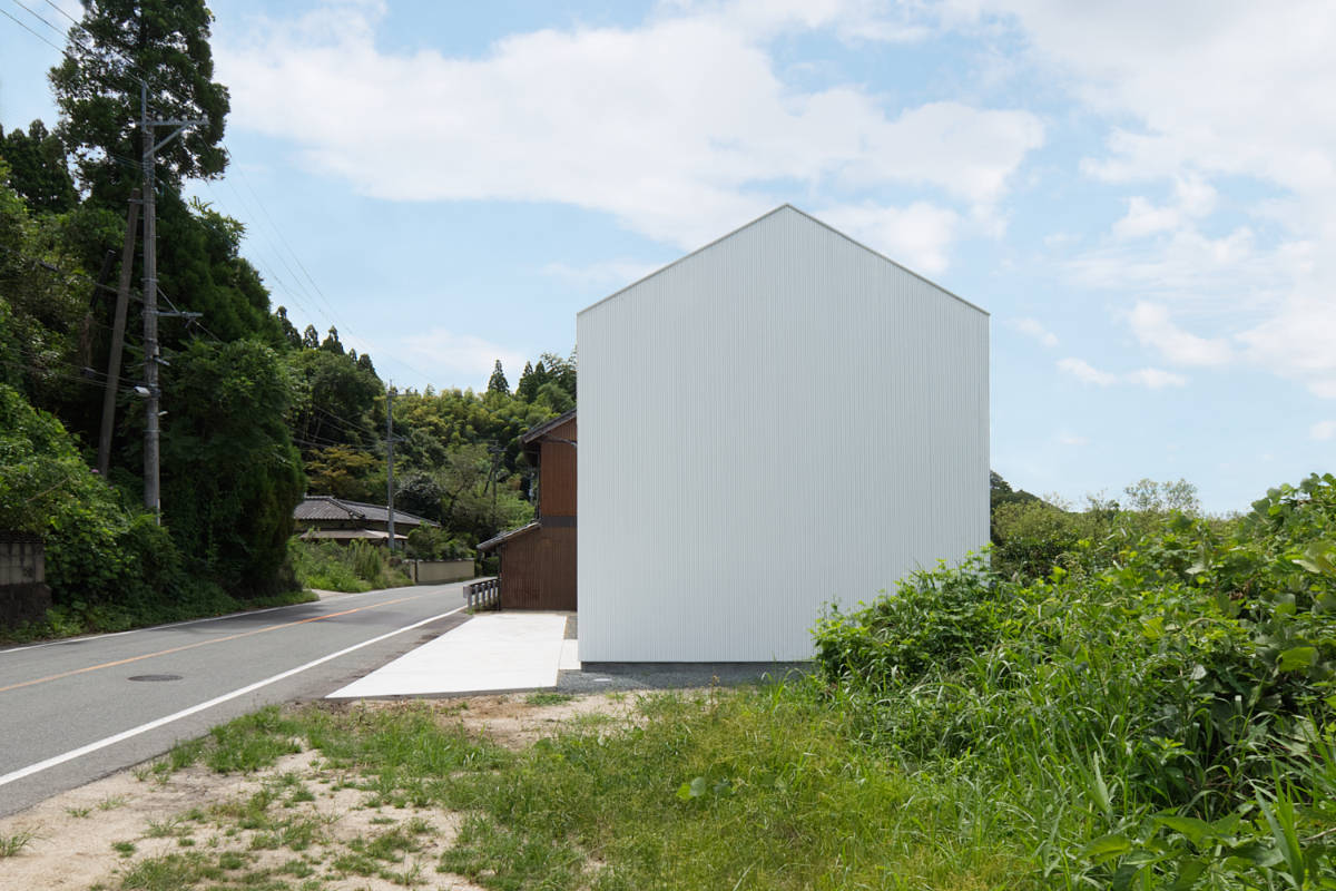 この住宅は、共通の記憶としてあった「遠方から見える切妻屋根のシルエット」を意識して、既存の住宅と屋根の形状やスケールを合わせている。その一方で、がけ条例の規制範囲を回避し、大型車両が頻繁に行き交う道路からの距離を確保するため、建物幅を縮小、長さのある2層のヴォリュームとした。