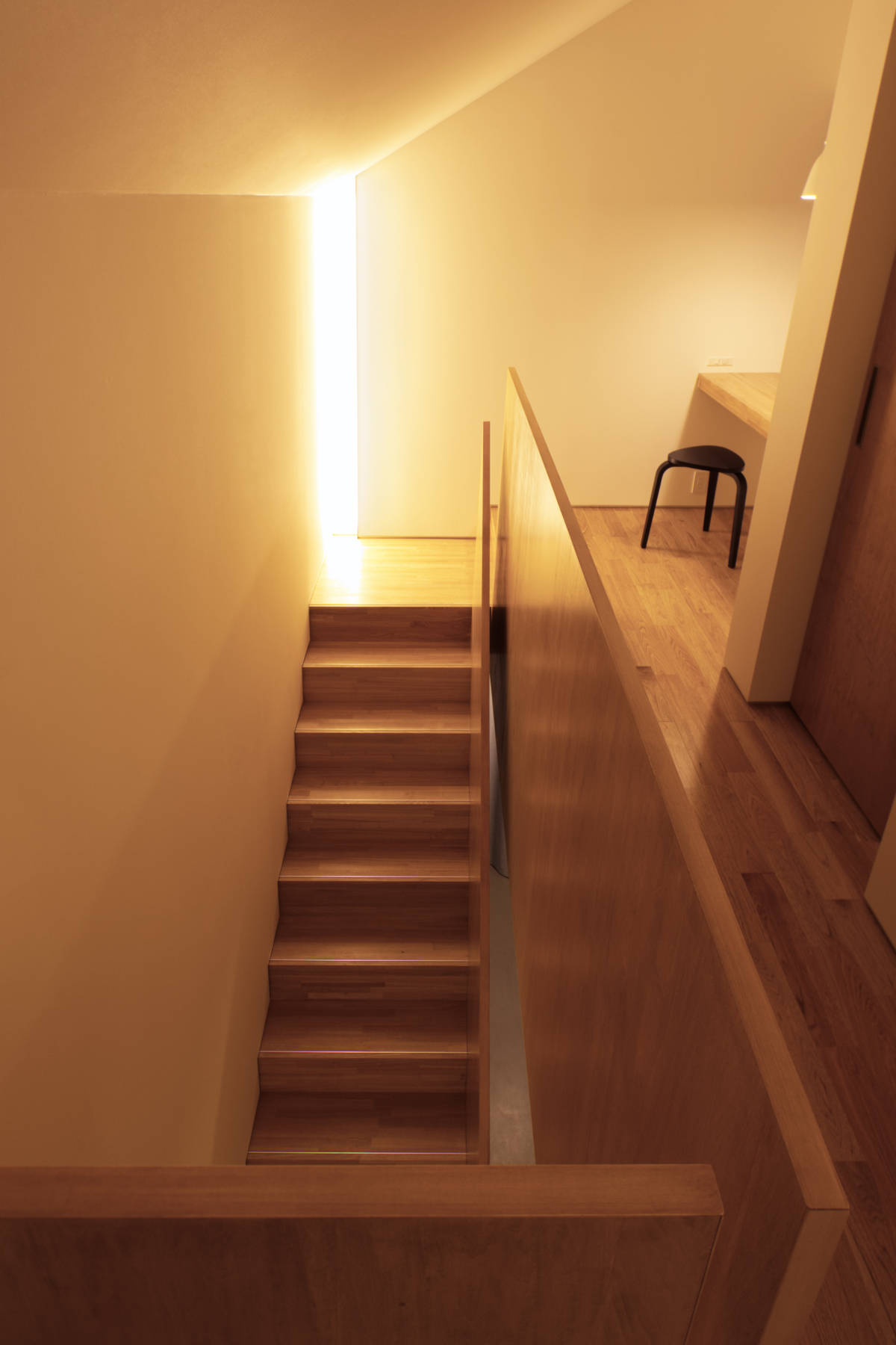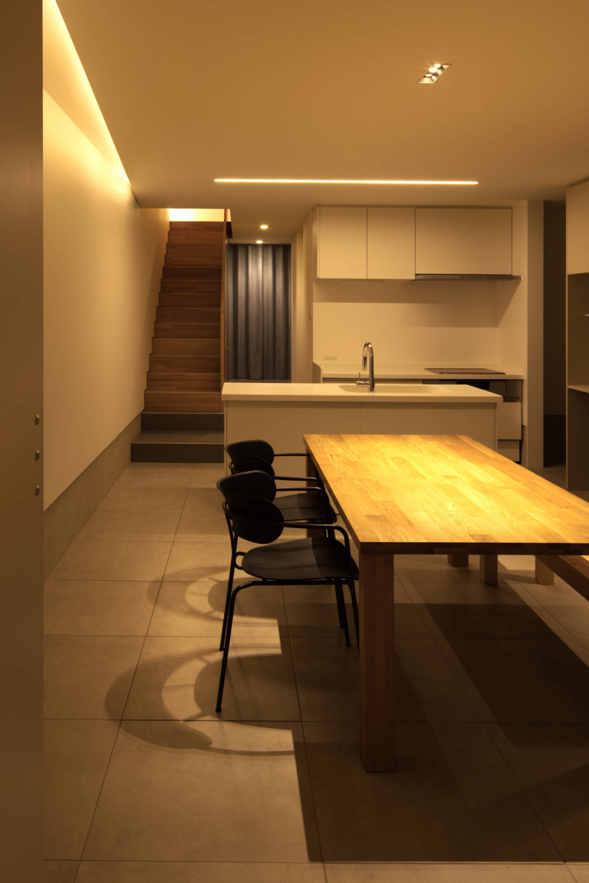内部は、1階の中心にLDKを配置、基礎の立上りを腰壁に見立てて、仕上げを全面タイル張りとした。 愛犬の健康に配慮しつつ、これから成長していく子供が気兼ねなく遊び回れる空間となっている。2階は、勾配天井を活かして天高にメリハリを持たせた。 天井の始点と開口部の位置を下げることで、西日対策をしつつ、全体が落ち着いた印象となるように意識した。