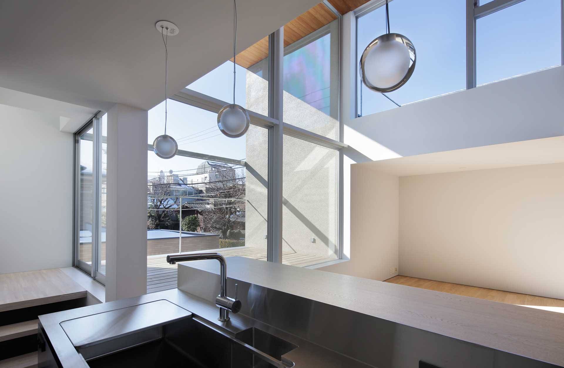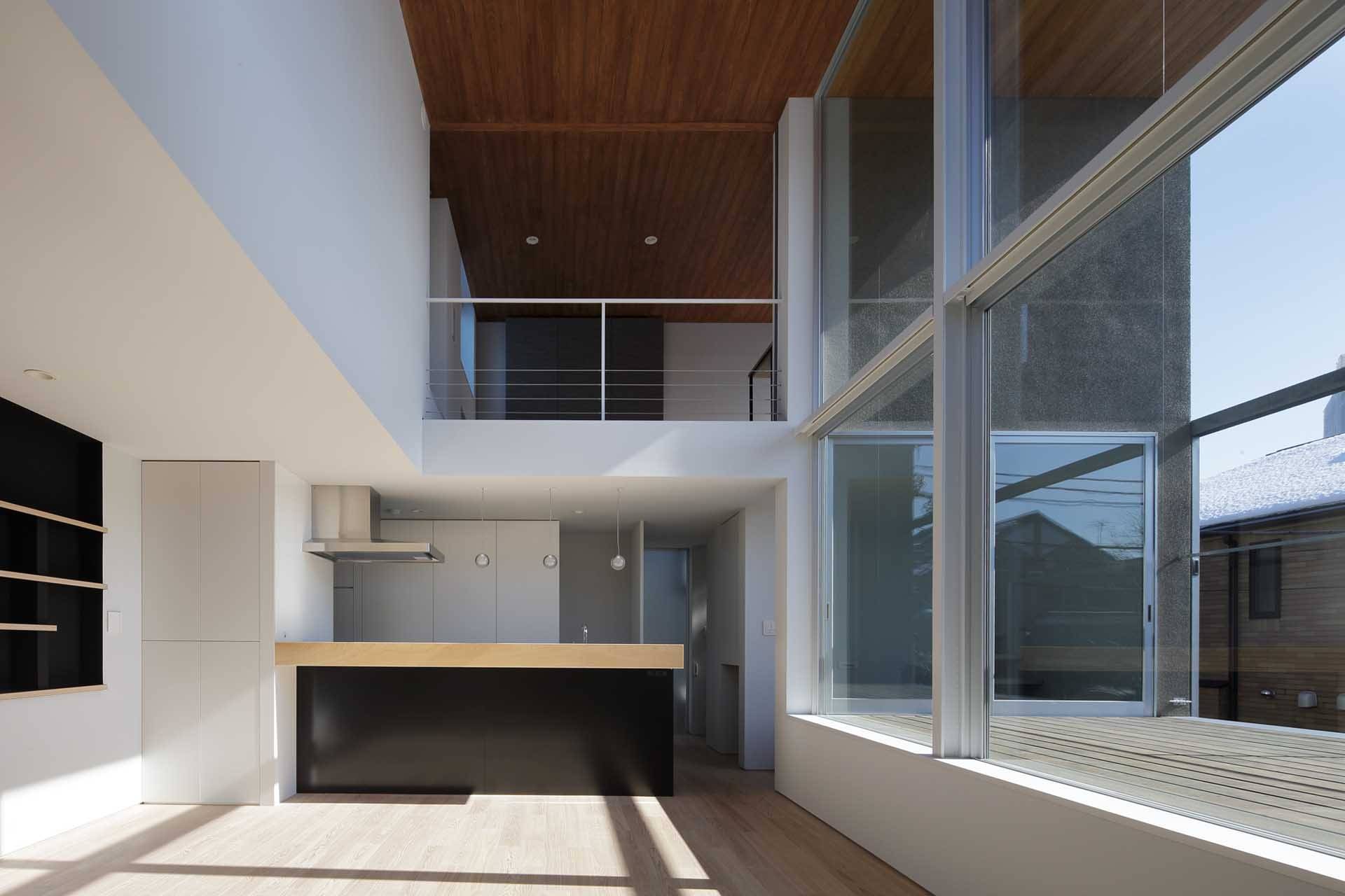 テラスの外壁面には大きな引戸が設けられ、テラスから自由に開閉できます。2層分の高さのテラスはガラス面を介してそのままリビングの吹抜となっているため、引戸が開かれるとリビングは外部へとそのままつながっているような開放的な空間となります。
