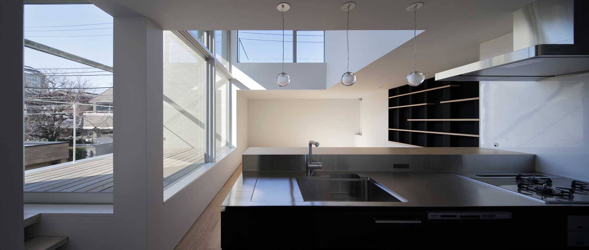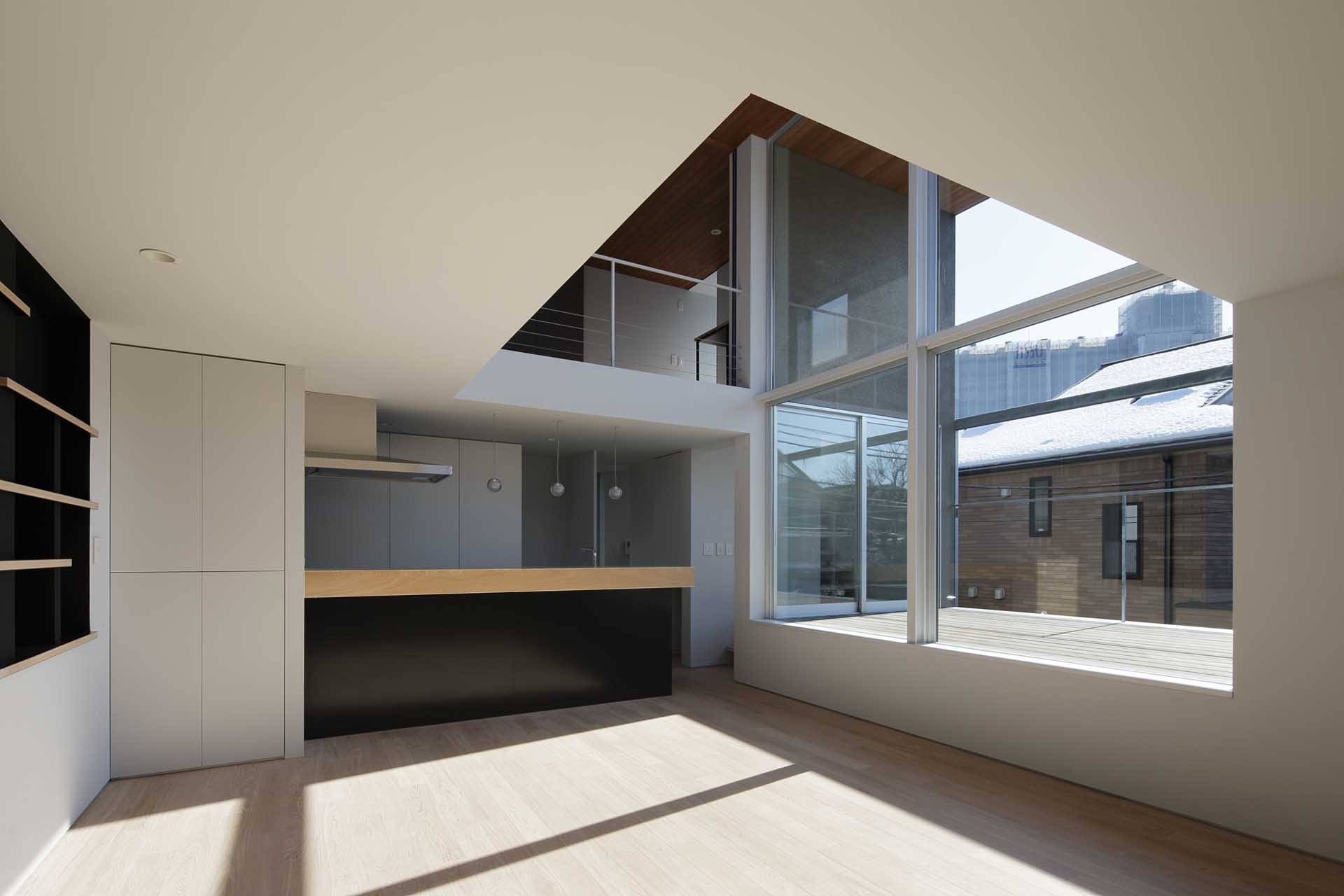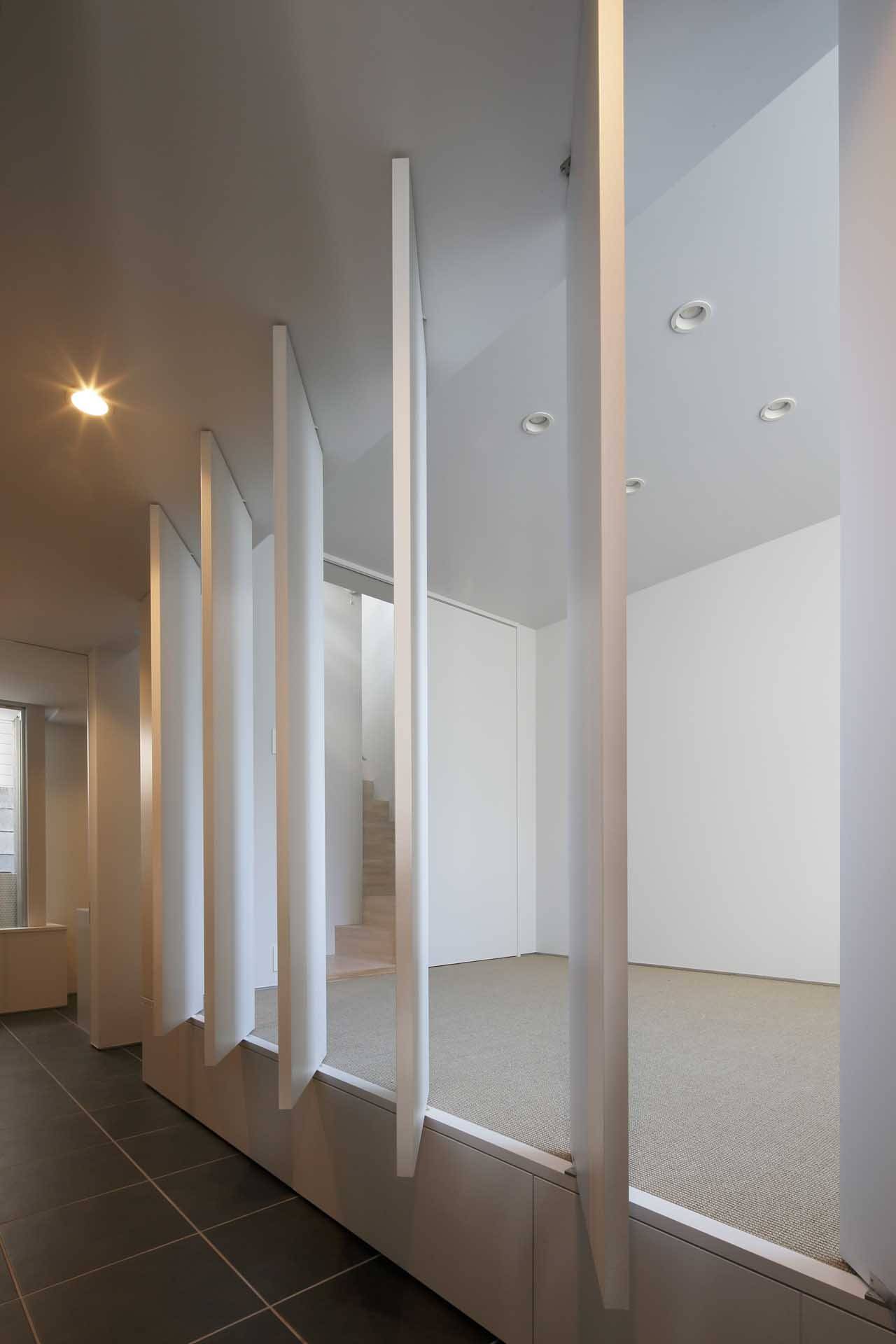 引戸が閉じられると通りや近隣からの視線は完全に遮断され、テラスは空だけが見える壁面に囲まれたコートのような空間になります。引戸を開閉することでテラス空間を挟んで接する外部と内部のつながり方が変化し、新たな関係性が生じます。