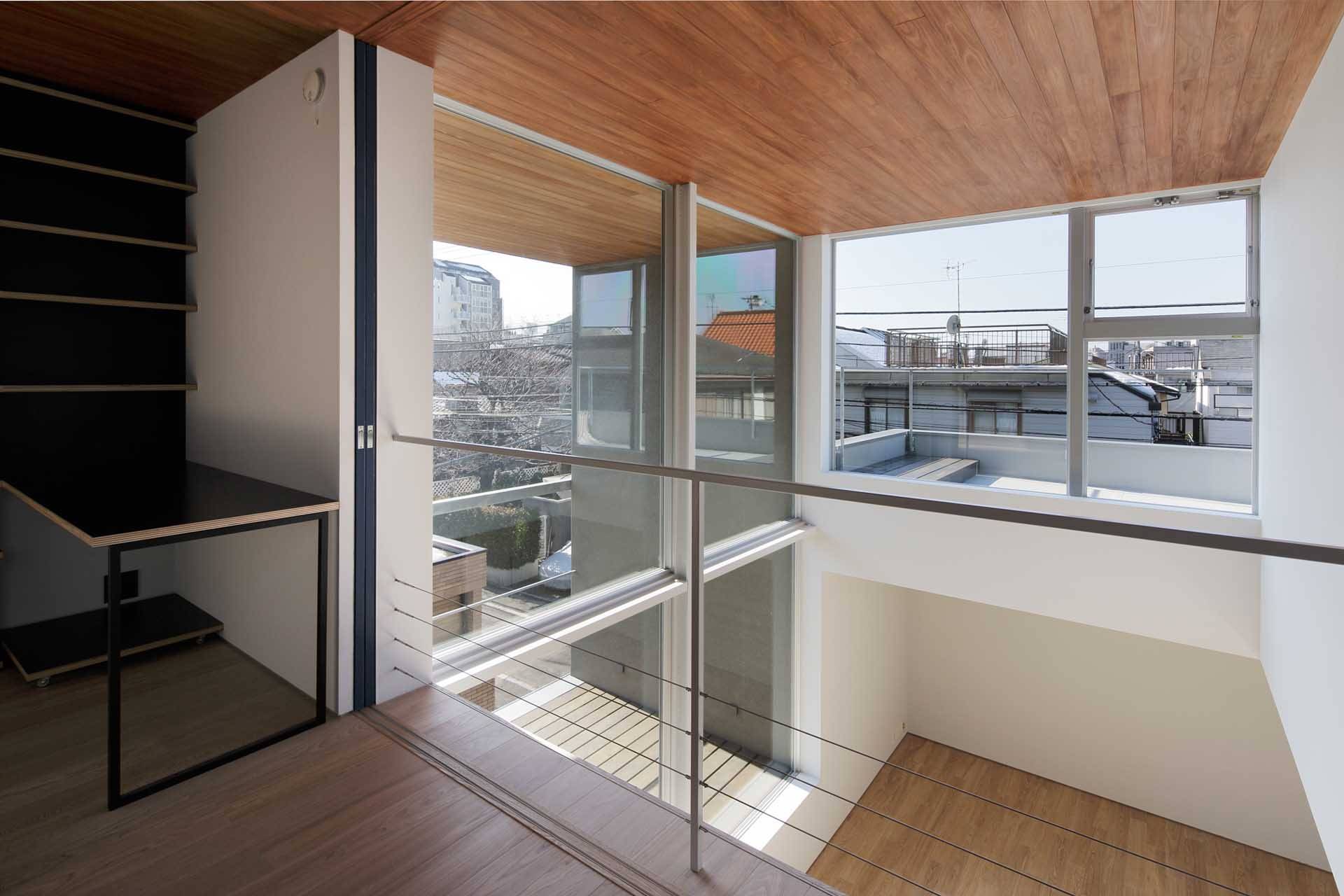 3階の寝室はリビン グの吹抜と一体の空間となっていて、吹抜との境界にも引戸が設けられています。引戸を閉じれば独立した個室となり、開けば吹抜の向こうに空が広がります。