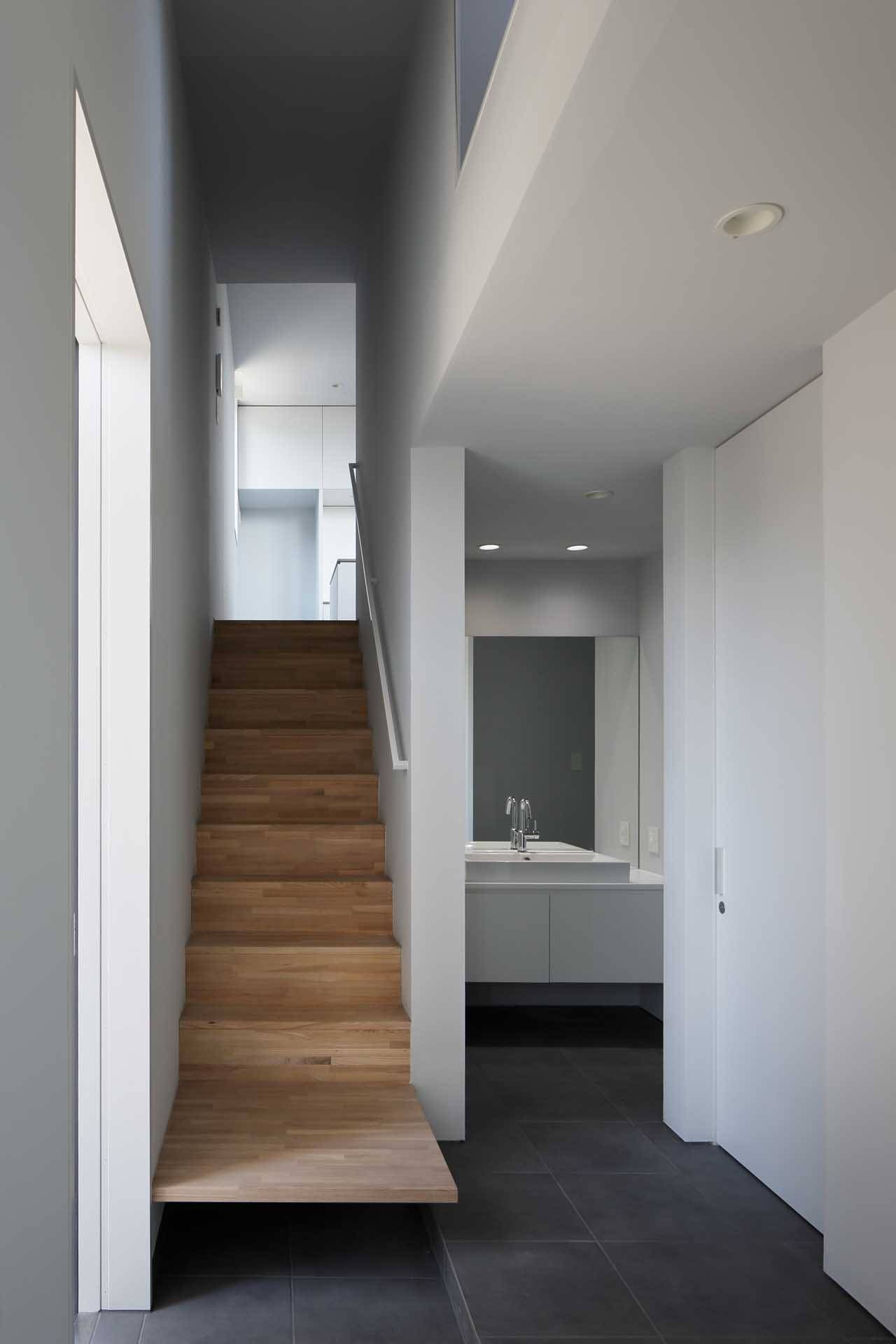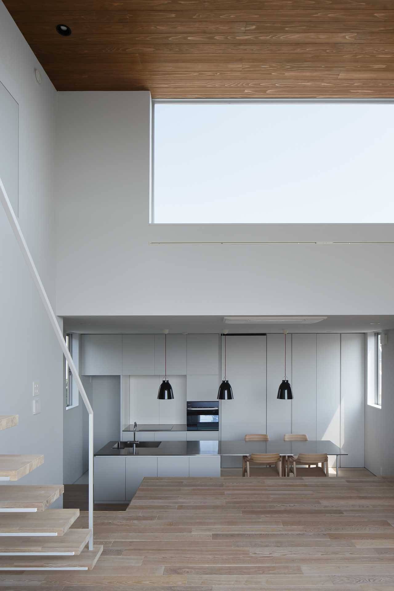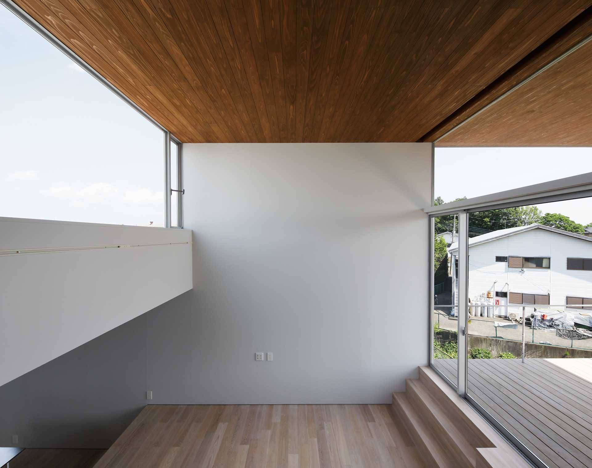 分譲地の一角にある敷地は、前面道路から少し上がっており、近接する小さな川に沿って南側に視線が通っていくような場所でした。敷地のもつ高さを住宅の中の地形として顕在化することで、南側に流れる小川に向かう視線をより印象的なものにするとともに、住宅のなかにおいても多様な視線を生み出そうと考えました。