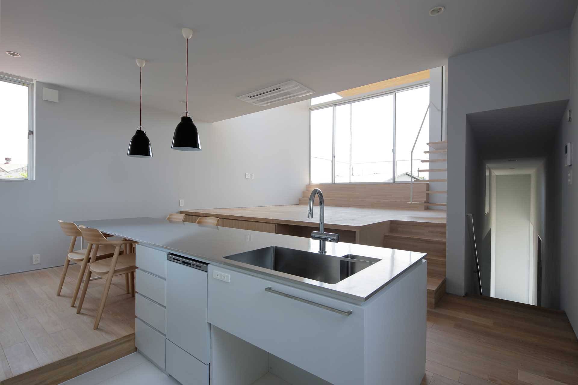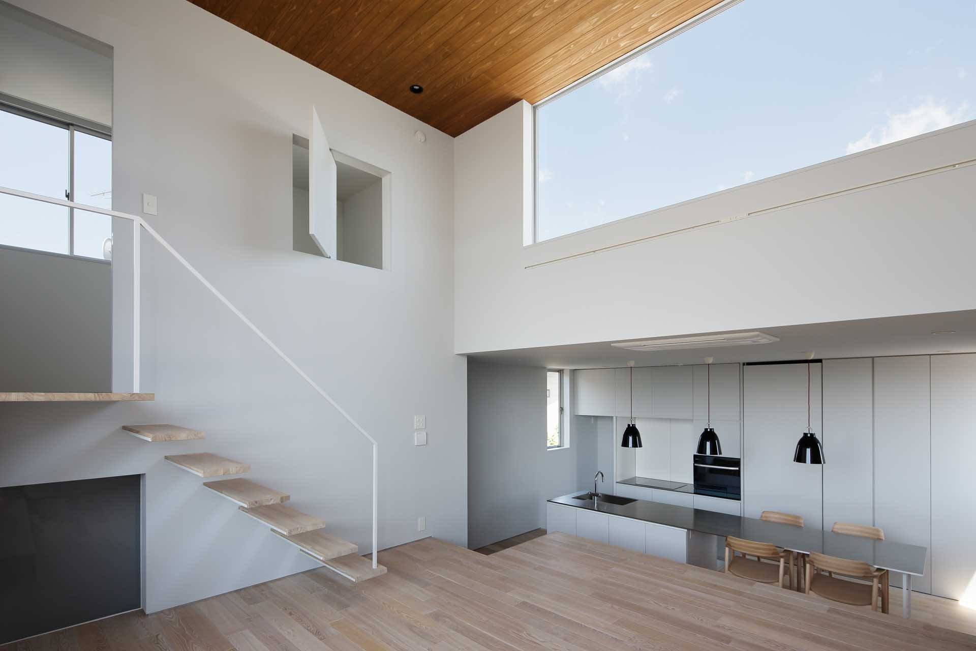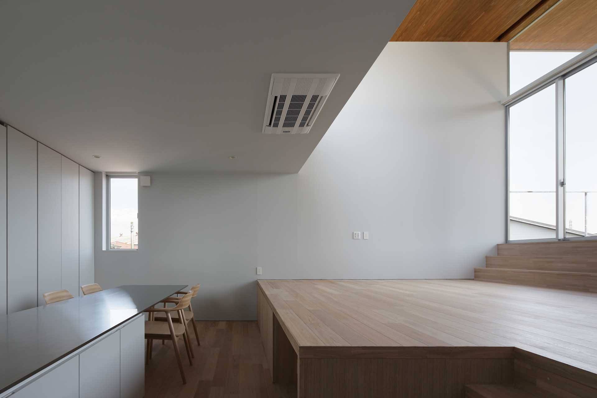 2階を一つの大きな空間として計画し、住居の主な空間を配置しています。南側に大きく開いたテラスは視線や眺望などを考慮して2階床より高い位置に設けられていて、このテラスに向かってキッチンとダイニング、リビングと空間が段状に連なります。高い天井高のリビングは北側にも大きくハイサイドライトを設けていて、明るくて開放的な雰囲気です。リビングから階段を少し上がった建物の一番高いところが子供部屋です。2つある子供部屋からはそれぞれ違う風景を眺めることができます。