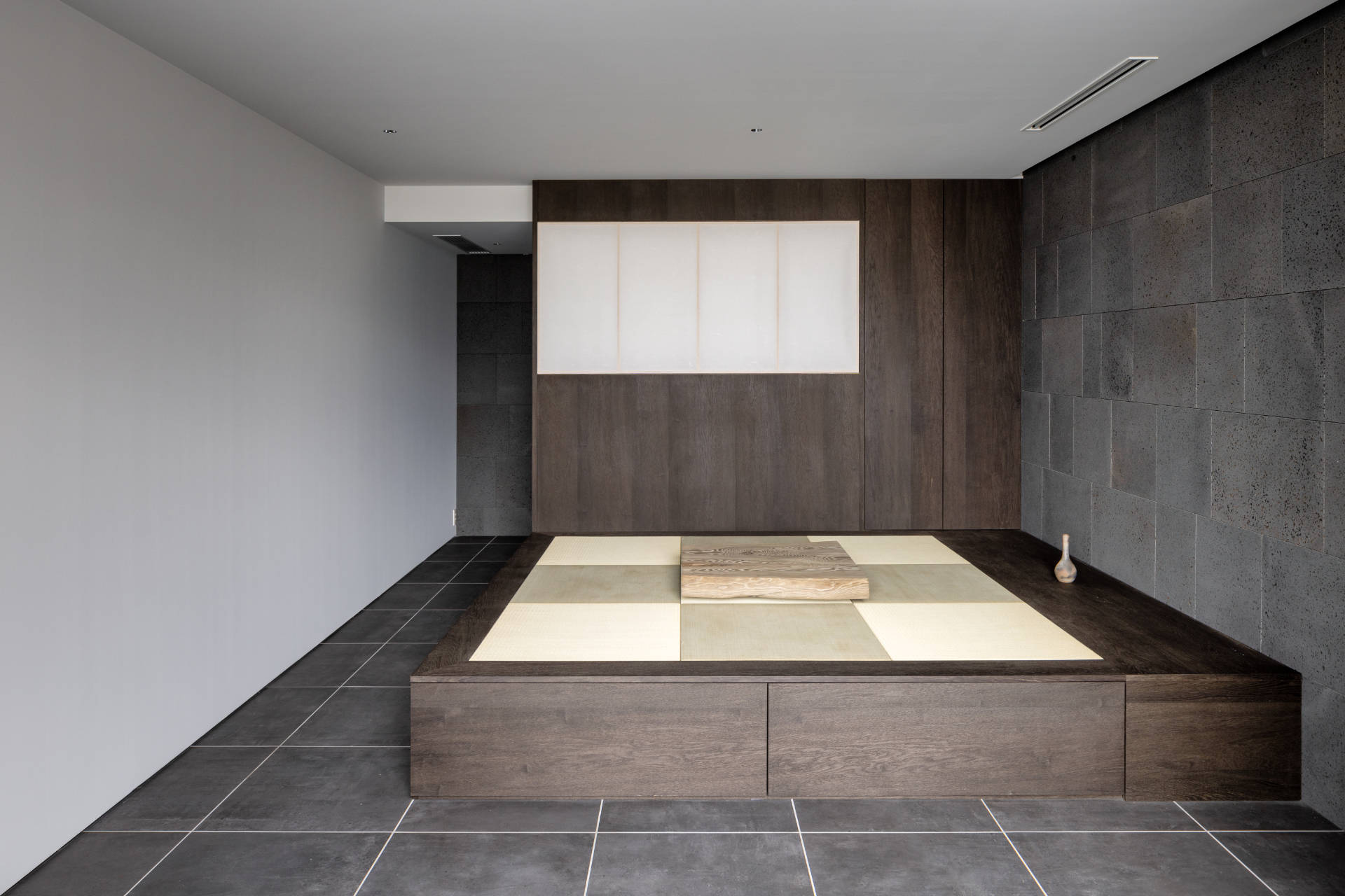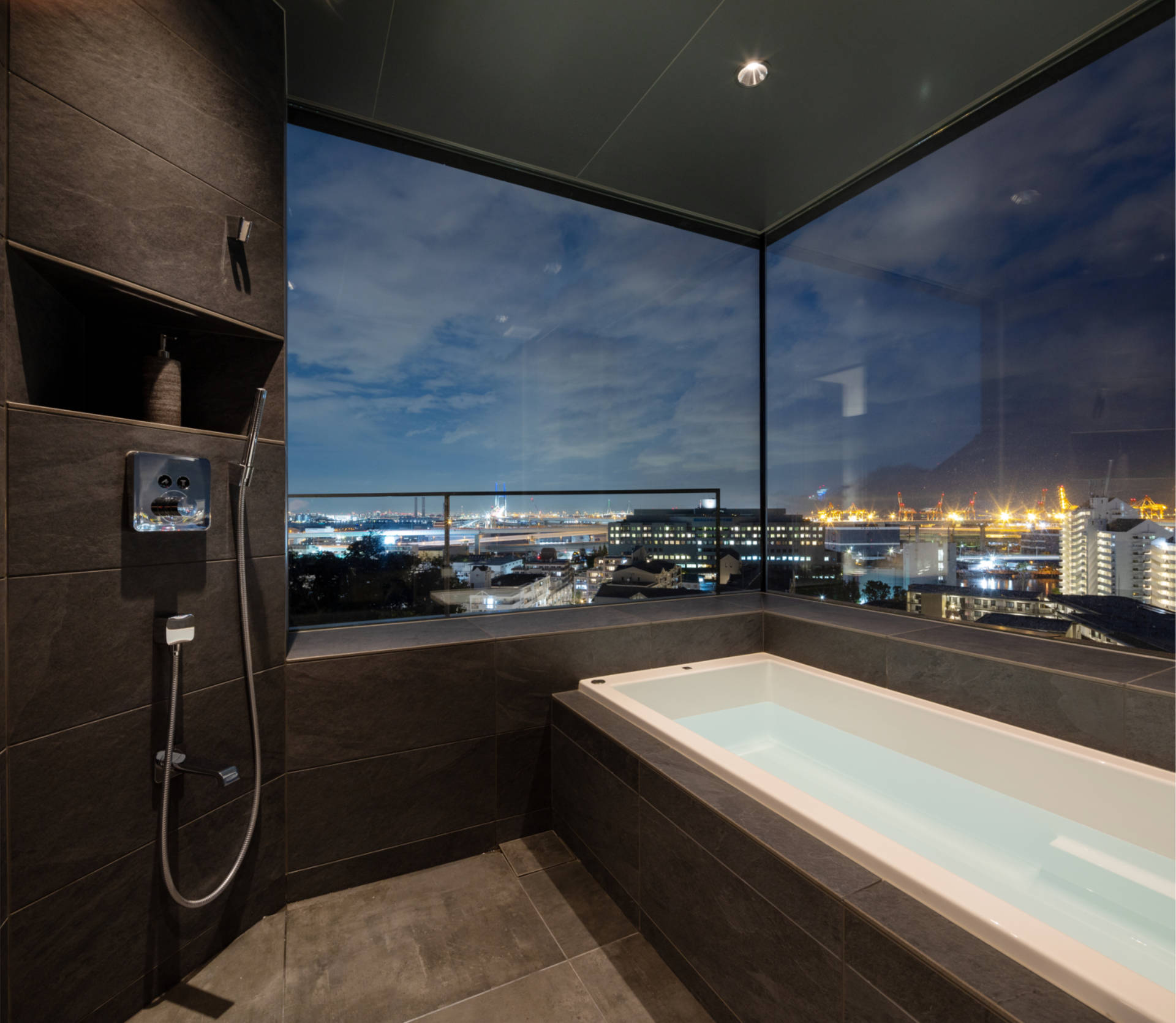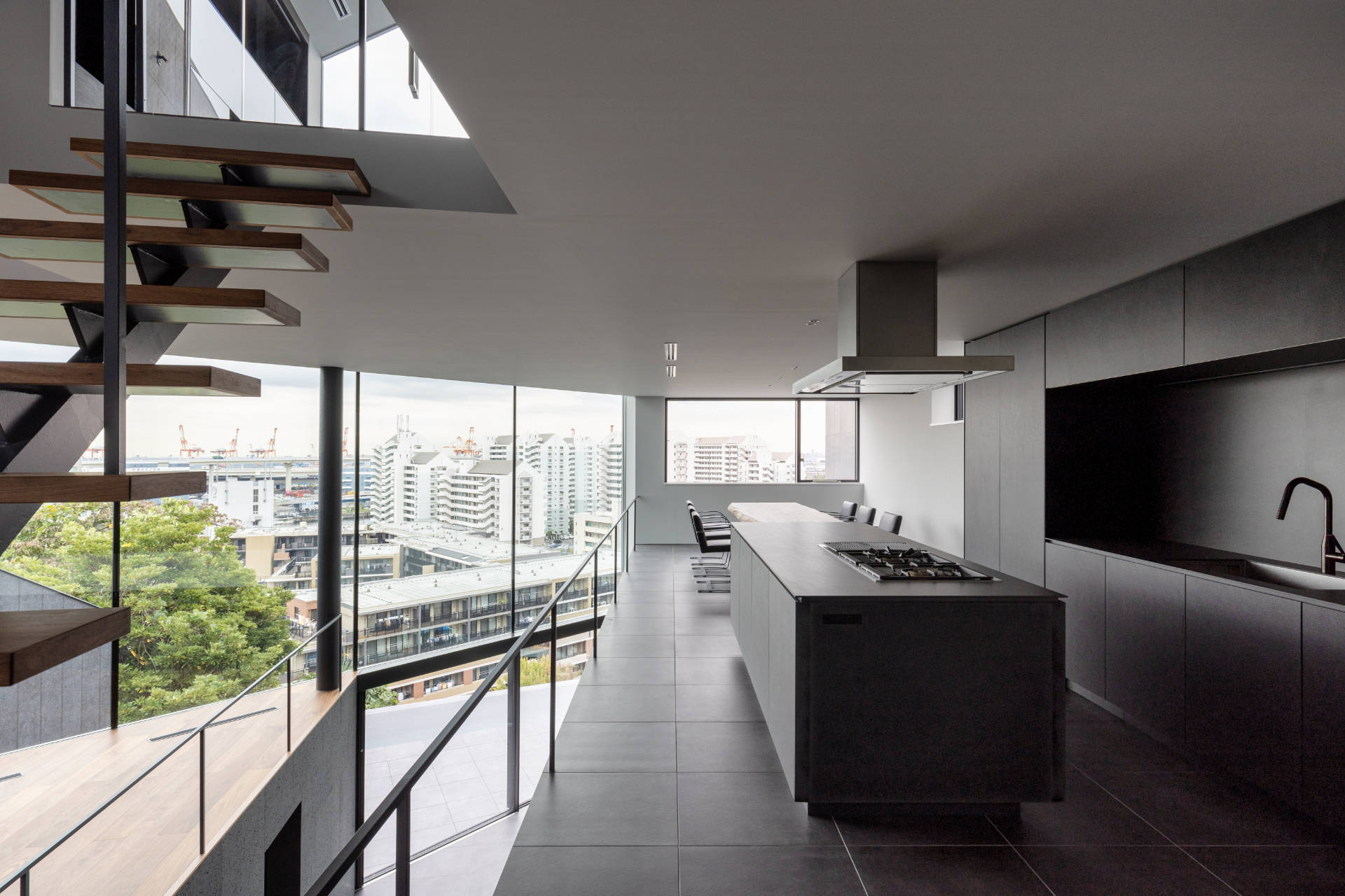 1階の南側に縦列3台分のガレージが設けられていて、ホールを挟んで相対するリビングからショールームのように車を眺めることができます。ダイニングや浴室などからは横浜港やベイブリッジなど横浜の特徴的な風景を望むことができます。内外装では石、タイル、金属パネルなど様々な種類の材料を用いつつ、異素材間で質感や素材の持つ模様など合わせていくことで全体的には統一された印象を与えるように配慮しています。