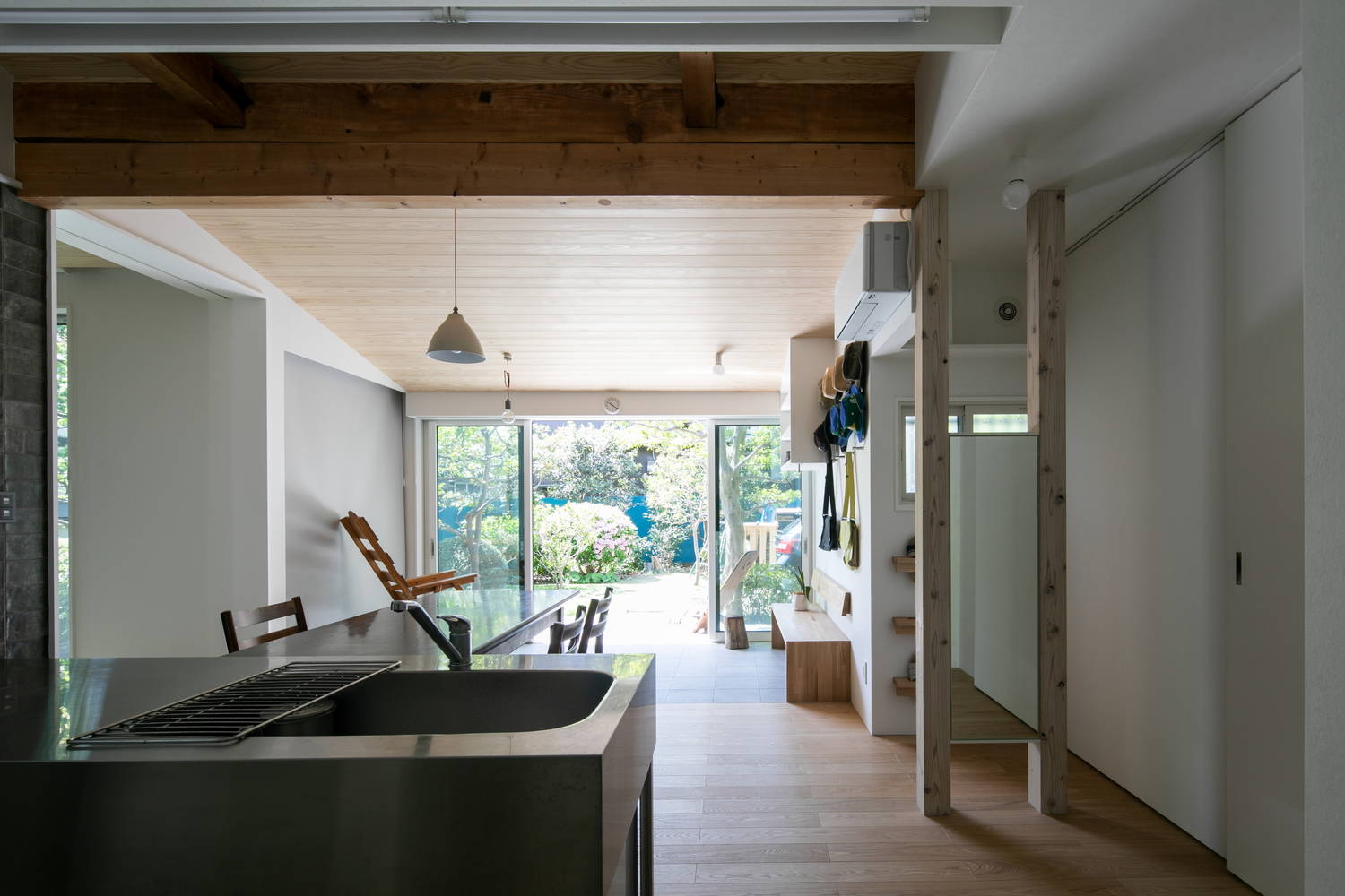 新しさと古さが調和した空間を目指した。自然光を採り入れたキッチンを中心とした回遊性のある空間を計画。暗い所に光を入れる為、吹抜ハイサイドライトを設けた。玄関は昔の記憶として古さを残しつつ調和するようにした。テラスと土間を設置し古い外観を和モダンに。又、外と内の繋がり、もう一つの出入口として暮し方の幅を広げた。 シンプルなスケルトンキッチンを光と暮らしの中心に配置し、白を基調にグレーと木で構成した空間の引締めと抜け感を演出した。