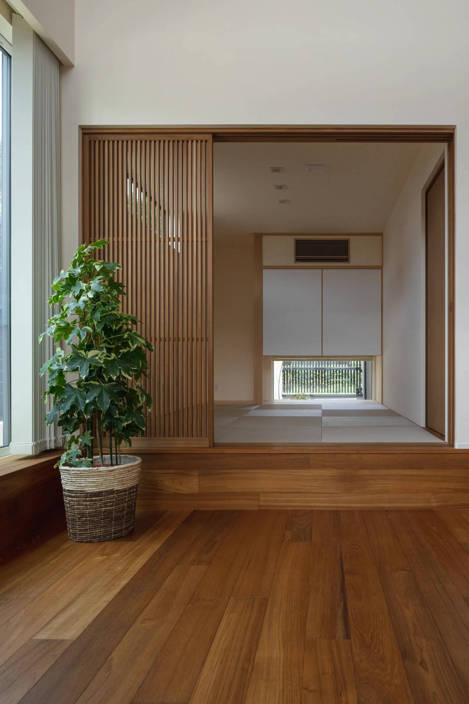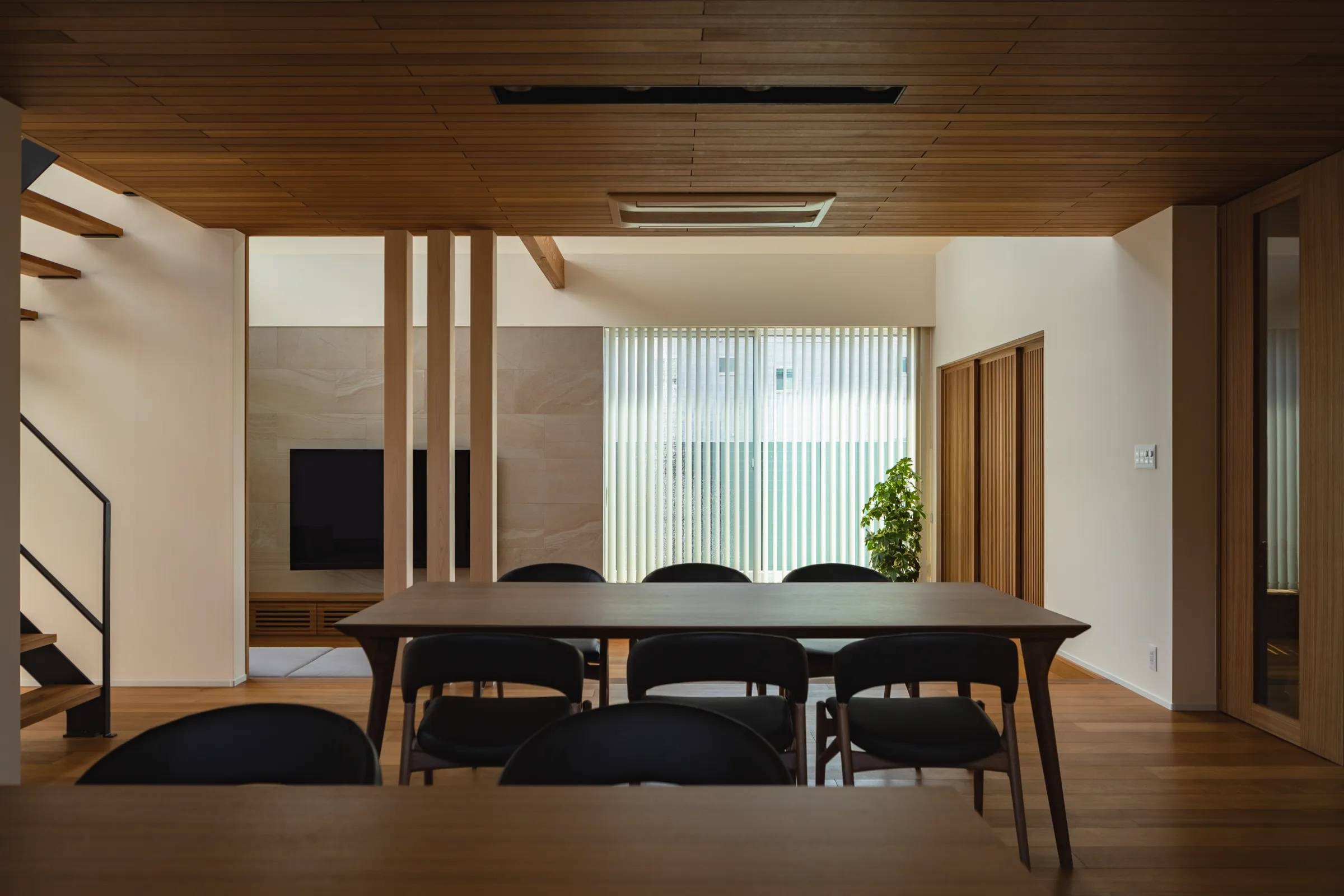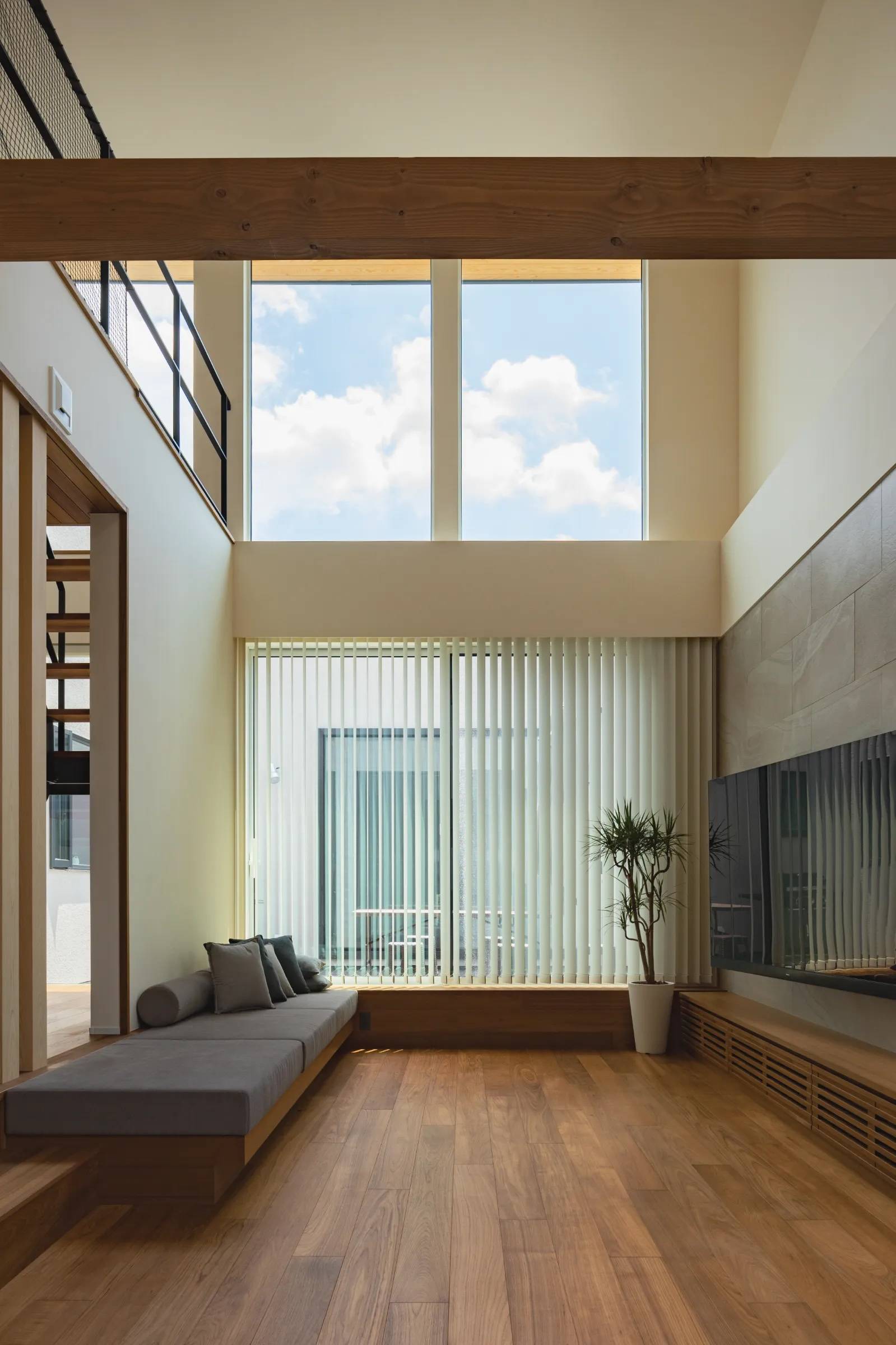 テラスでつながる二世帯住宅。異なる世代が心地よく交わりながらも、プライバシーを大切にした空間設計です。LDKは床や天井の高さに変化をつけ、開放感あふれる広がりを演出。リビングに差し込む陽射しは、漆喰の壁を通じてやわらかな光となり、吹き抜け空間を優しく包み込みます。