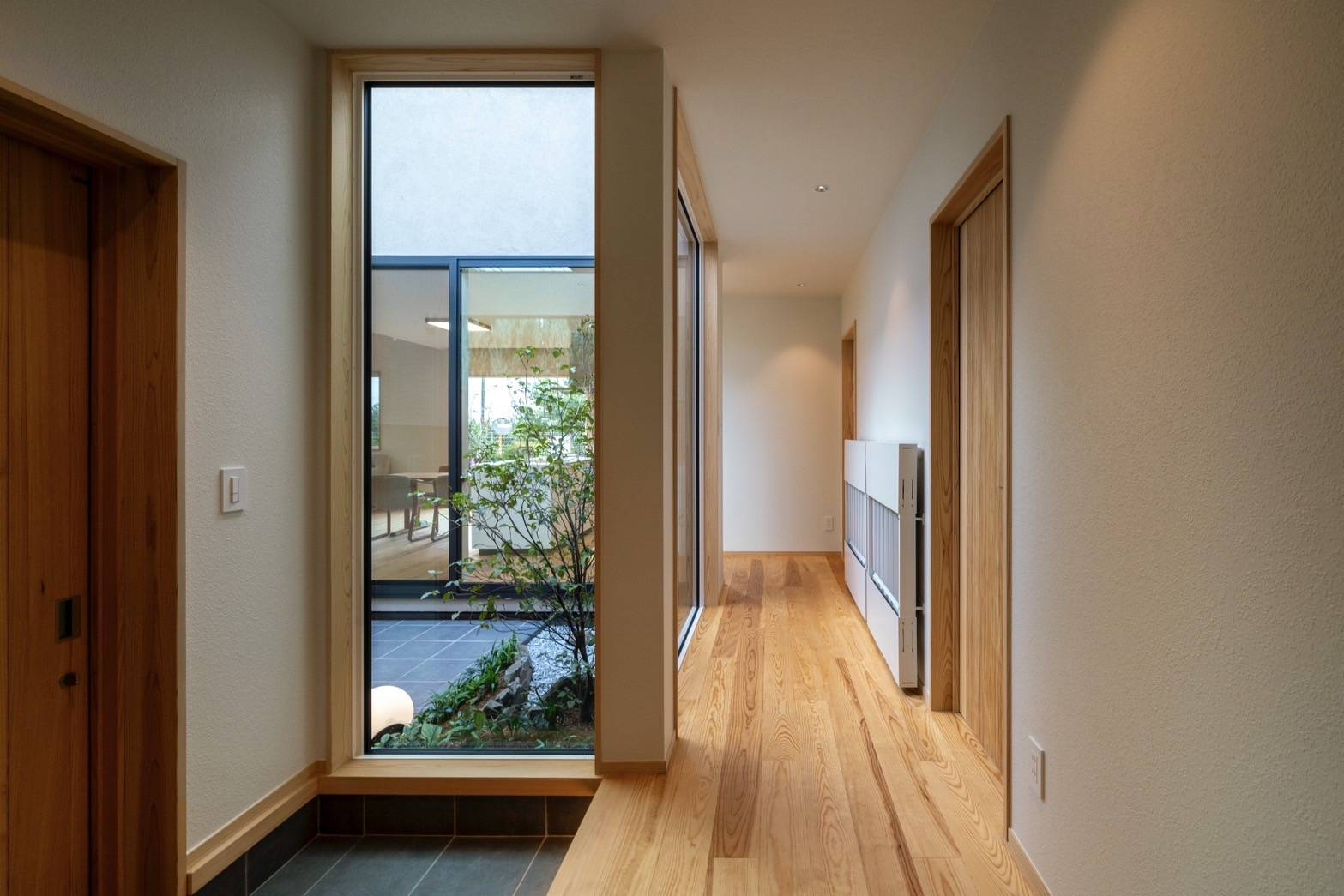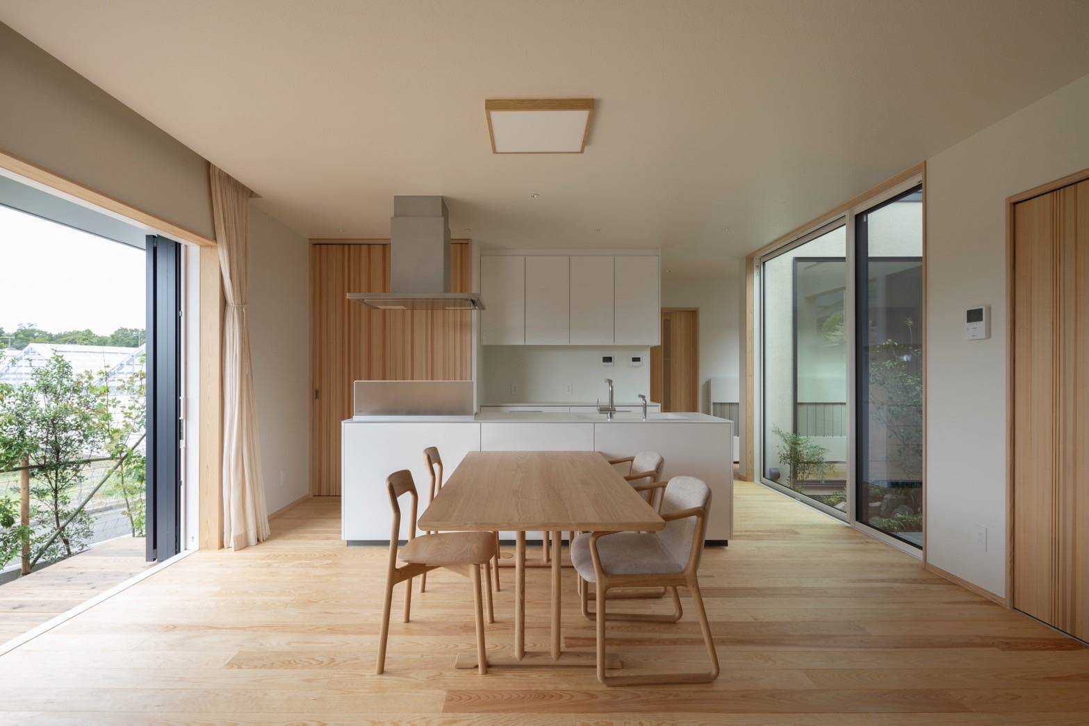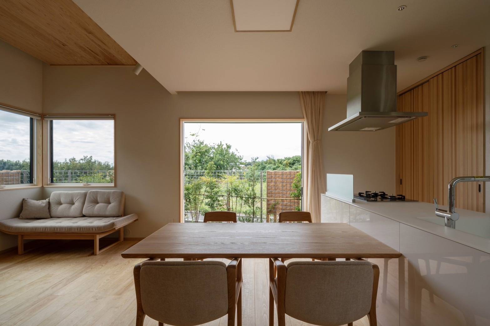 建物の計画は高齢な夫婦の住み替えを想定し2人暮らし+αをテーマとし、高齢な家族の住まいとして小さな中庭のある平屋の計画としています。 この住宅では健康に暮らすための取り組みとして建物の主要構造部や各部に無垢材を使い、接着剤などをなるべく使わない建材を選定しており、構造の水平構面にも「どんとパネル」という面材を用い集成材は使用せずに耐震性を確保しています。 また、温熱環境を整えるための断熱材にも再生可能な自然素材のセルロースファイバーを充填し、空調設備にもルームエアコンではなく輻射熱パネルによる空調を装備するなど、快適性と健康を実現するために徹底した材料と工法の選定をしました。 十分な断熱性能を担保した住まいは気候の穏やかな春、秋は空調設備を必要としませんが、夏、冬は輻射熱パネルによる空調により体に優しく室内環境を整えます。輻射熱パネルによる空調は無垢材などの自然素材との相性も良く、空気を自然に調湿しつつ快適な室内環境が実現できます。