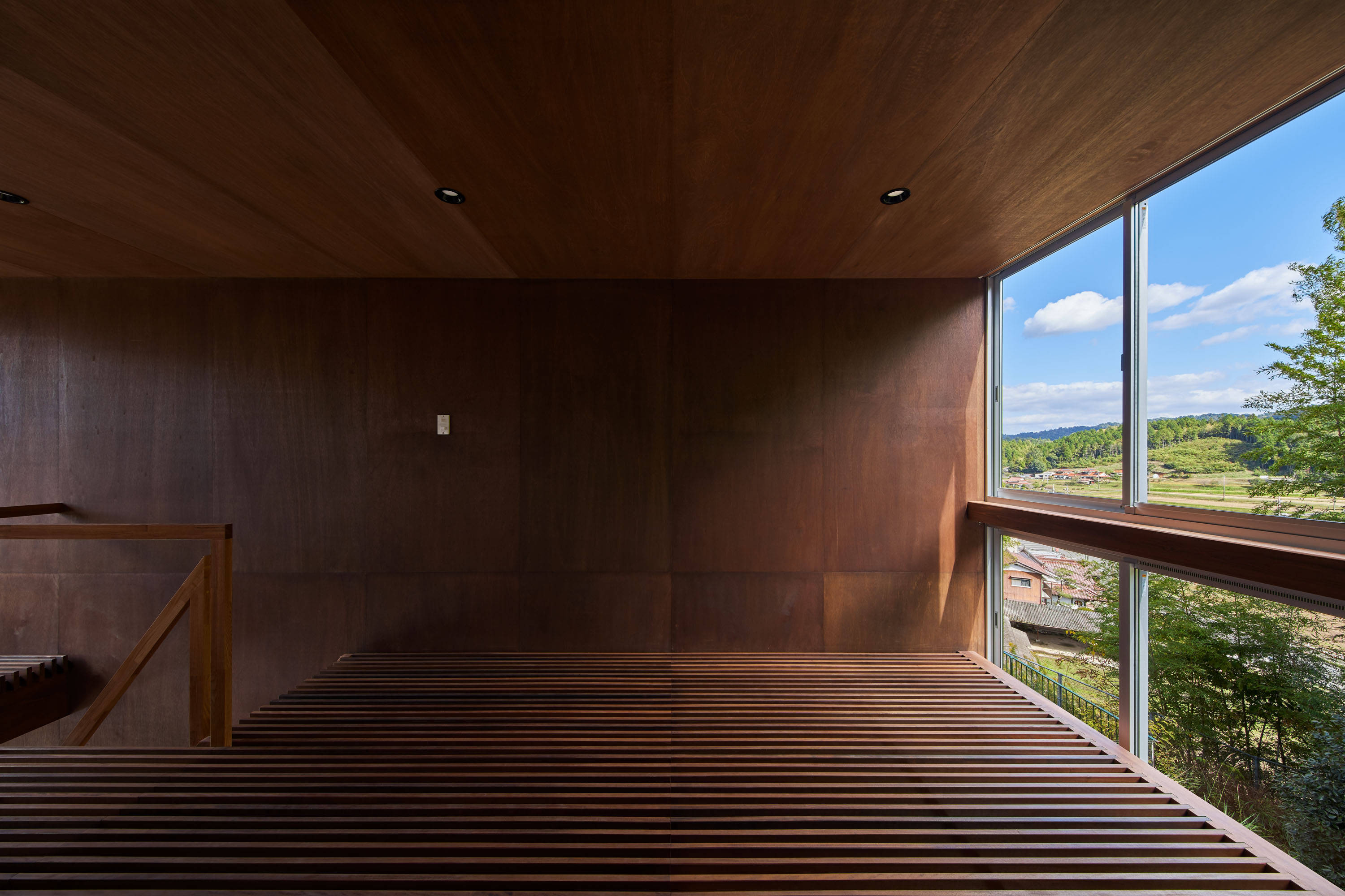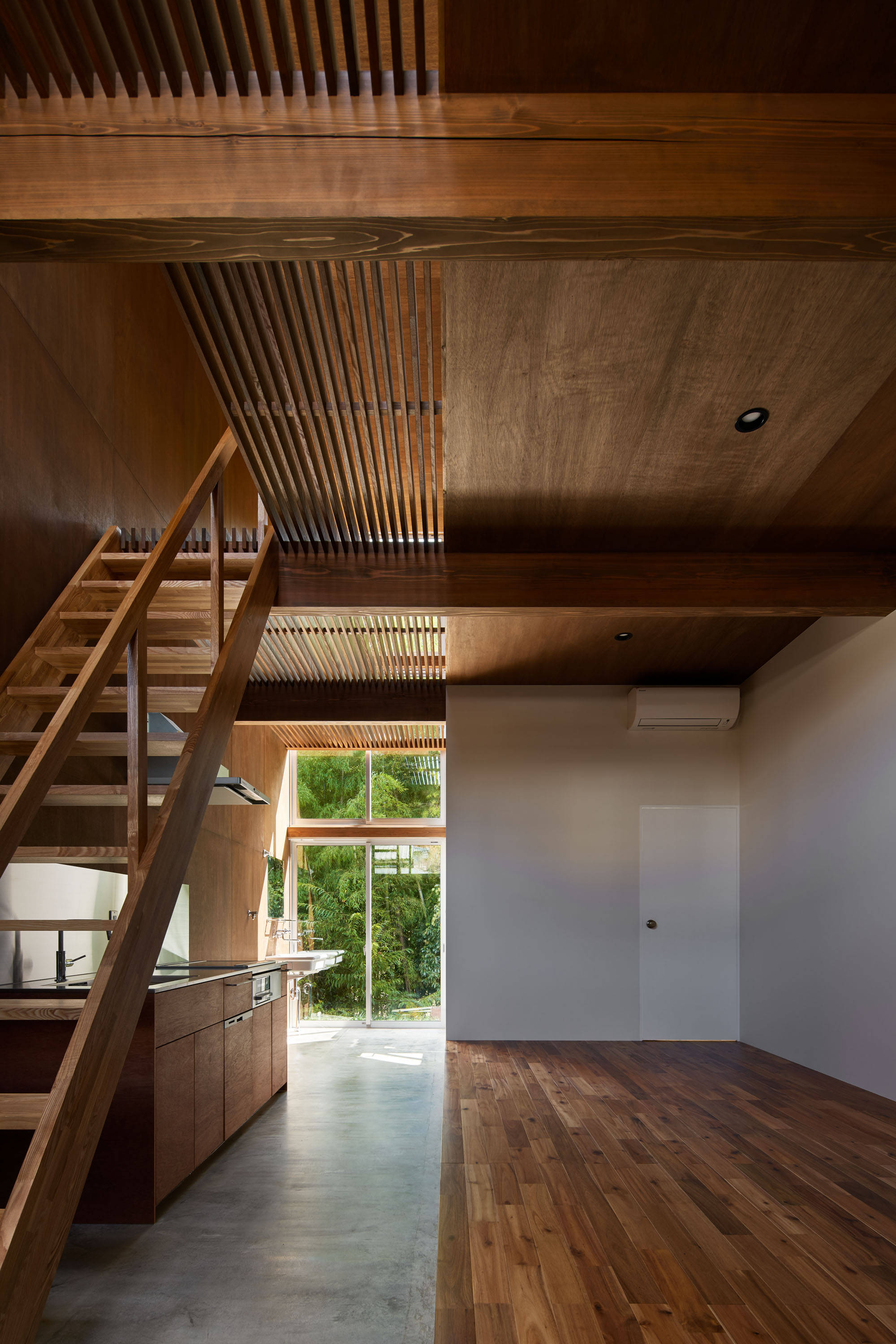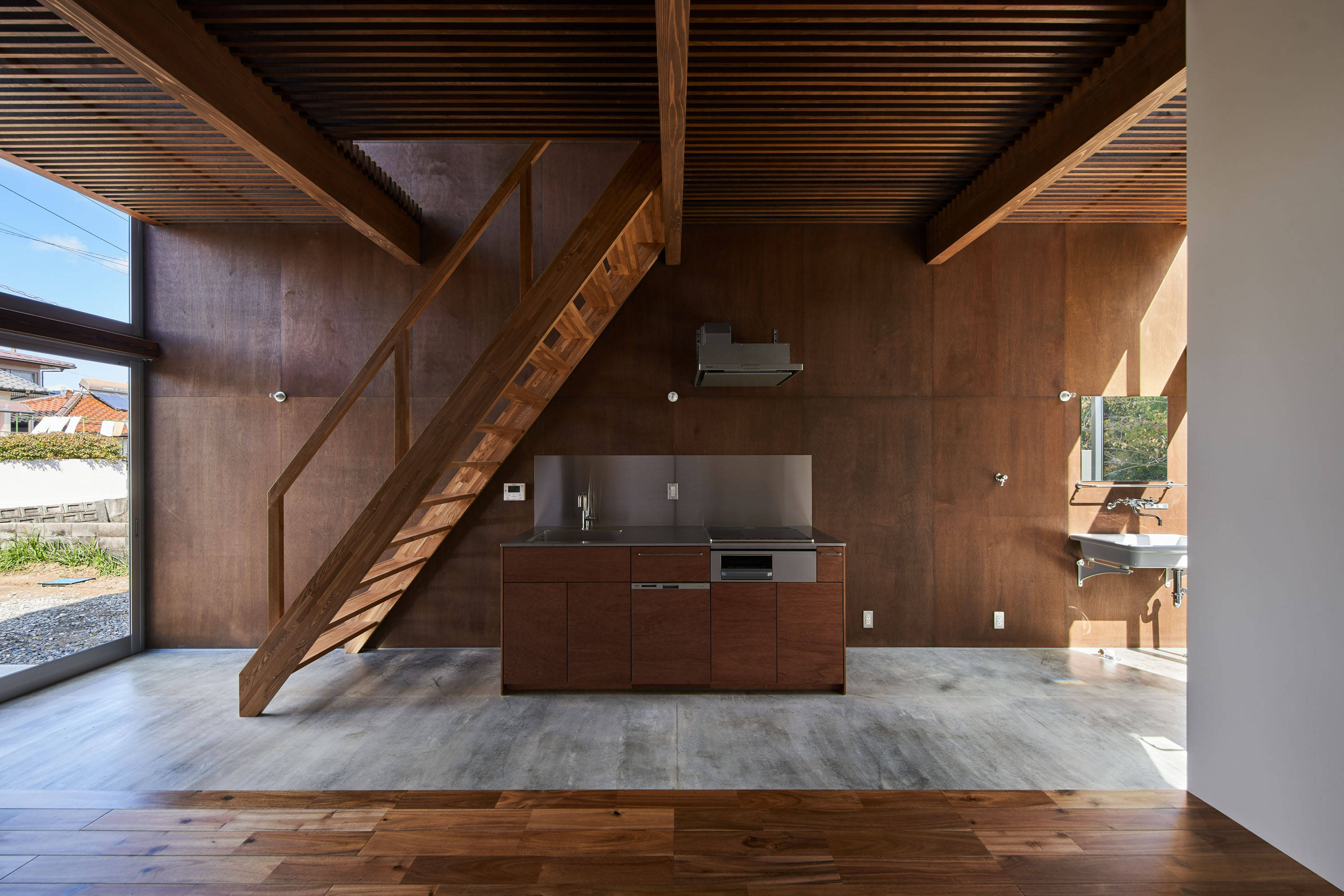 1階平面の約半分は基礎打ち土間仕上げとし、その上部の2階床を光の落ちるルーバー床とした。土間とルーバー床の接する短手壁に、トイレの換気窓を除くこの家全てのサッシ6枚を集中して設けた。階を跨いで設けられたサッシは、それ自体が手摺となり余分なディテールとコストを排除した。また、この住宅では「集める」ということについて考えた。窓を集め、明るさを集め、開放感を集め、抜けを集めた。