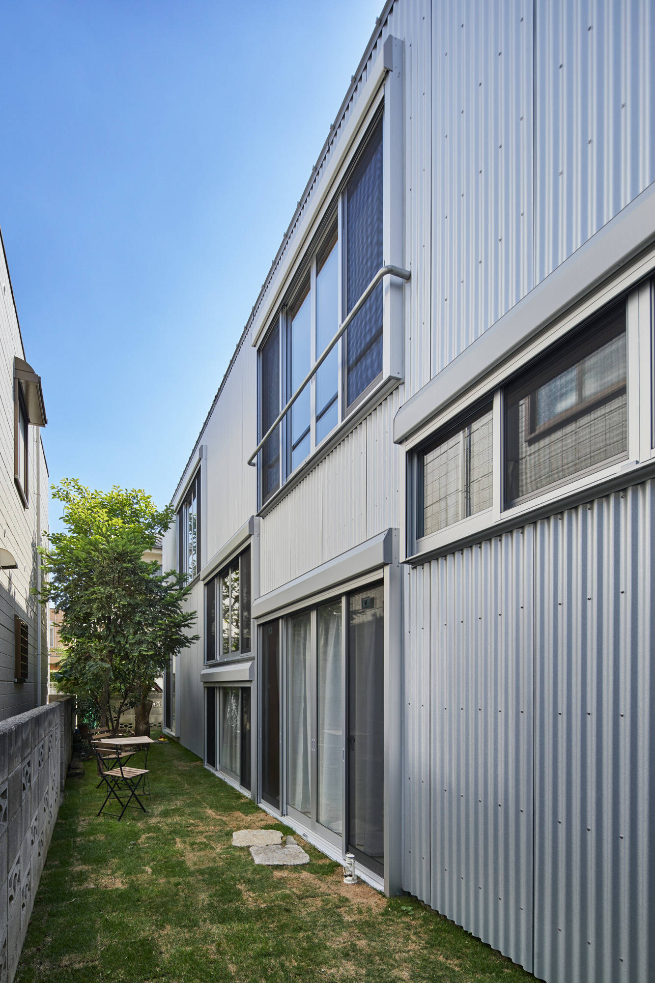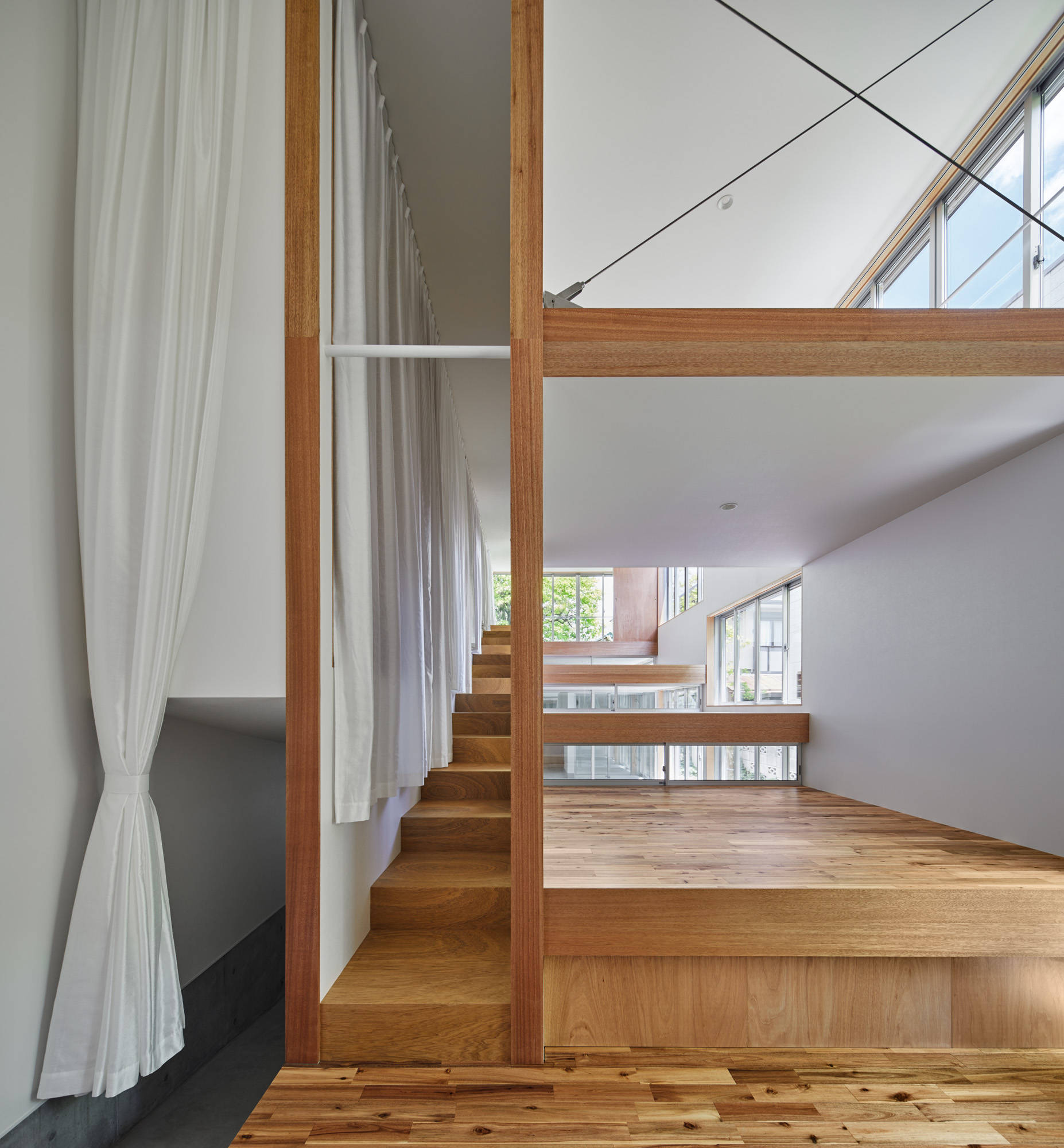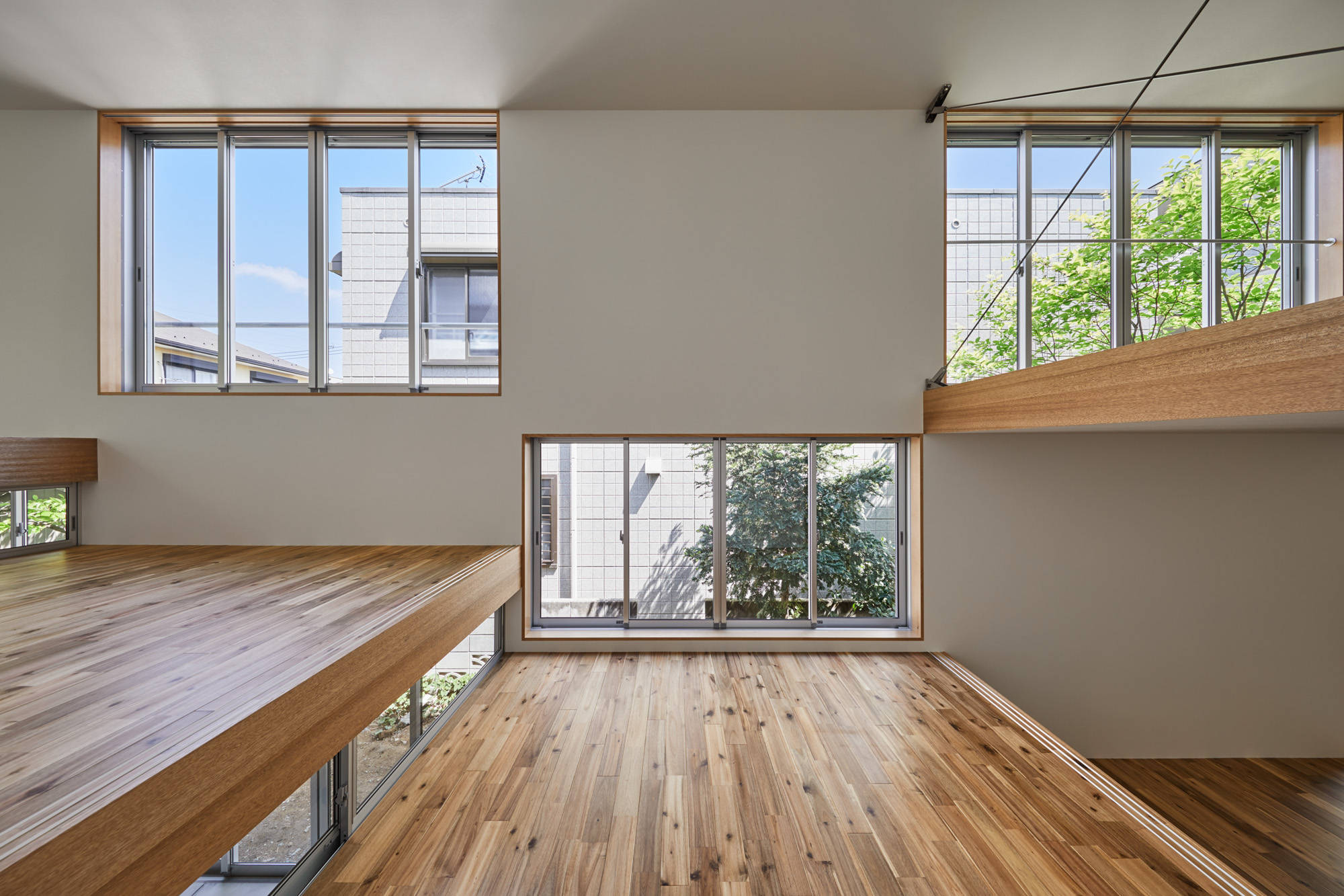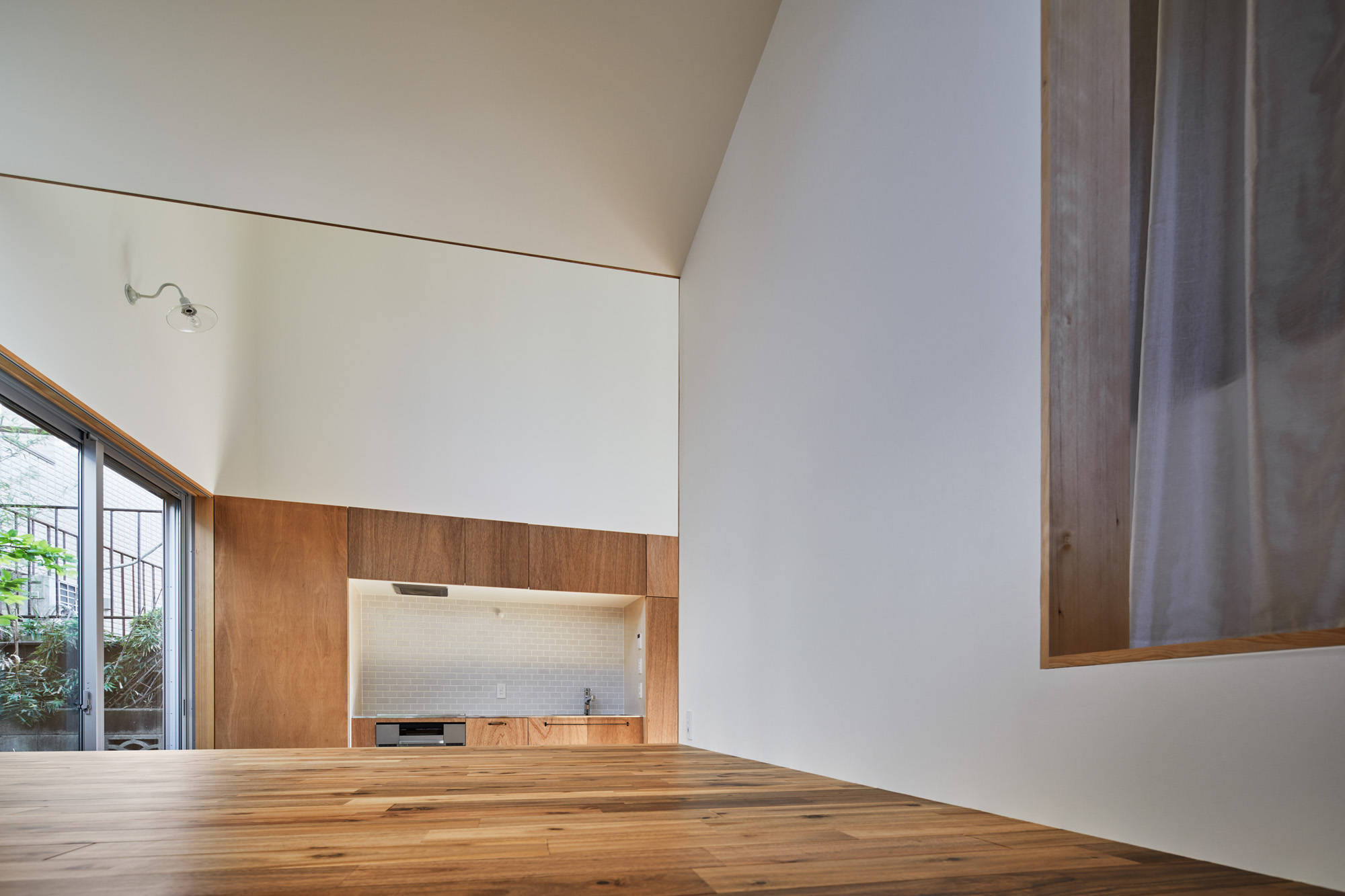 そこで、細長い敷地をあえて細長く分割し、東に光の落ちる庭を取った。そして、更に細長く、千切りをするように、東から、部屋、階段、スロープと建物のボリュームを縦に三分割した。そうする事で、全ての部屋はその庭に面する事ができ、庭からの光を享受できる。また、細長い敷地に対して、庭、部屋、階段、廊下をあえて細長くすることで、一般的なスケールの住宅には無い「長さ」や「距離」が感じられる、ちょっと遠い場所が生まれる。