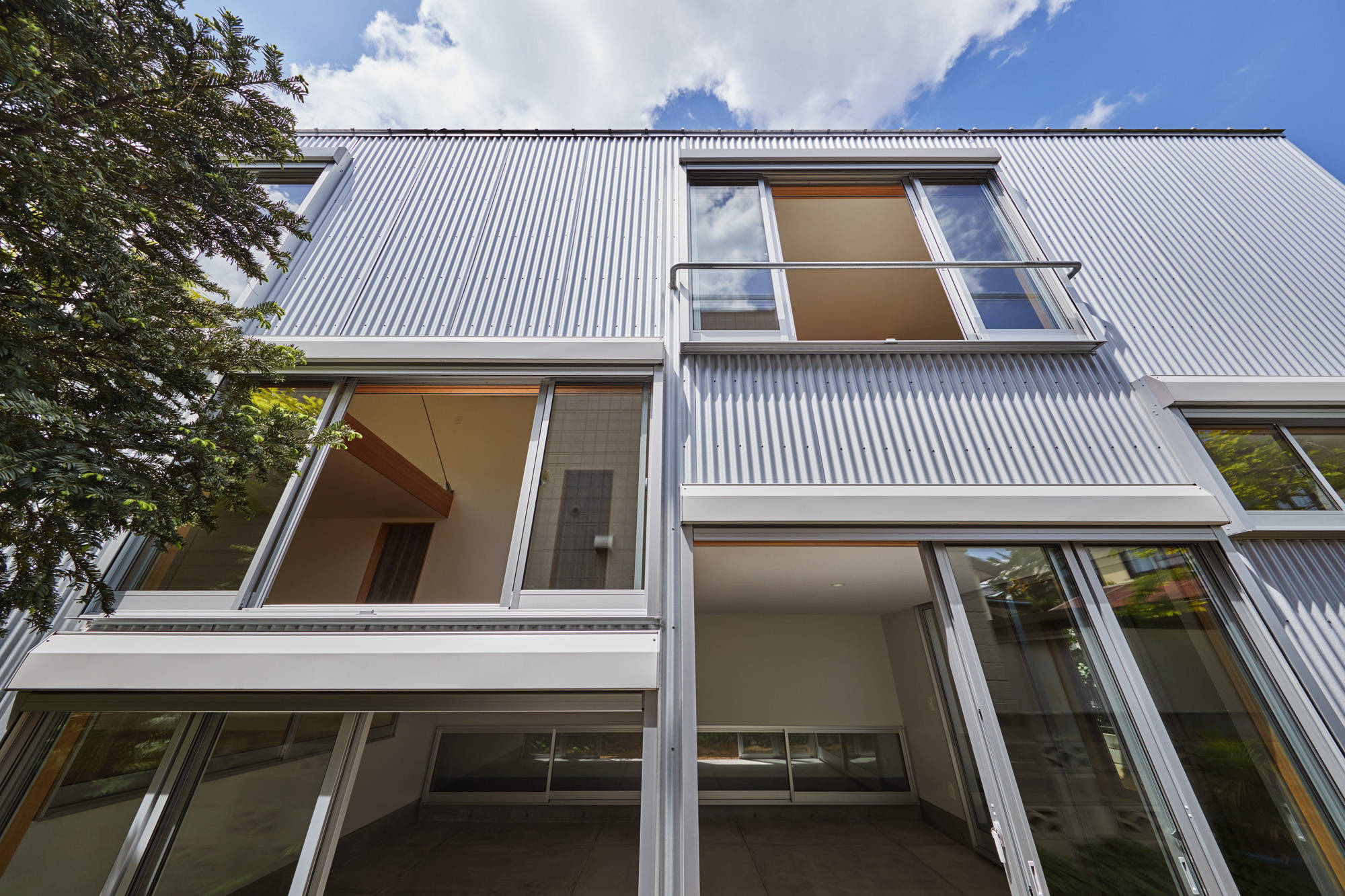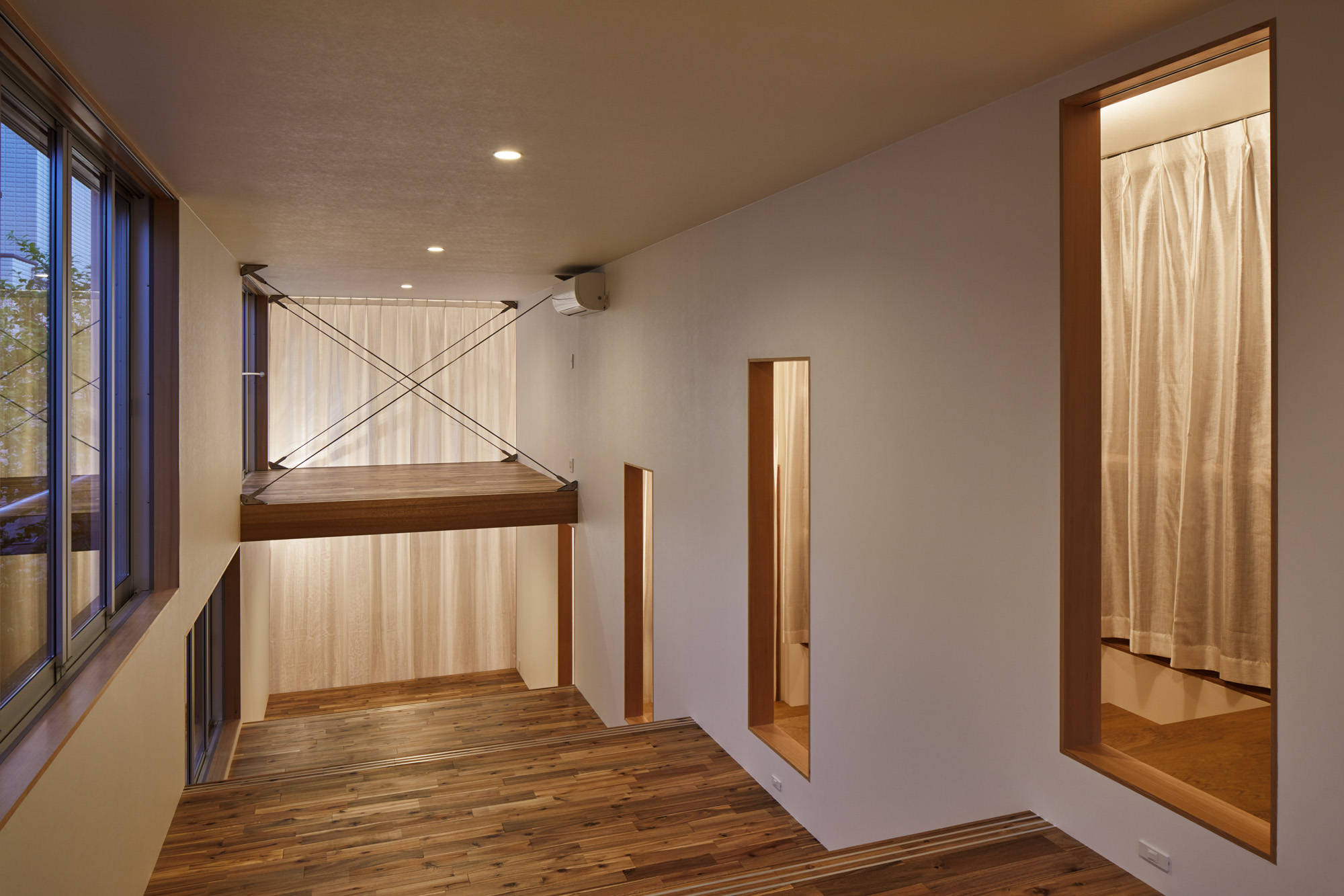 この窓には一般的なアルミサッシを使用した。現代の日本の住宅で欠かせなくなったアルミサッシは、特別な意味を持つに至ったと思う。それは内部と外部を間仕切る絶対的な境界。安価で施工も容易い絶対的な境界を、内部と外部、表と裏、水回りと床下に、ヒエラルキー無く多用する事で、無意識に刷り込まれた境界線を曖昧にする。表と裏の世界、ぼやけた境界、段々畑のようなスキップフロア、坂道のような階段、トンネルのようなスロープ、小さな箱に詰め込まれた様々な要素が谷を明るく照らしてくれる。