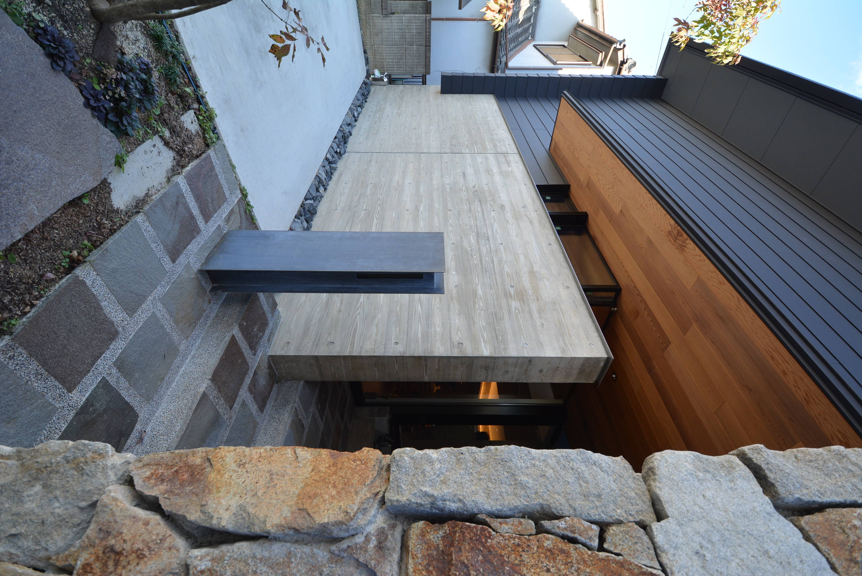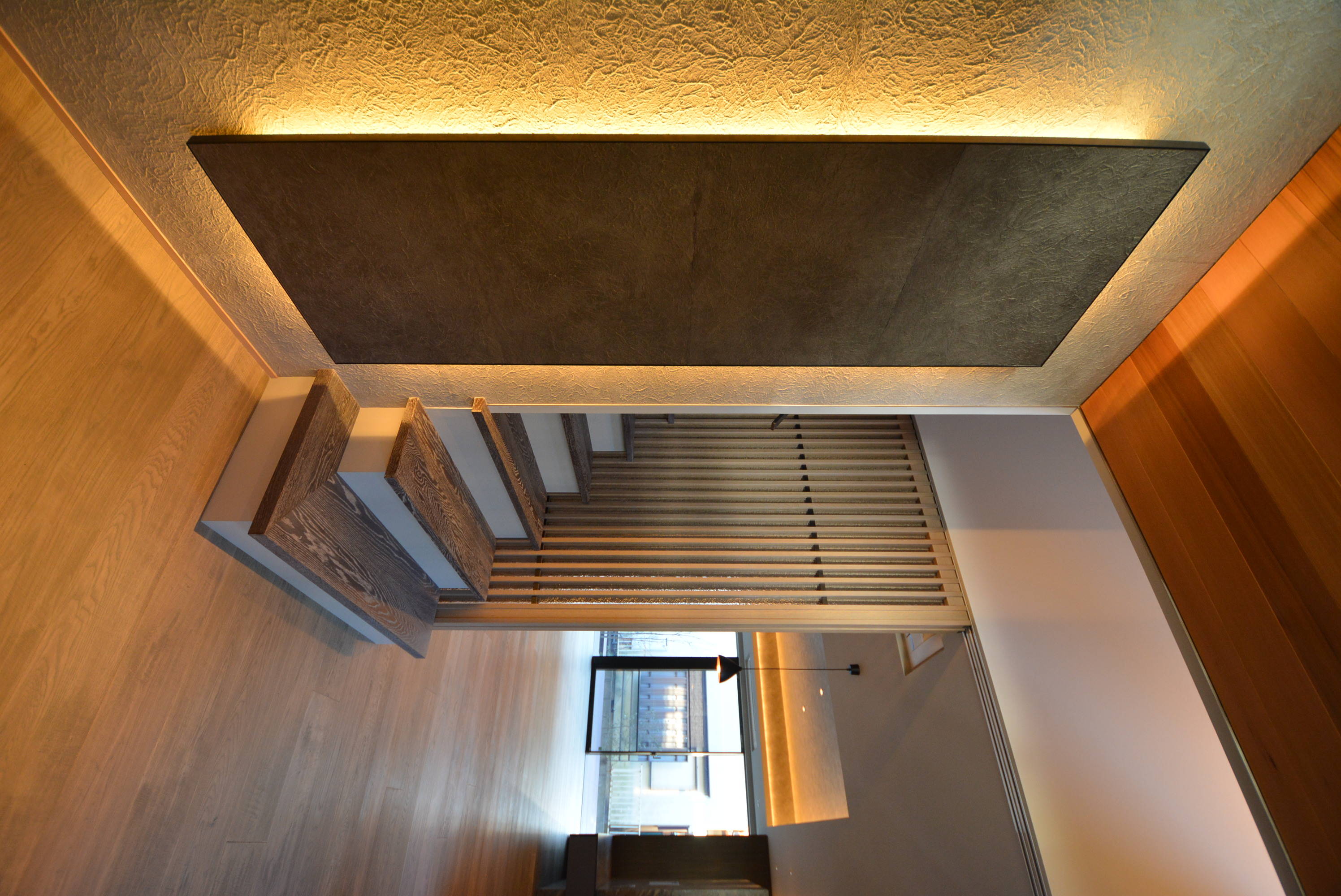 駐車場横のアプローチから玄関へ進むと、野面積みの塀がどっしりと出迎える。更にその塀に沿って中へ進んだ先には坪庭、回り込むようにして玄関がある。ガラス張りで構成されたこの空間は内からも外からもお互いの様子が分かる。アプローチの重厚感や坪庭の緑が内部にまで取り込まれ、南側に設けた庭との緑が繋がった。視線と風の抜けも感じられる一体の空間となり、暗くなりがちな北側の玄関にも光が届くこととなった。