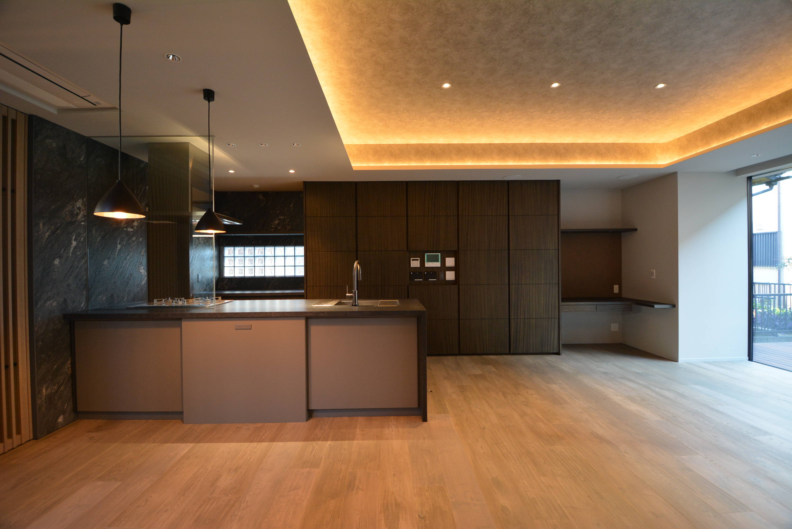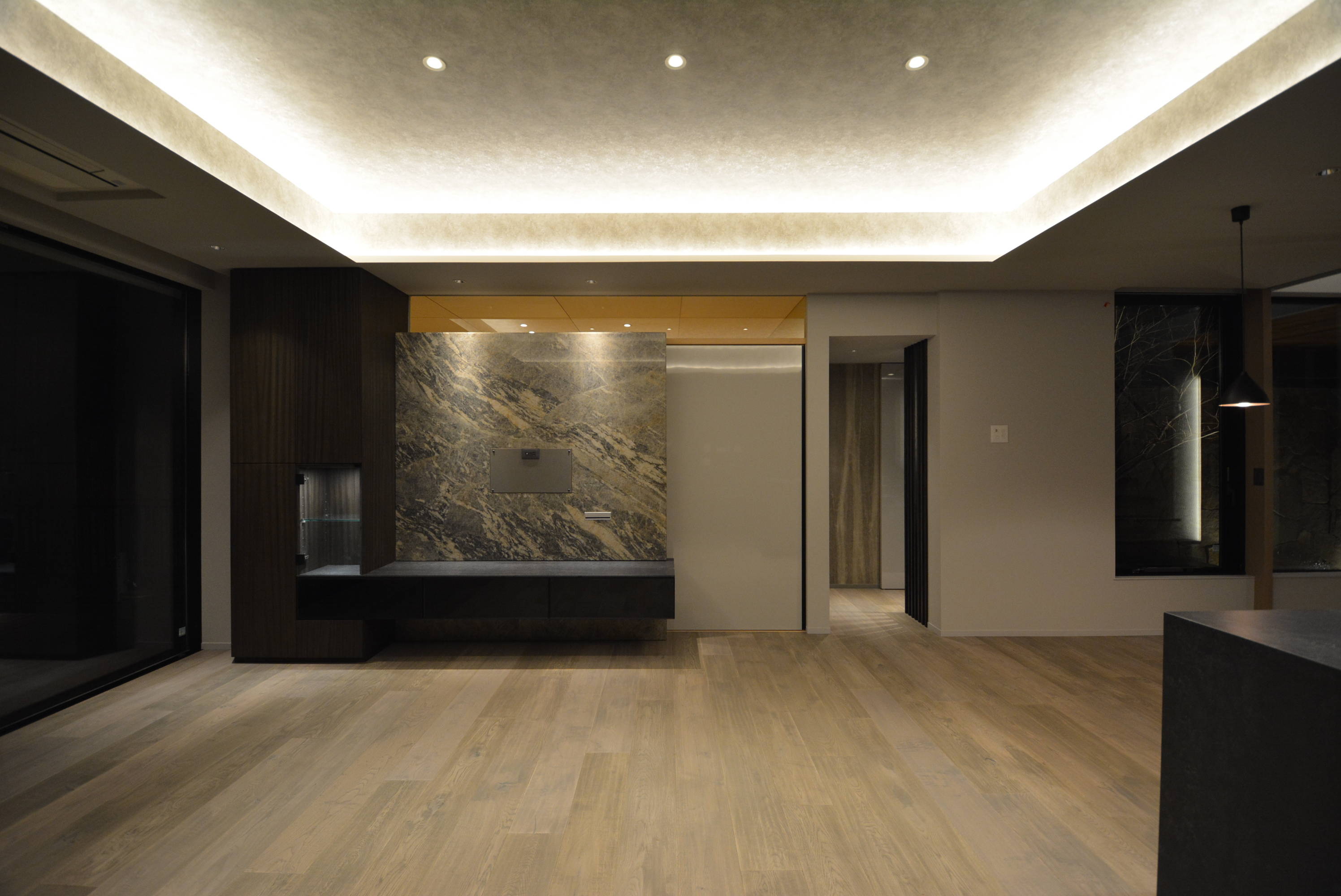 様々な材質の組み合わせにより非日常のような空間が広がるが、天井に埋め込まれた間接照明の明かりや、庭の緑が緊張感を和らげる。そして外部との緩やかな距離感も日々の暮らしを穏やかなものにしている。