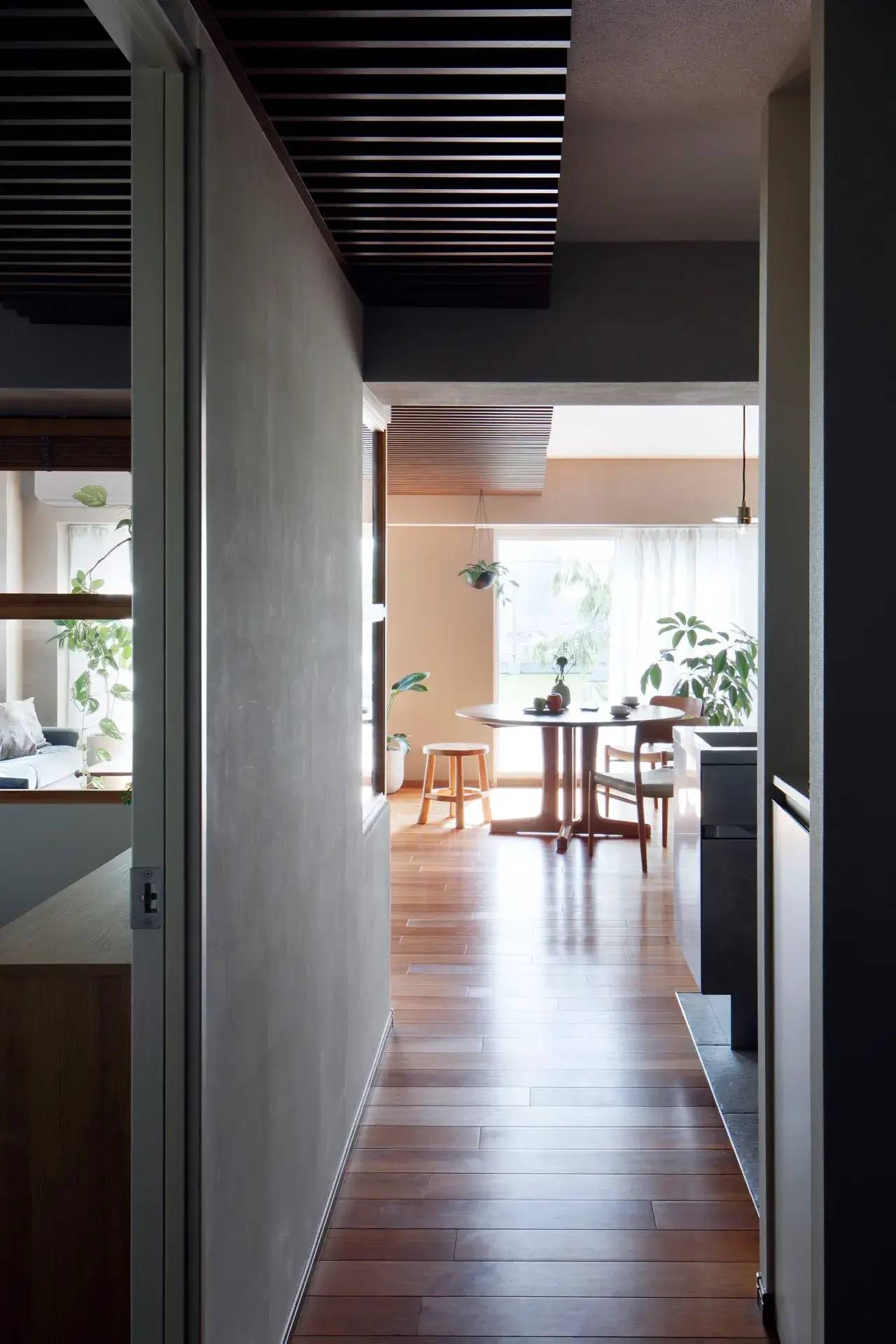 パーゴラは、廊下や寝室やリビングに対して外部環境を示唆し、リビングから庭へフラットに続いていく床によって、リビングを屋外と連続した「中庭」として意識できるようにしている。