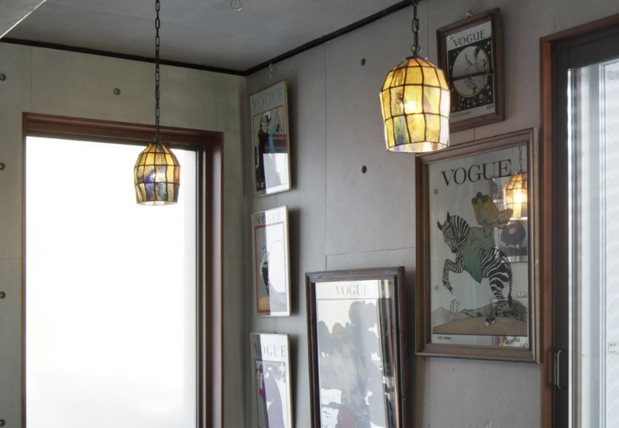 内部仕上げは、コンクリートに対して、棚やベンチ、建具枠は、コートブラシや木製ハンガーにも使われているマホガニーを組み合わせ、紳士服や洋裁道具にも馴染む素材にしている。
