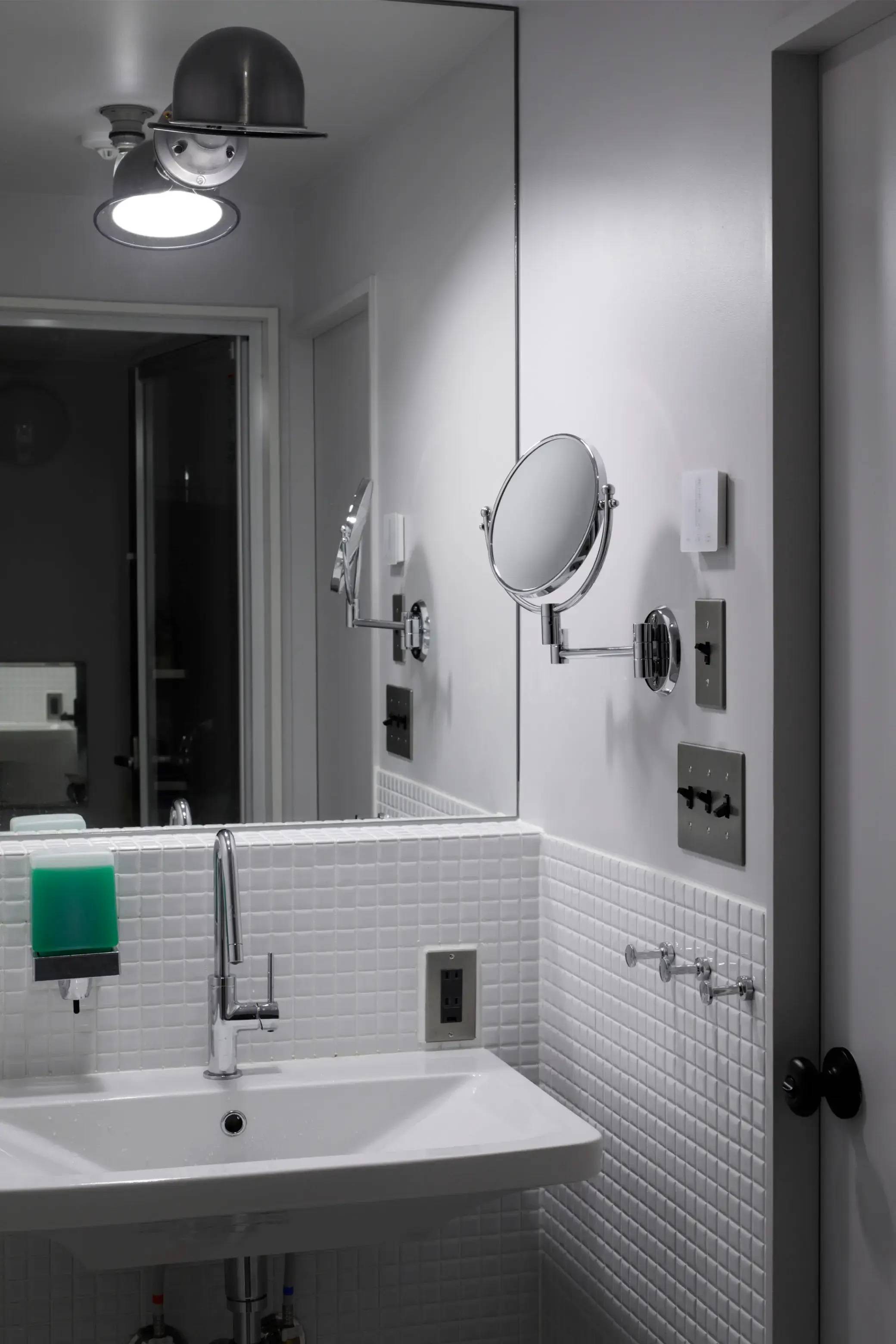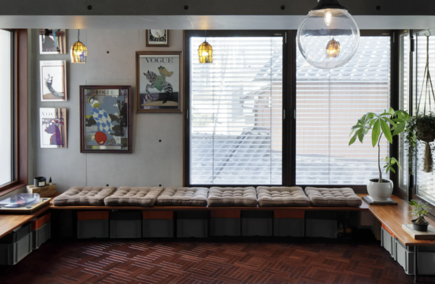 部屋の南側には民家が面し、座ると民家の瓦屋根越しに空に視線が抜ける魅力的な場所だった。ご主人が植栽の好きな方だったため、南側の不整形に飛び出したニッチなスペースを活用し、ここに長いベンチを設えて、縁側のように、明るく内部と外部の中間的な領域にした。ベンチから続くバルコニーの床をベンチと同じ高さにし、中のベンチが外まで伸びていく感覚を与え、住まい手に内外横断した空間の広がりを与えている。