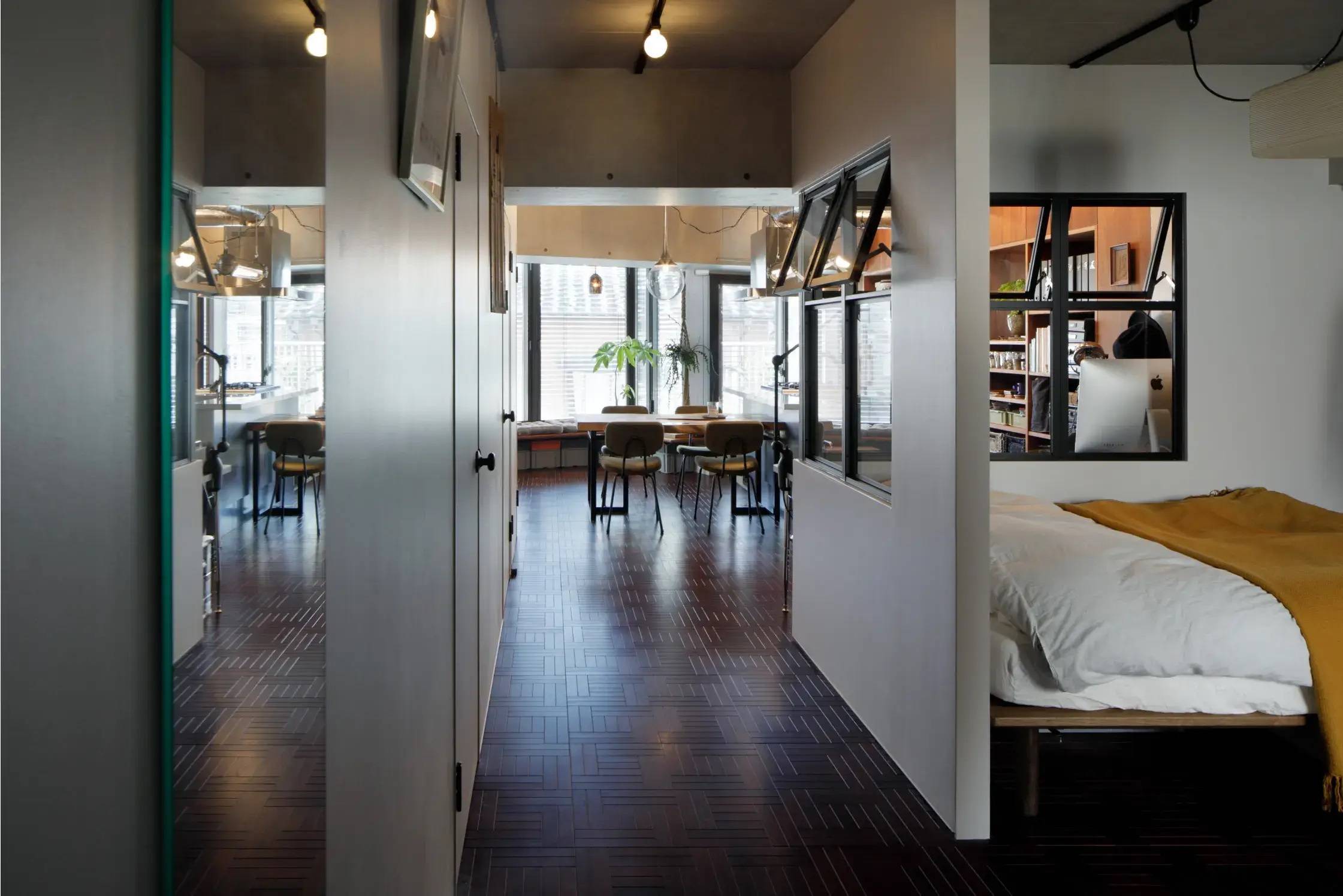 建物が外断熱式で計画されていたことから、内部をコンクリート打ち放し仕上げとすることで、コンクリートの蓄熱・輻射熱性能を効果的に利用でき、年間を通して気温を一定に保つ心地よい温熱環境になっている。また、最小限のエネルギーで全体を空調できるよう、居住スペースはひと続きの空間にし、店舗利用する際にも大規模な改修工事をせずに転用できるようにした。