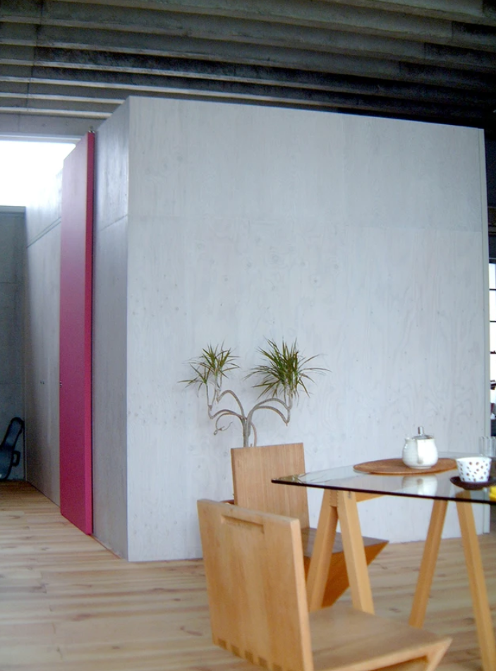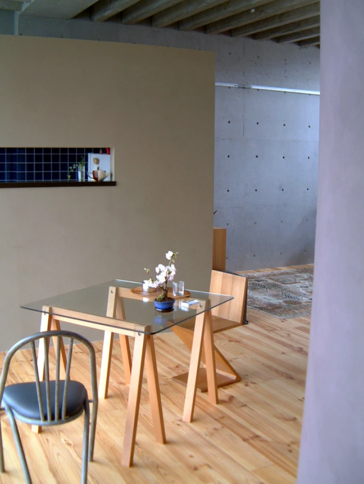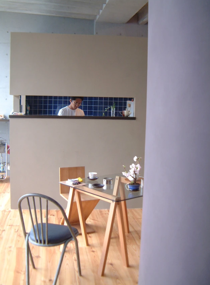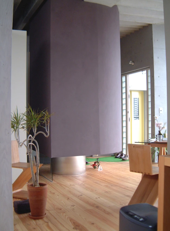 キッチン・トイレ・浴室の3つのヴォリュームを空間に配置することで、溜りのある連続した空間を作り出し、生活のシーンに合わせて、いろいろな使い方ができるようなルーズな空間の連鎖を用意しました。