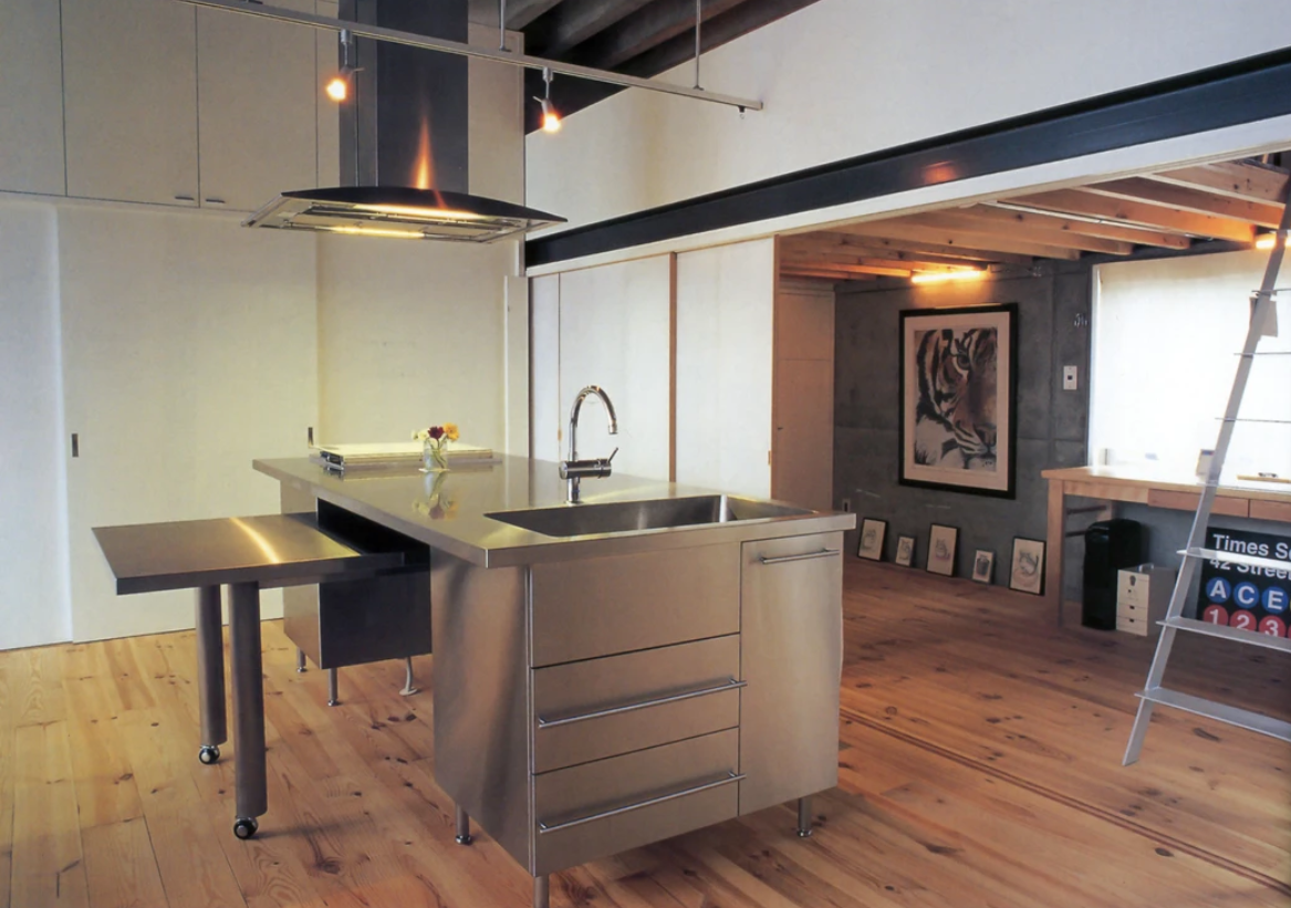 ニューヨークのロフトのようなおおらかな空間にしたいという施主の要望に対して、幅の広い無垢のフローリングを張った大きなワンルームをデザインした。