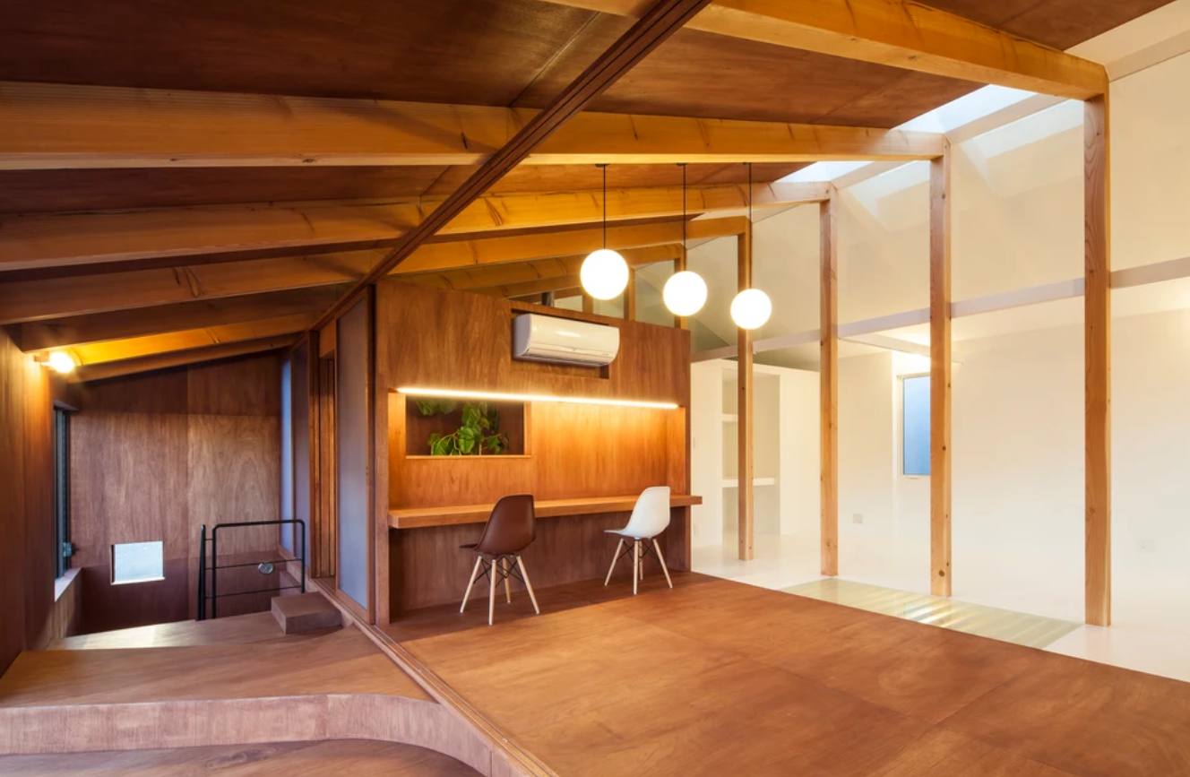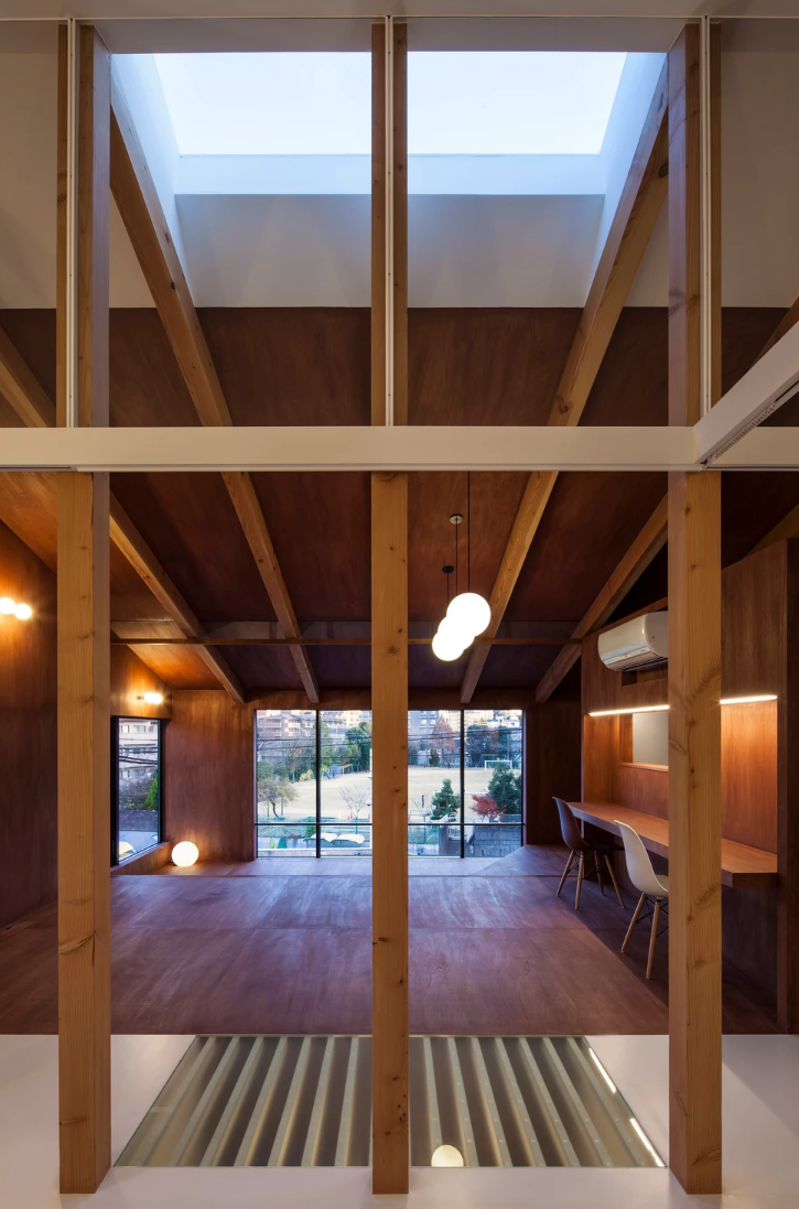 その結果、明快な構成であるにも関わらず、どの要素に意識が向かうかで空間認識が常に揺れ動く多様に解釈可能な場が生まれた。共有 /プライーベートの各スペースは整理されつつもその境は曖昧化される。 自立した各要素が互いの領域を浸食し合いながら同居するこの独特の一室性は、ご家族の価値観の投影として浮かび上がる。