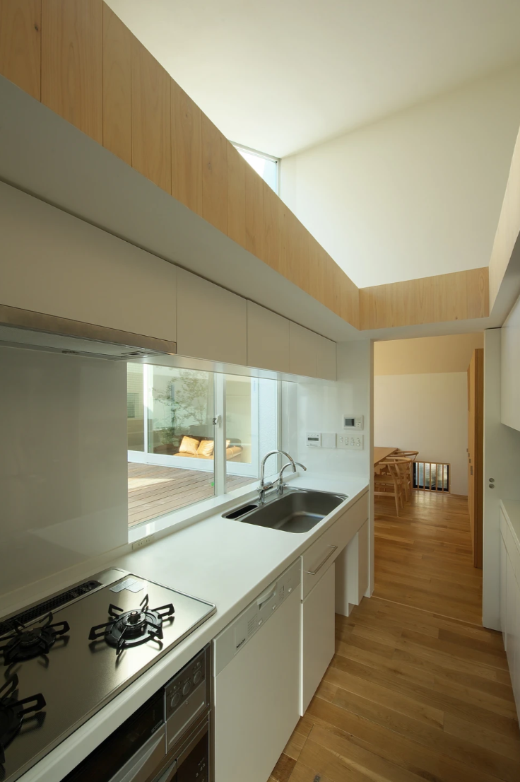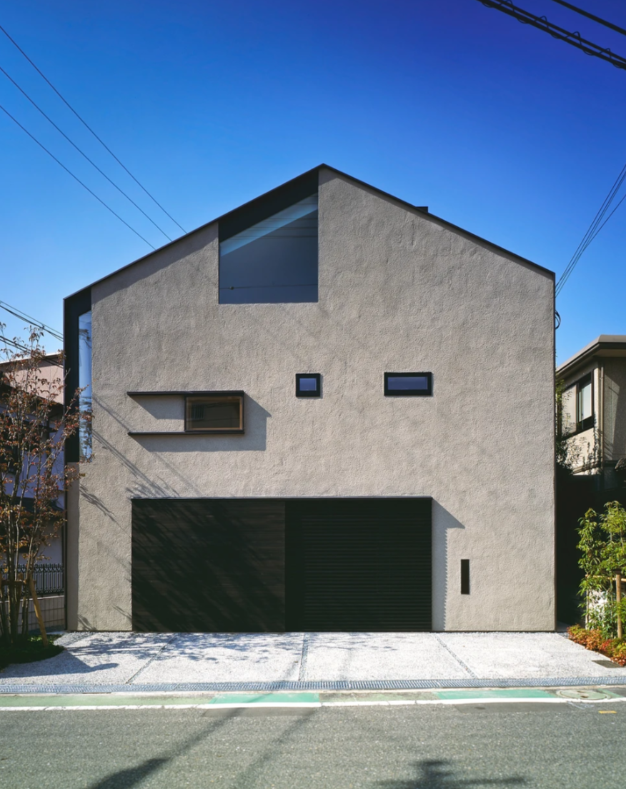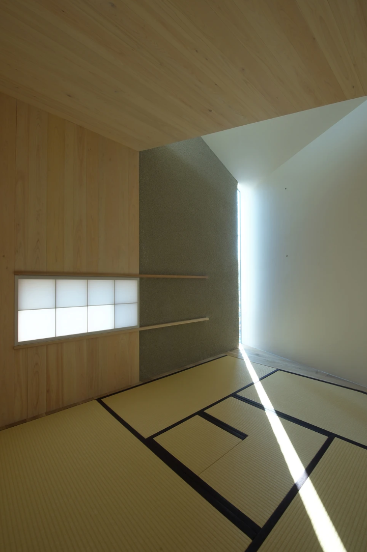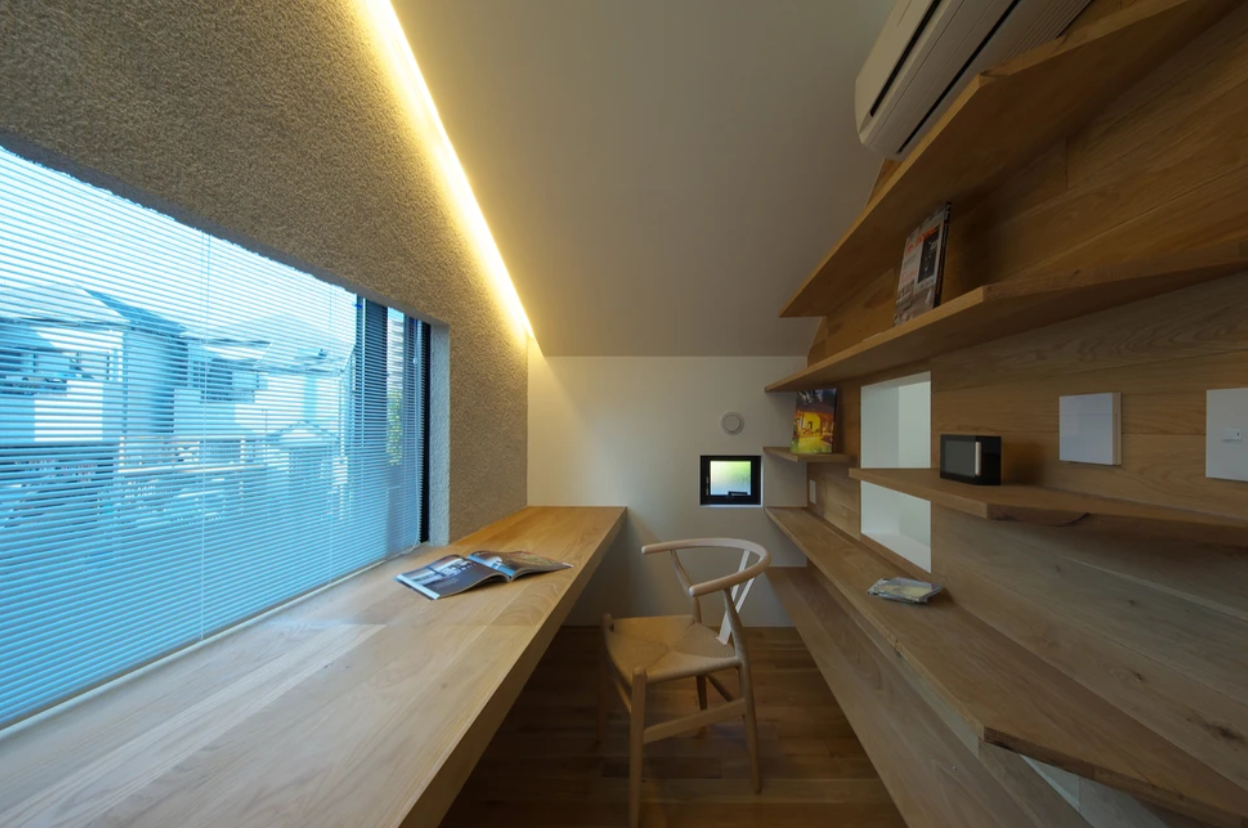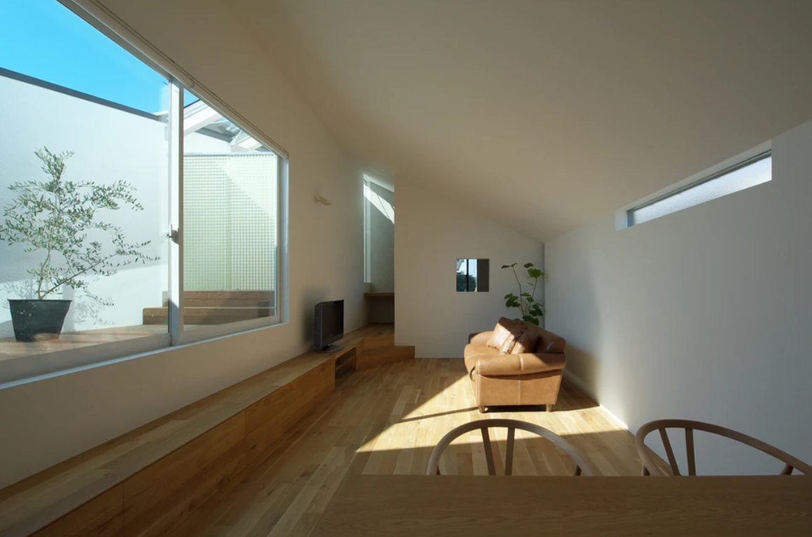 隣接するマンションからの視線や北側隣地に対する日照への配慮や将来的な周辺環境の変化などに対応する形態として、家型の一辺を敷地なりに斜めに切り落としたボリュームが導き出されました。