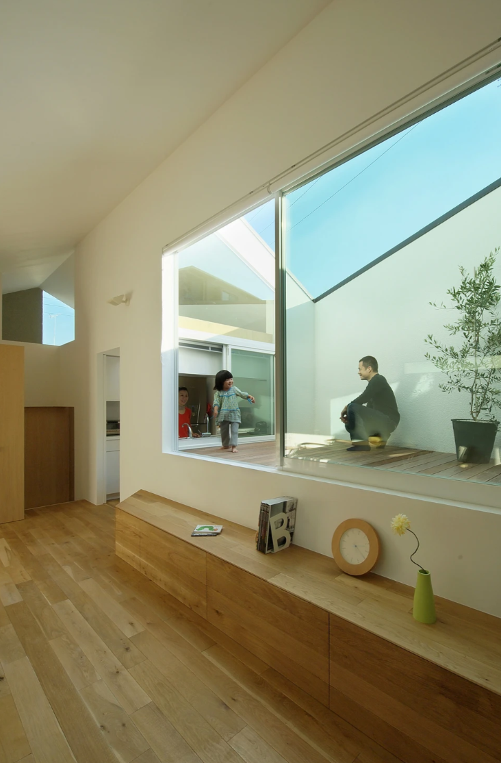 リビングは外部と直接ではなくワンクッションおいて繋がることで適度な距離が保たれ、カーテンやブラインドをしなくてもプライバシーを気にせずにゆったりとくつろいで過ごせるようになっています。
