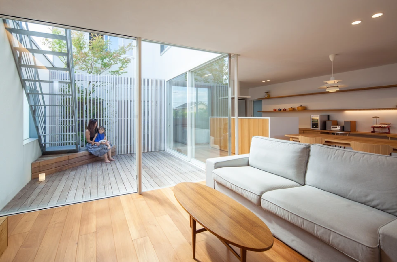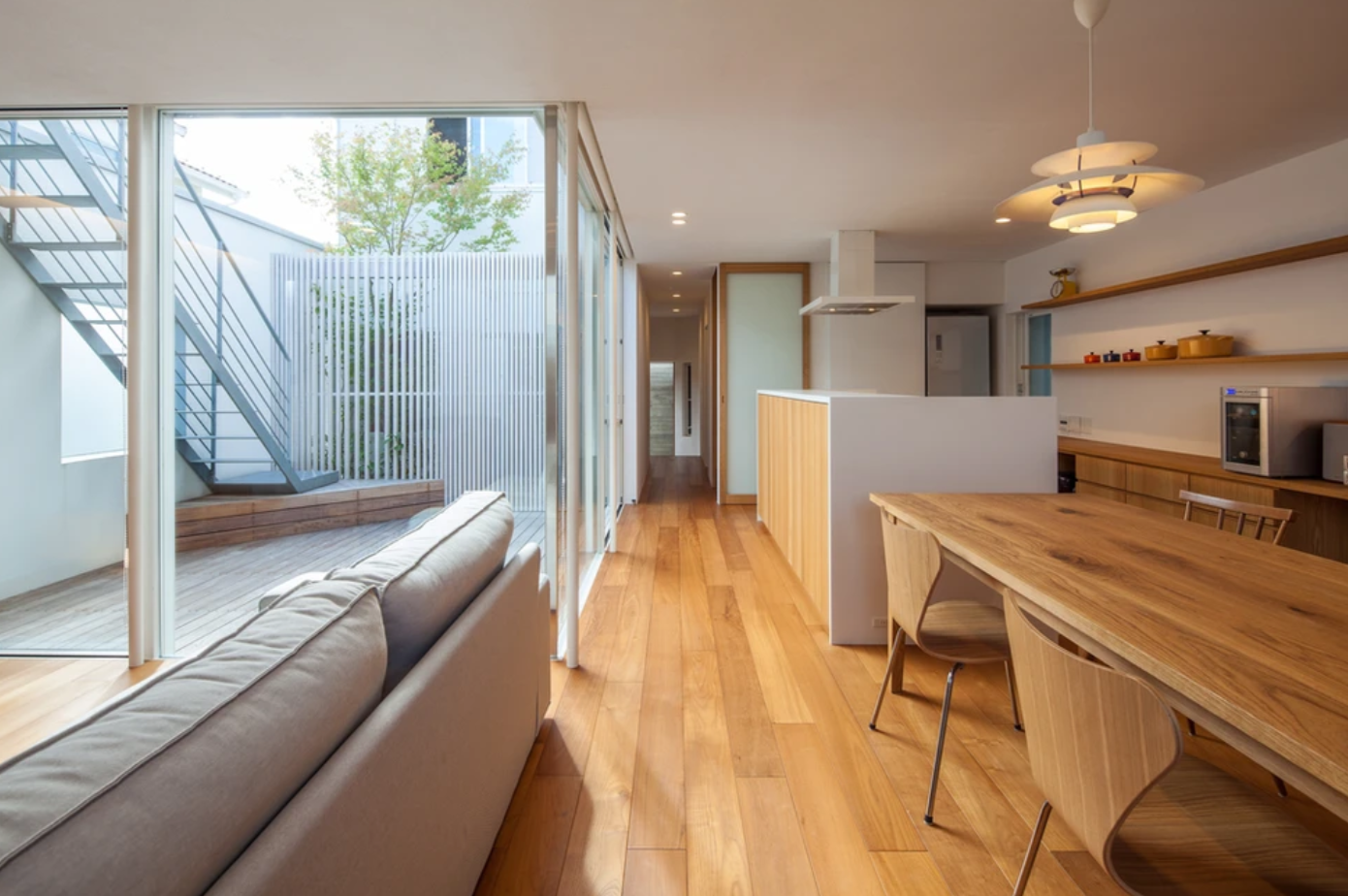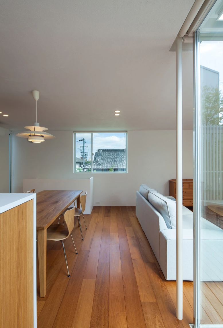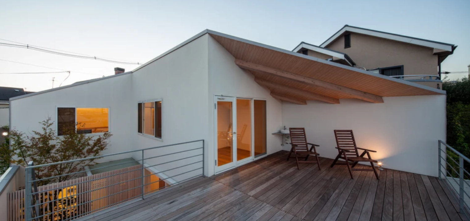 趣きの異なる上下のテラスが階段で立体的につながっており、家の内外を自由に回遊することができます。クライアントの希望もふまえて 1階だけでも生活が成り立つ構成としつつ、敷地の特性を活かした造りの住宅になっています。