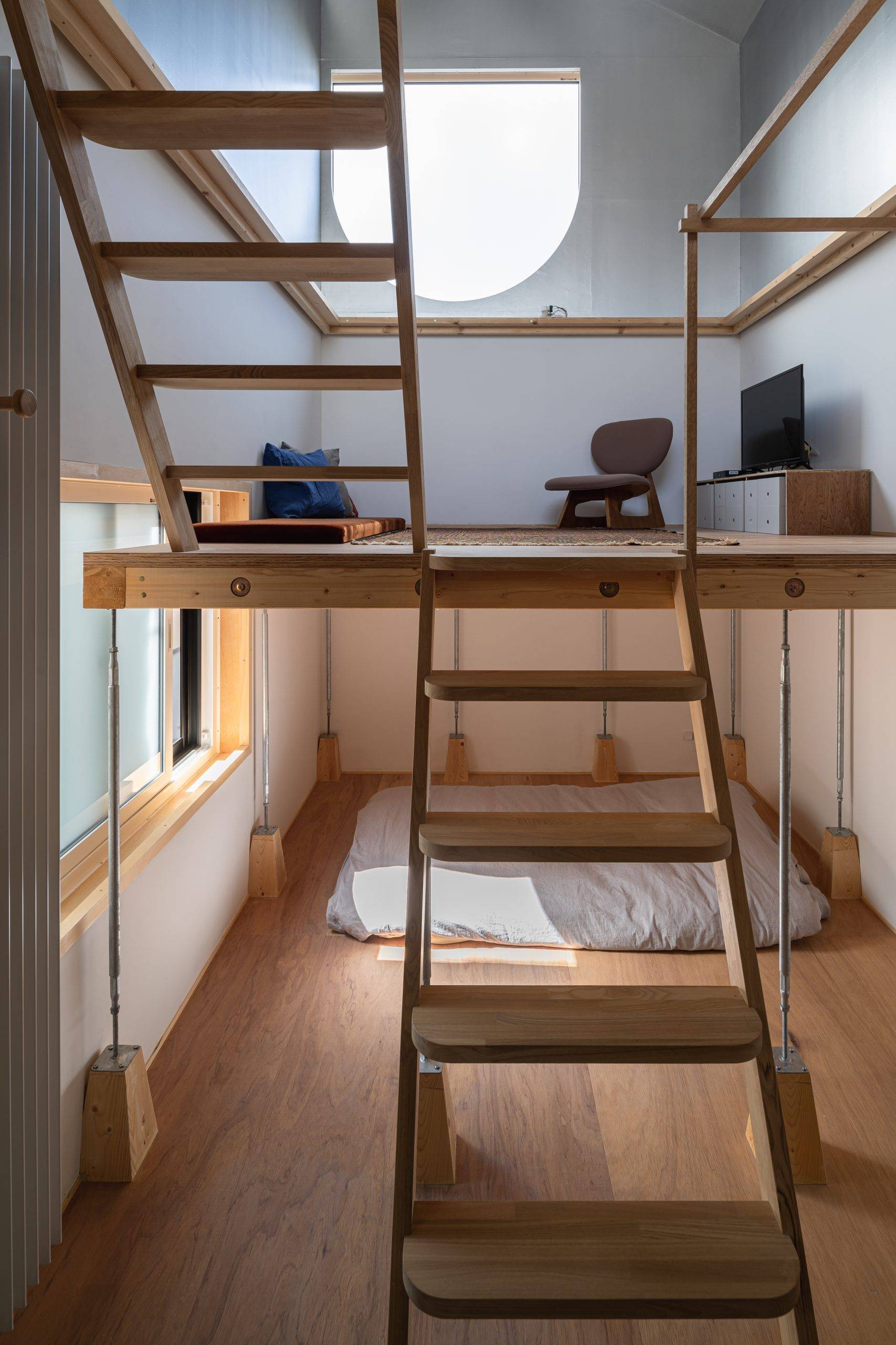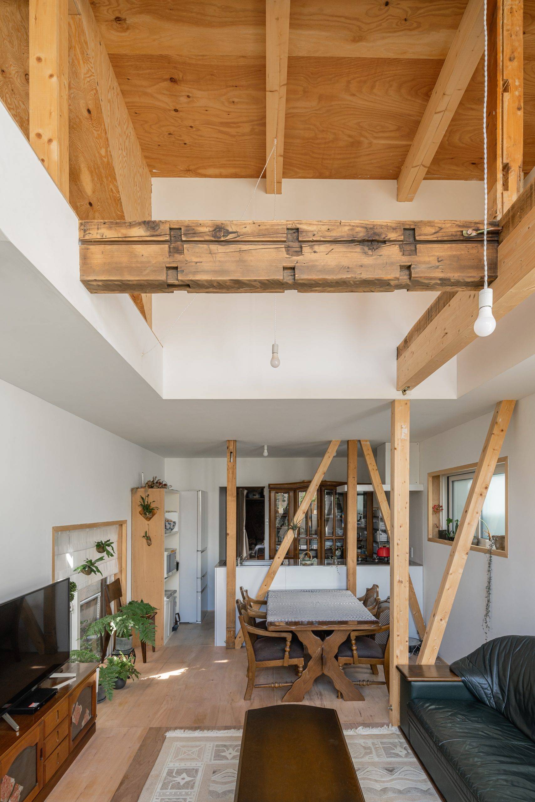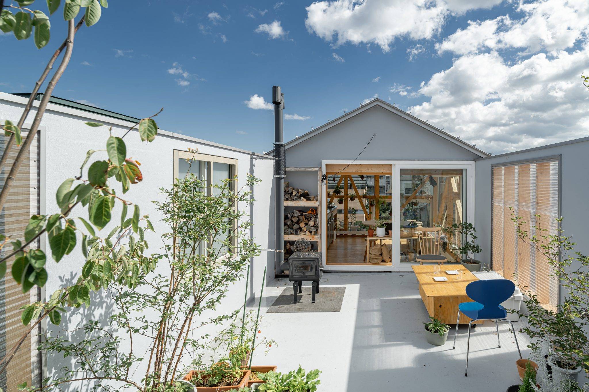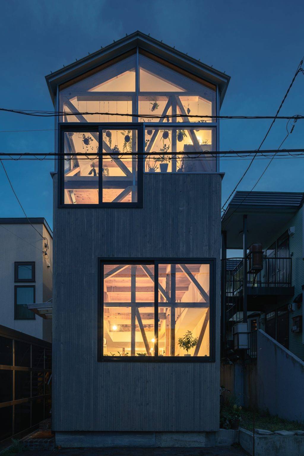 既存建物は、部屋が小分けにされ、窓のない部屋もあり、断熱材も湿気により性能を失っていた。建蔽率を超えて違法増築されていたので、そこを減築し、平面的にも断面的にも改修して、既存屋上に三角屋根の小屋を2つ増築した。