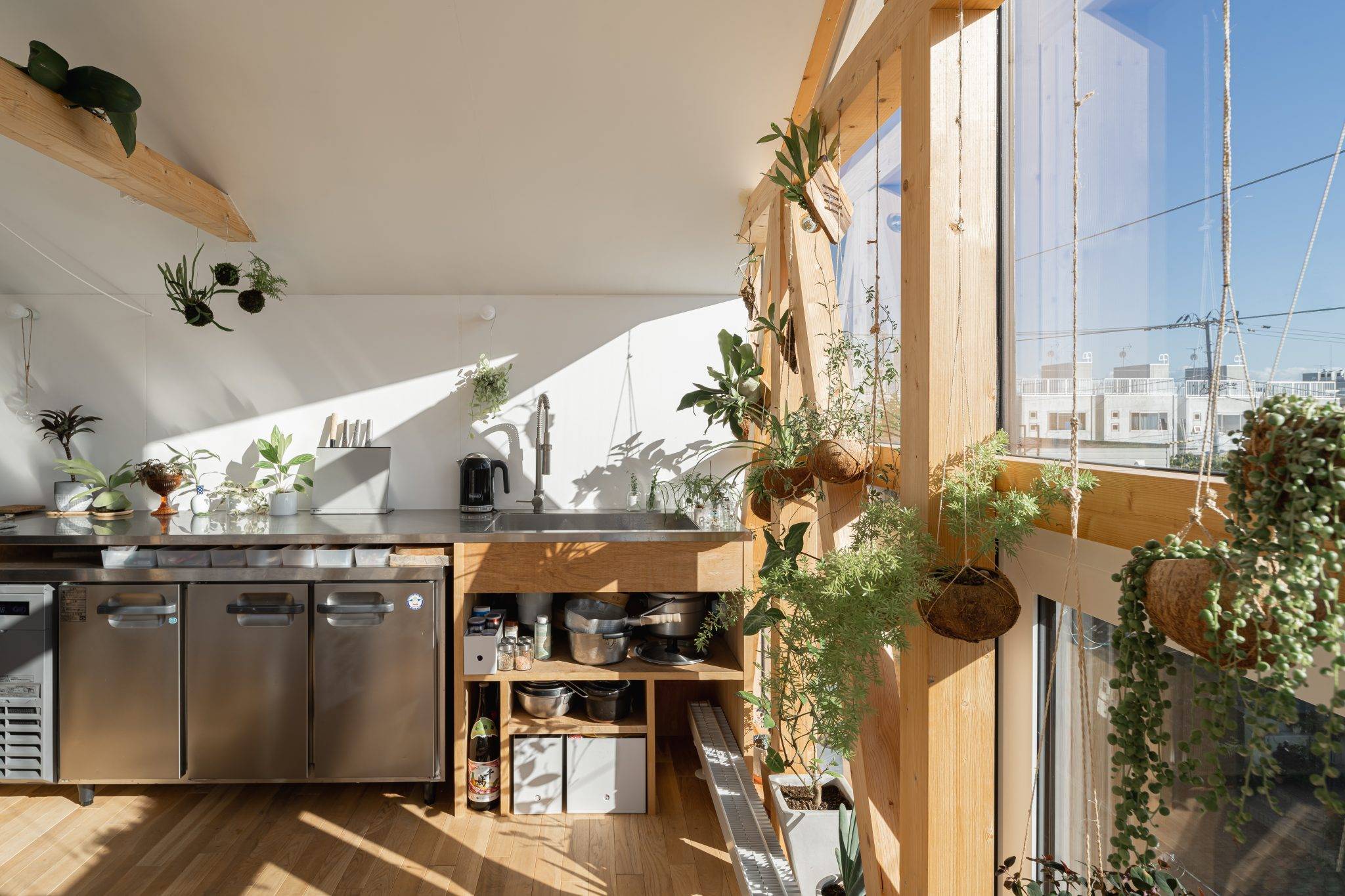 フロストガラスによって西日をキャッチし、ガラス面を発光させ、さらに壁と天井をシルバー塗装にすることで、その光を拡散・強調している。また、サッシの屋内側に仕上げを被せて窓枠を消し、西日の抽象度を高めた。ここでは1年を通して北海道の気候に合わせて窓の開け閉めを細かく調整したり、ノマド的に移動する必要があるため、微細な自然の変化を体感することができる。それは多少の手間の煩わしさ超えた生活の楽しみとなる。