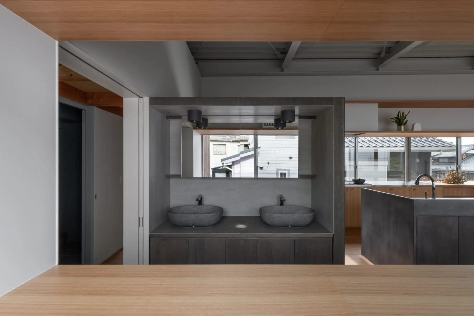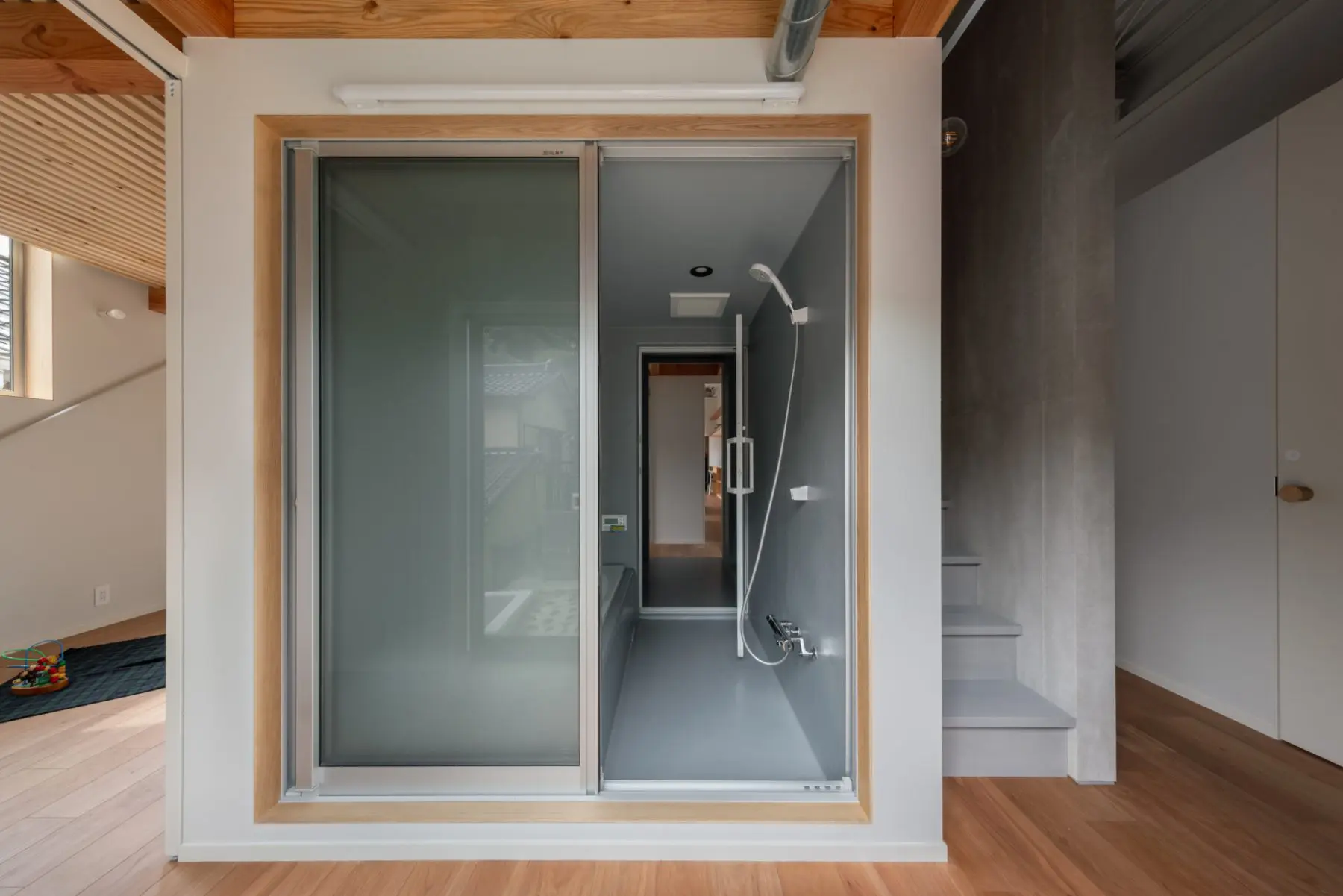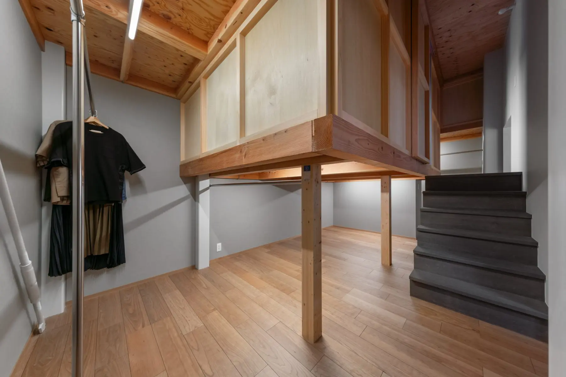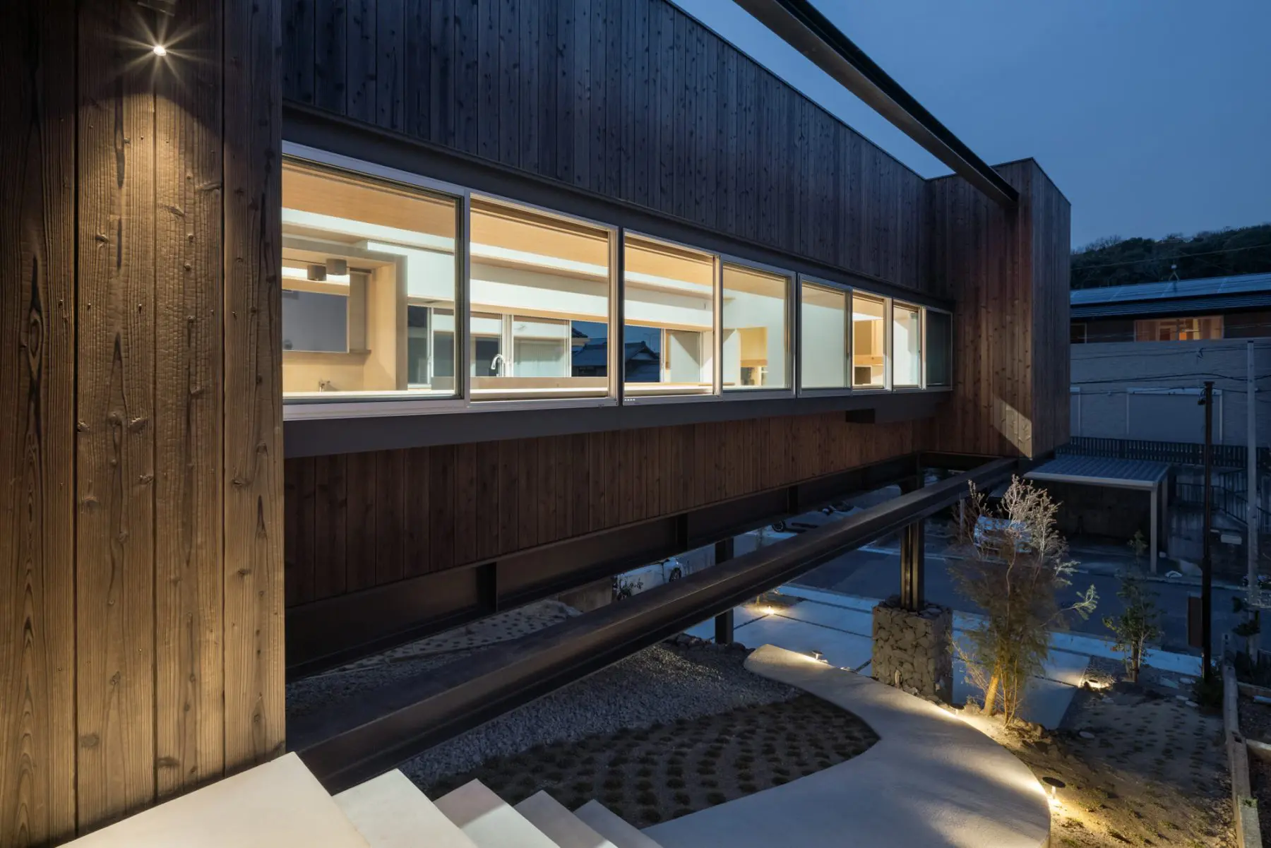 登っていく斜面地に建てる場合、敷地の傾斜に合わせ段々に床をつくっていく形式が多かったように思う。今回の建ち方は、崖上に入口があり斜面は行かない場所とする懸造のような形式と似ているが、入口は崖の低い方にある点で逆転している。斜面地に向き合う新しい解法であり、地上から開放された地の上に建つ住宅となった。