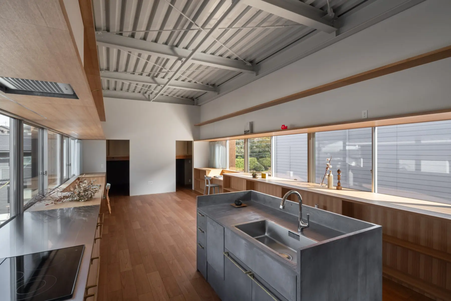 要望された各室の面積を満たそうとすると建蔽率をオーバーした。居住部を2層だと叶うが、3層では法規も厳しくなり、また建材の高騰時期と重なり平屋形式を採用している。吹き抜けの要望があったLDKは平屋ながら3.8mと高い天井高を維持している。また希望面積確保のため両端部は寝室、収納、水回りを2層とし、階数に含まないロフトとした。さらに緑化率とのせめぎあいからLDKの幅を狭め、I型の平面とし、建築面積に入らない出窓を設けることで平面的に広げ、伸びやかな内部空間を獲得している。