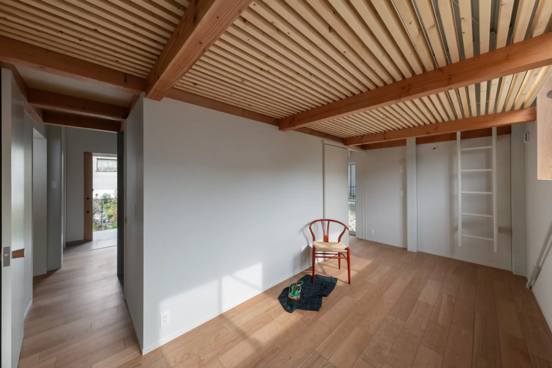 そこで、畑だった特徴を活かし高低差をおおよそそのままに住宅をもち上げた。地上をピロティと緑化の場所にし、地上に水平の広がりを獲得している。玄関は敷地奥に配置し、緑化された場所を通らなければいけない。庭だと荒れていても気にならないかもしれないが、毎日通る道であれば手入れもしたくなるだろうし、ピロティであれば天候問わず子供と遊びたくなるかもしれない。
