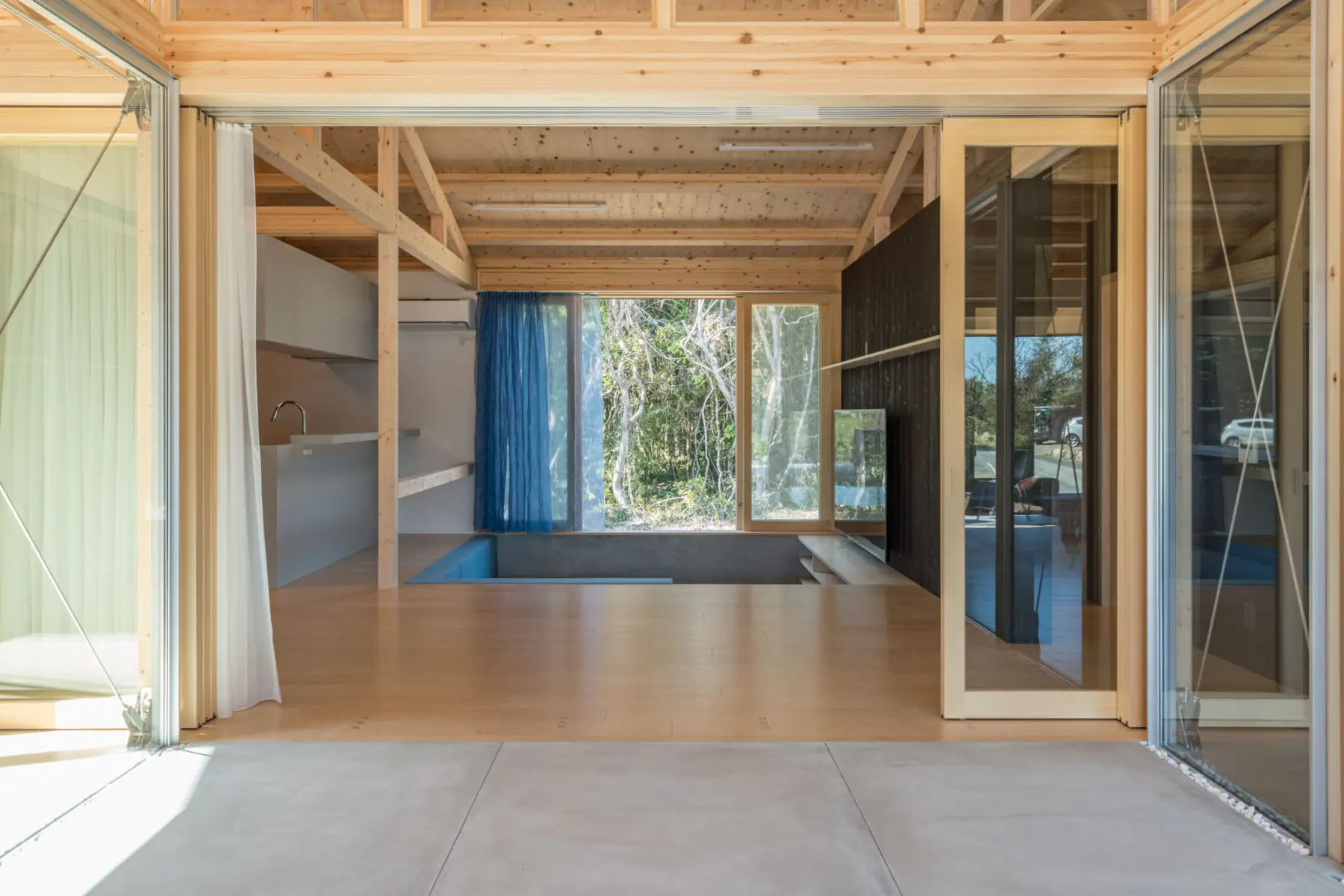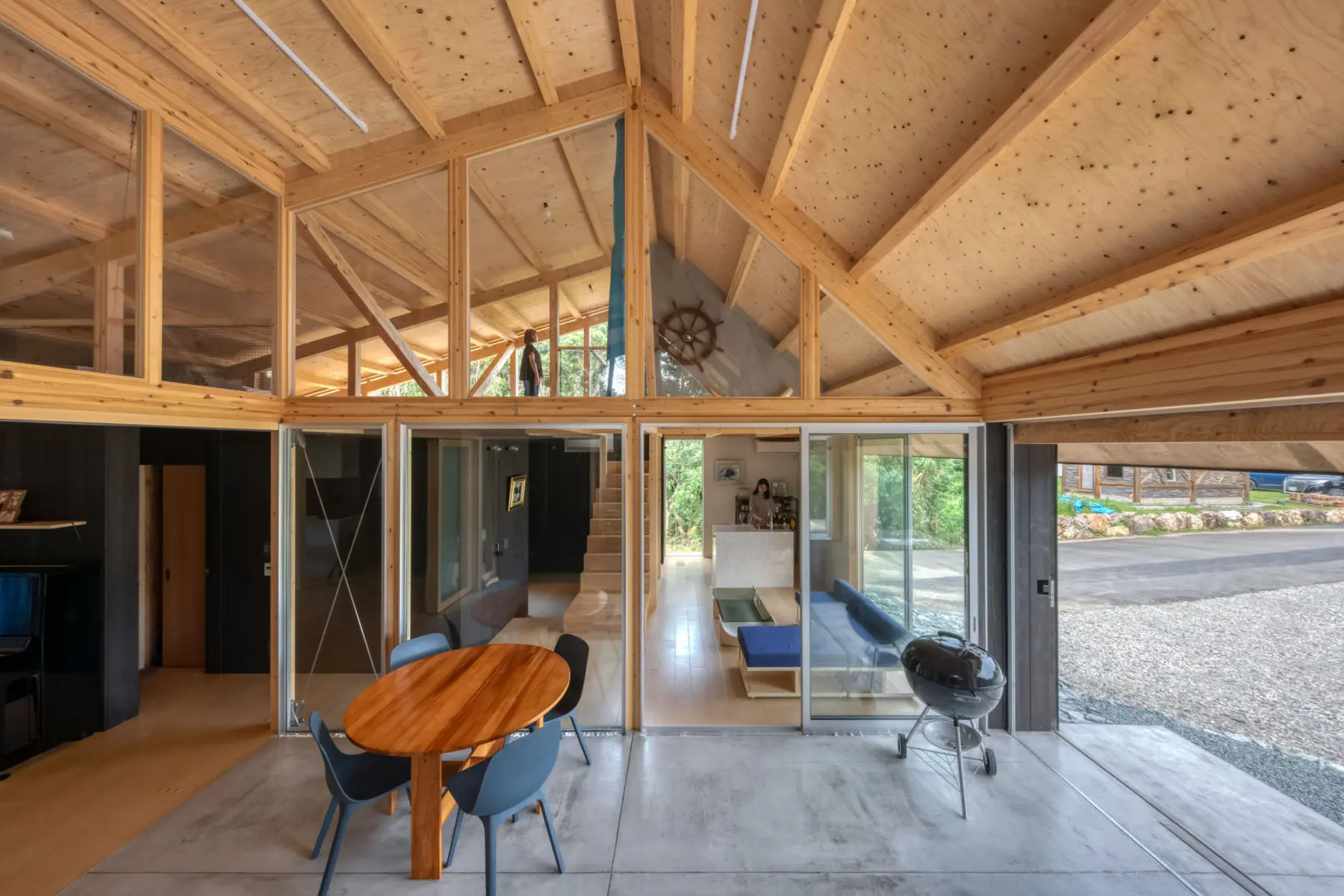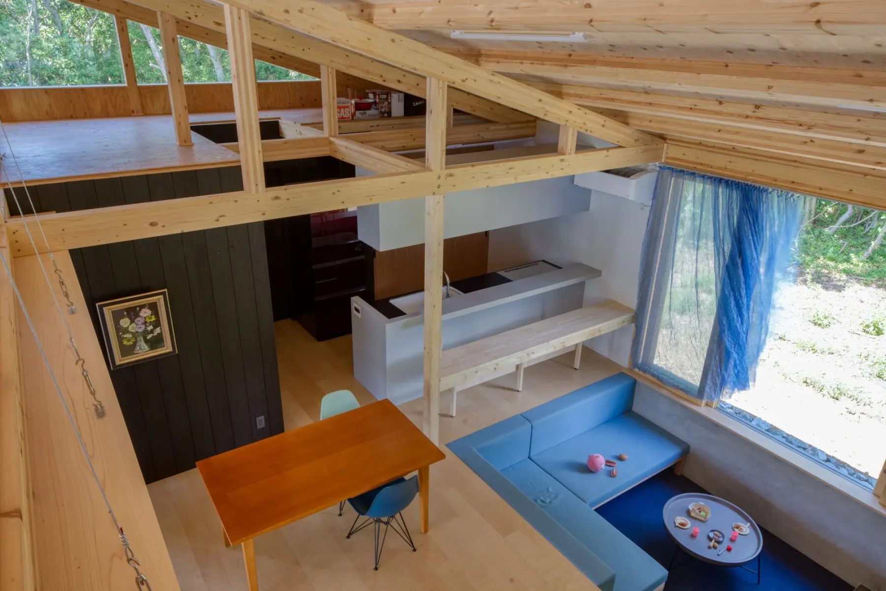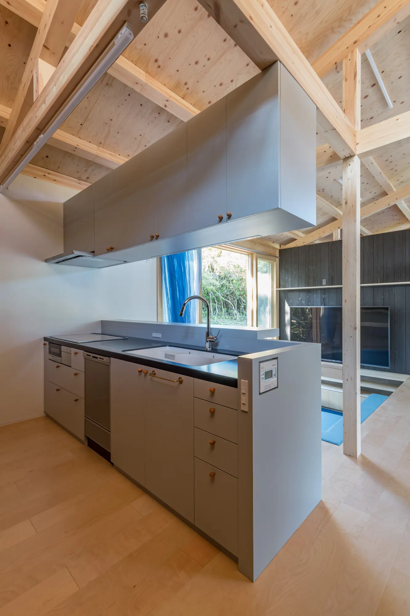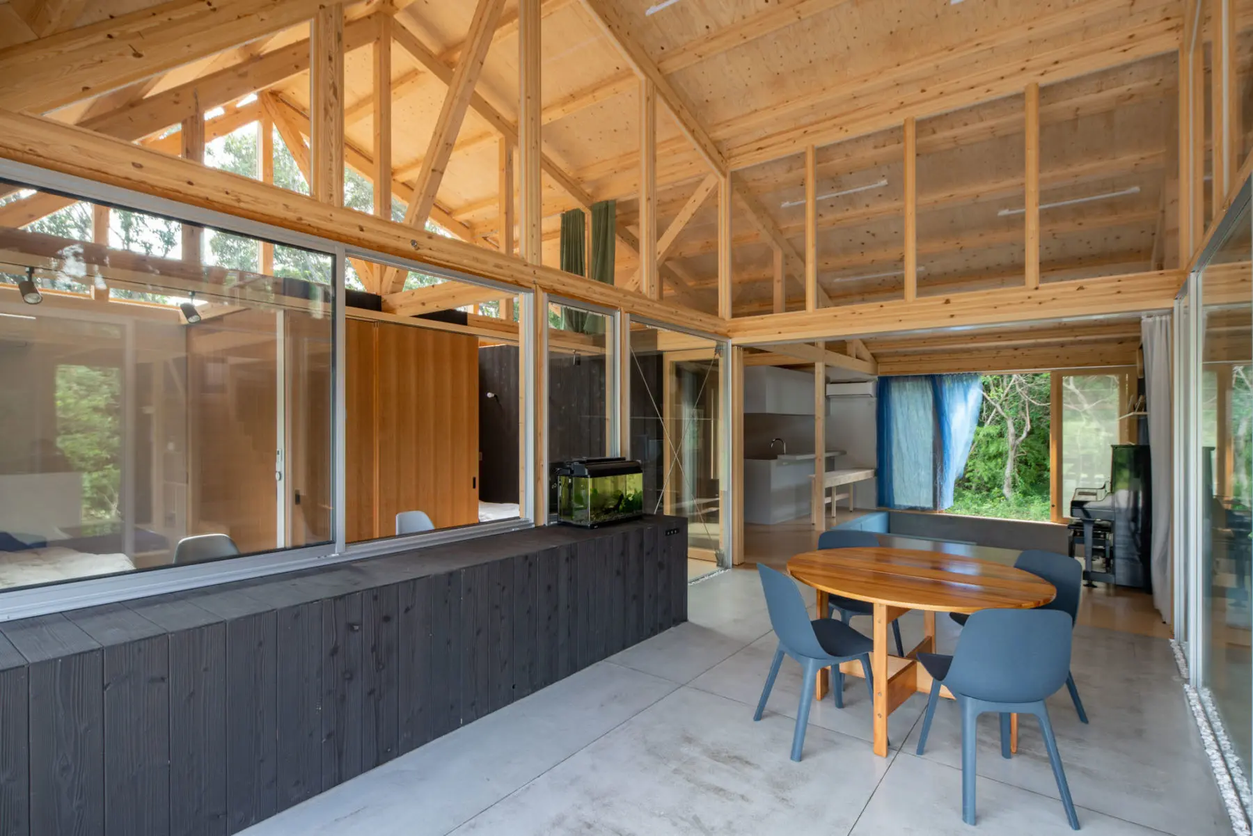 さて構造という言葉には、耐震構造のような、全体を形づくっている種々の材料による各部分の組み合わせや仕組みと、社会構造や物質の構造などの、様々な要素が相互に関連しあって作り出されている総体やその相互関係を示す意味もある。志摩の家は、後者の構造を作り出した。もちろん木造軸組構法の構造を用い、構造体である柱梁が室内に見えているのだが、それは単に表面的なもので、出来事と造作を起点に、床壁屋根ができ、建物の形が見え、行動を促し、そこに住む人や訪れる人の振る舞いがあり、生活のあらゆる要素が混ざり合って、この志摩の家は出来上がっているという点で、建物の骨格以上の構造を作っていると思う。構造といえば架構の美しさや新しさが注目されがちだが、そうではない捉え方を考えたときに造作から生み出される構造に行き着いた。それは細胞が集まって生物ができているように、各々独立したものでありながら一体となる物を作り出している、生きた構造だ。用途は構造に寄り添って導かれる。構造にもなりうる造作のまとまりが、建築になることに気づいた。