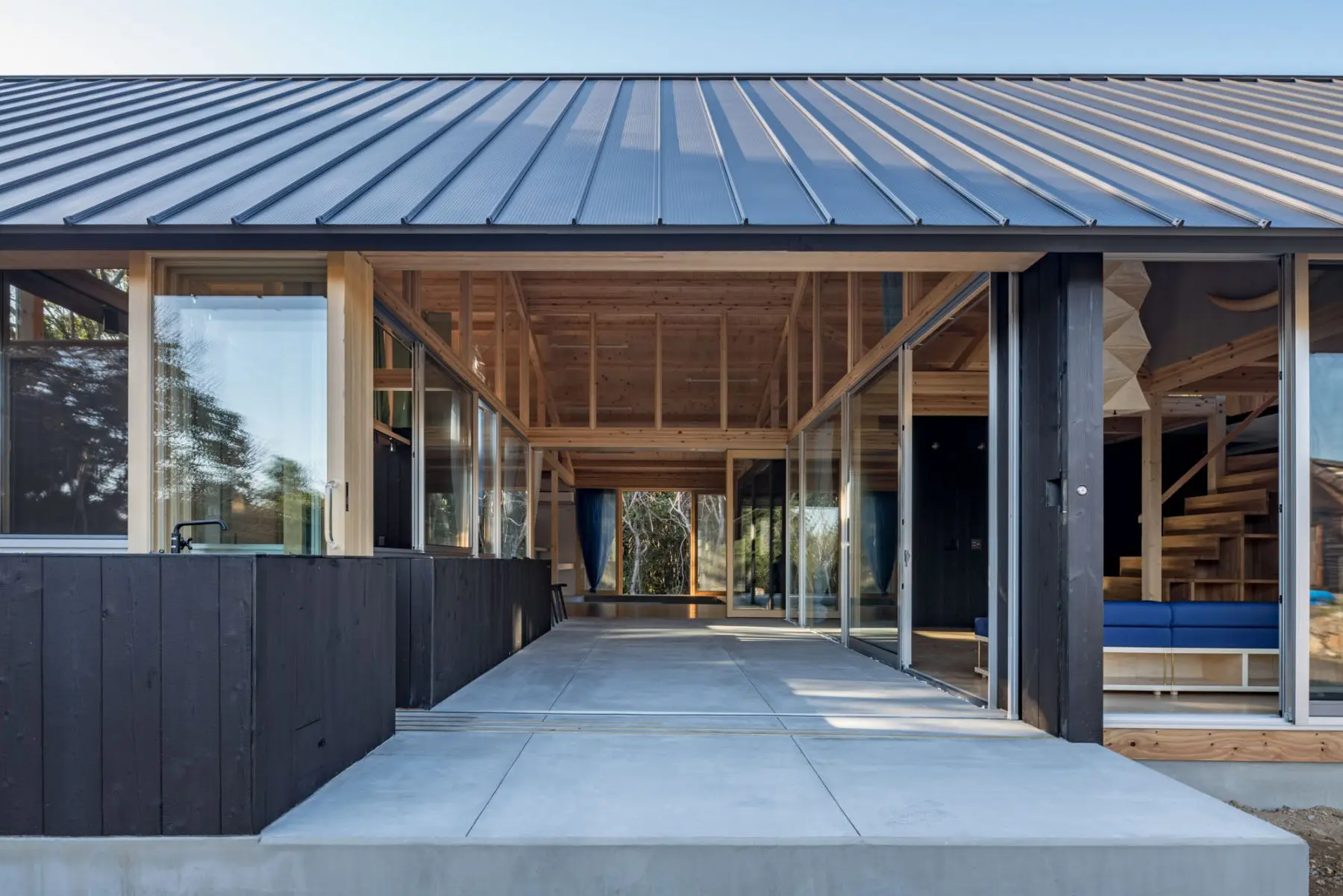 三重県志摩市のリアス式海岸に囲まれた国立公園内、手付かずの自然が広がる森の入口に敷地はある。施主は若い夫婦で家族は4人に増える予定だ。自称志摩の観光大使のご主人がたくさんの人を招き、自然の空気を感じながら志摩を楽しみ好きになってもらう場所が求められた。