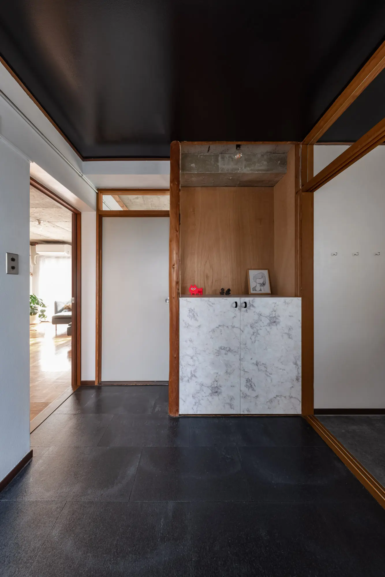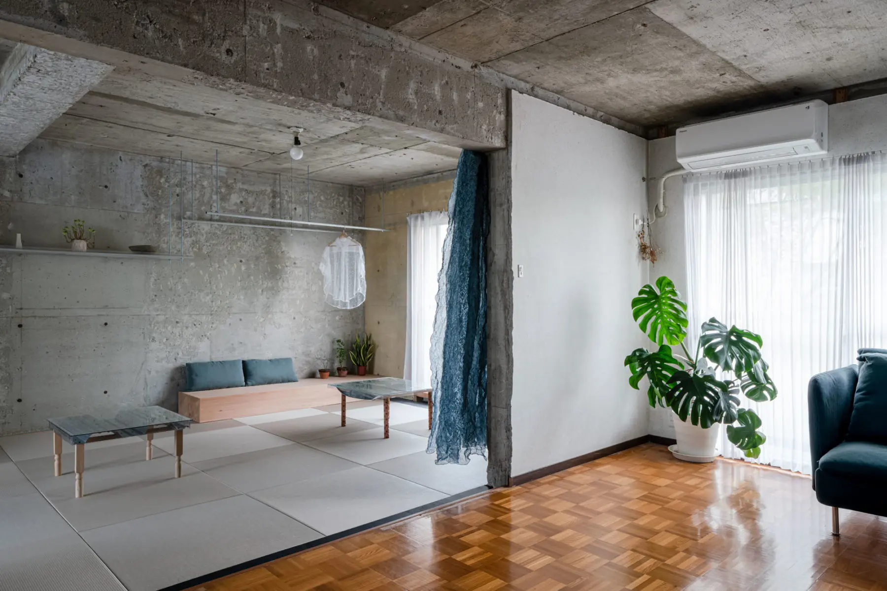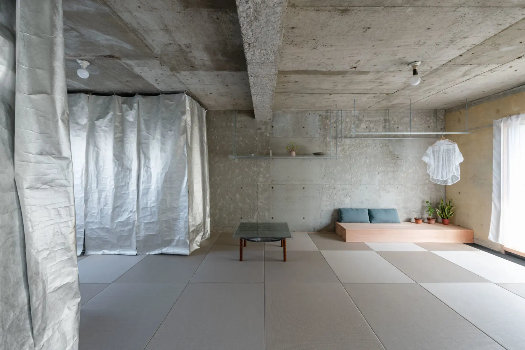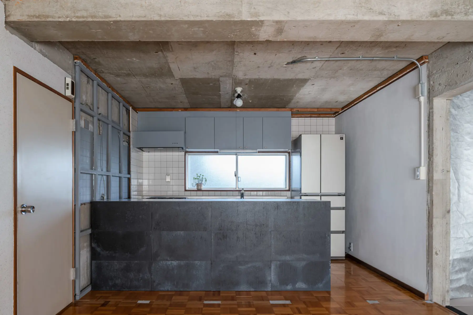 築49年のRC造賃貸マンション一室を改修した自邸である。賃貸サイトで物件を探していた時に目を疑った。間取り図に、「洋室」と「LDK」と「コンクリート打ちっぱなし」の3室が記されていたのだ。しかも打ちっぱなし部分には丁寧にハッチも掛けられていた。LDKはあるから、はて、この打ちっぱなしの部屋の用途は何だろう?提供写真でも、天井、壁はもちろんのこと、床もはつったままのRCむき出しだった。前の住人は一体ここでどのように暮らしていたかの疑問だが、元々は和室が二間あったようである。地方の賃貸では珍しく、改修自由かつ原状復帰不要の条件で、内見し即決した。聞けば、数千件の登録の中でもこの条件の物件はここだけだったそうだ。