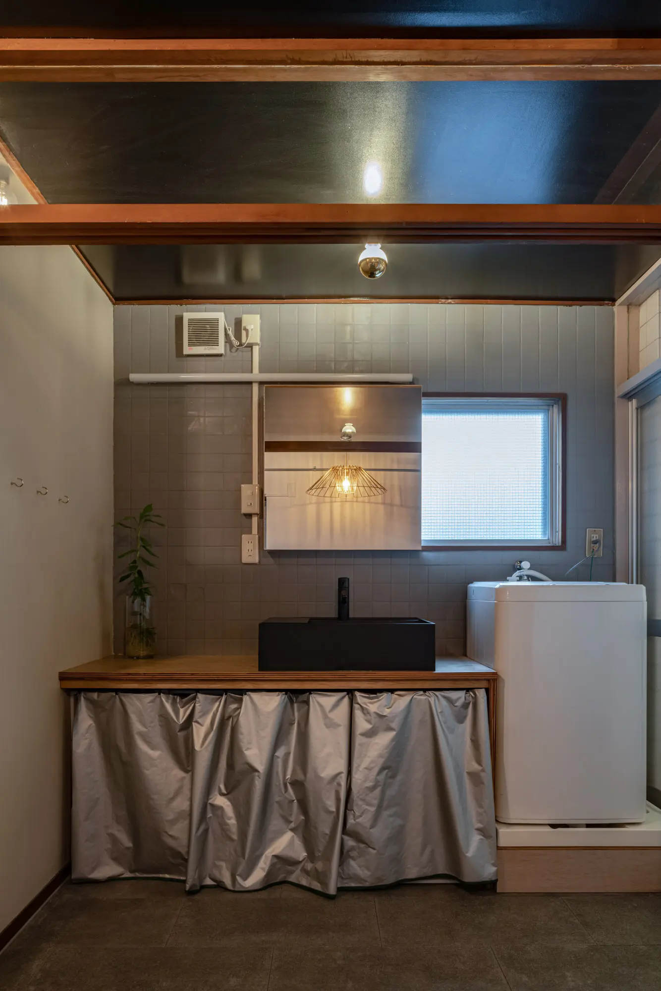 事務所時代の名残であったカーペットから畳へ改め、大勢の来客にも対応できる床座とした。天井には天井ボードを吊るための雌ネジがあることに気づき、試しにボルトを入れてみるとぴったりだった。いくつか追加してもらい、LGSで違棚をつくった。玄関には床の間様の下足入、キッチンはパーティー対応のカウンターなど、住みながら小さな改修を行った。今はここを、事務所主催のイベント会場として活用している。