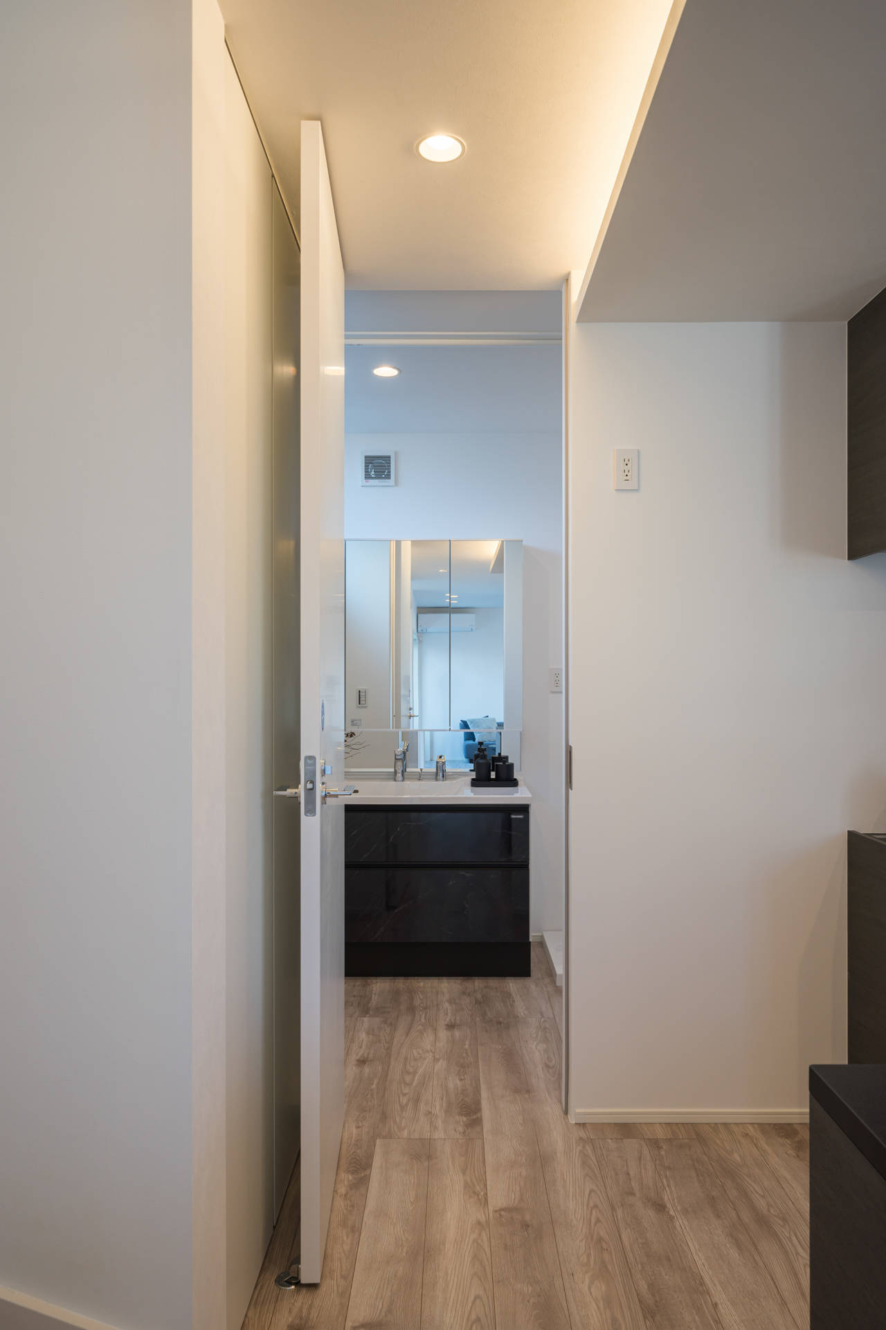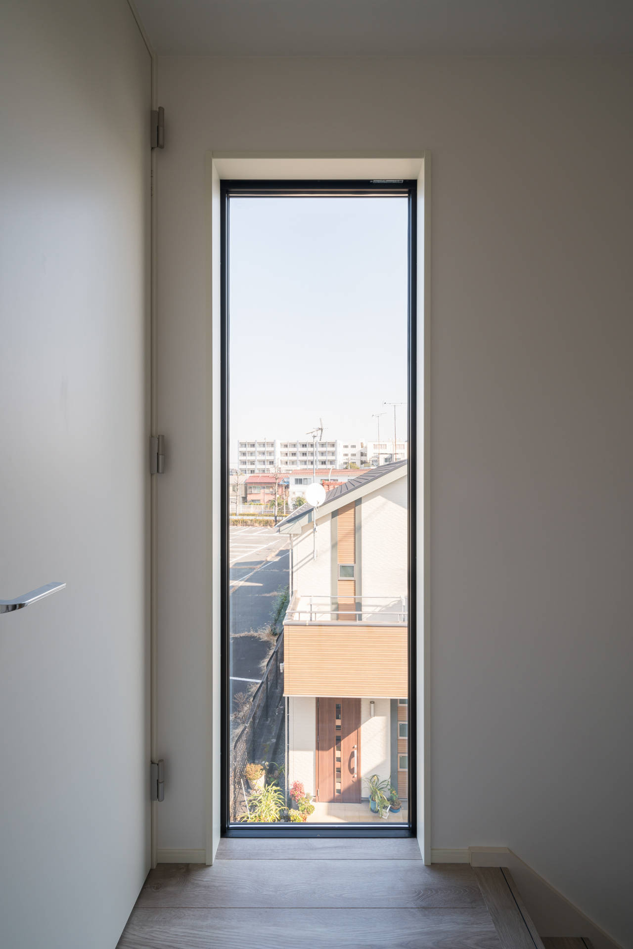 敷地は南北に長く3方向が開けた環境にあり、設計方針として、1階は人通りのある通りに面していることからLDKと水回りを2階に計画することとしました。2階にLDKを計画することで1階には主寝室とワークスペース、3階には3つの個室を計画し、メインの生活スペースからは1層の移動で各個室へのアプローチが可能になります。またLDKに開放感を生むために一般部の天井高さは2.6mとし、各部の開口部を大きく開くことで視線の抜けと高さがある開放感のあるLDKを実現しました。細かな部分ではLDKの内部建具にフルハイトの建具を採用することで空間をすっきりと大きく体感できるように工夫しています。