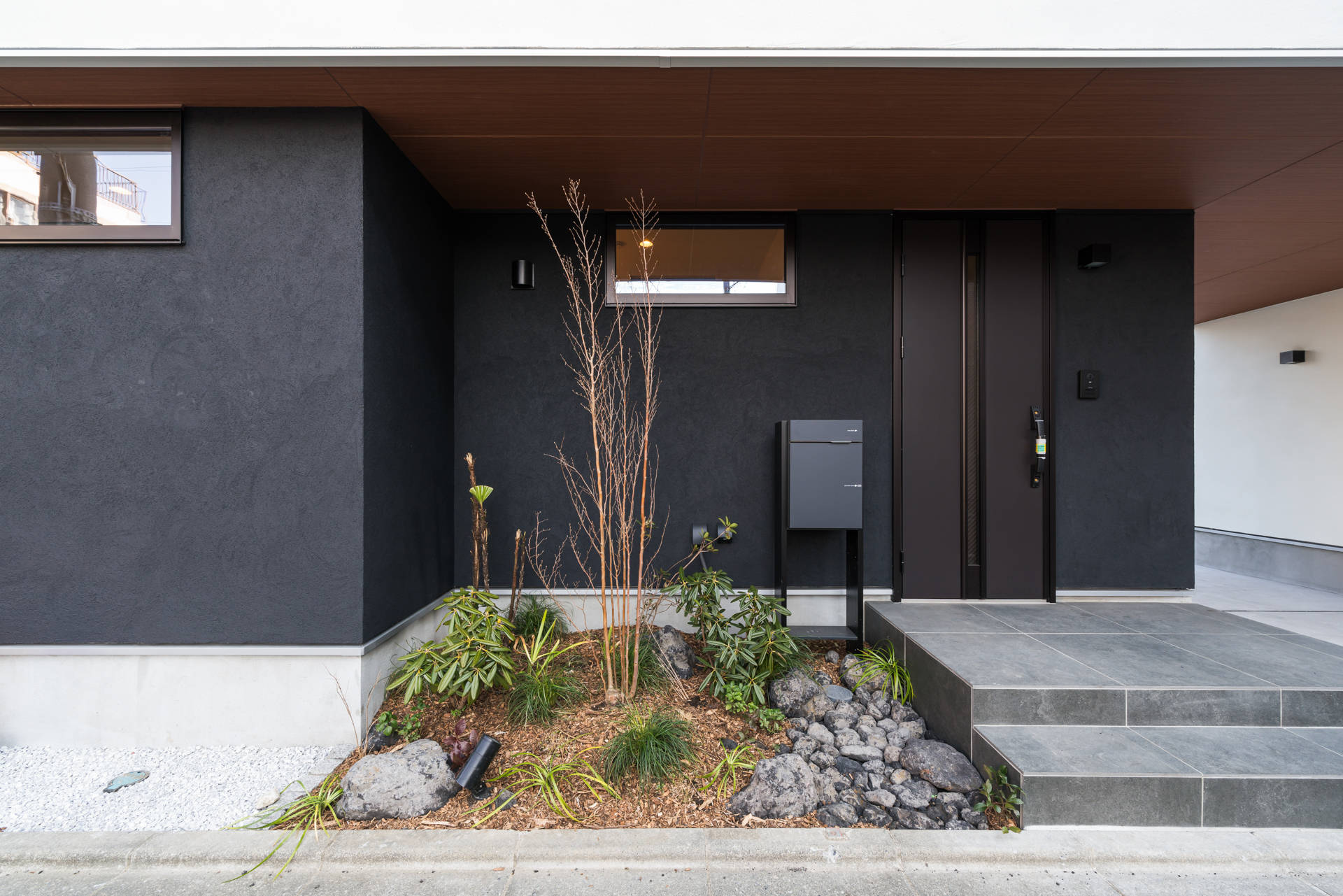 ファサードデザインでは西面の窓のラインをそろえることで端正な佇まいとなるように配慮し、外壁は白と黒のコントラストをつけることで上部のボリュームの浮遊感を強調するデザインとしています。外構デザインも玄関横に自然の中の地形の起伏を表現し、シンボルツリーのヒメシャラと多様な低木、下草、景石を配置することで豊かな出迎えのスペースを準備しました。